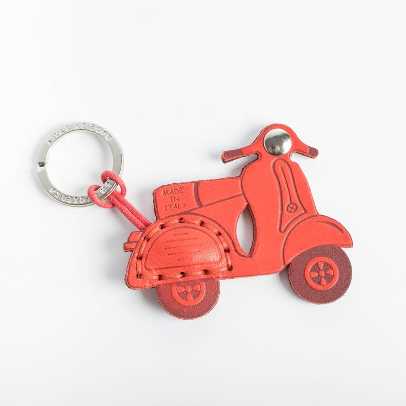 Portachiavi realizzato a mano in vacchetta di colore rosso. Anello in acciaio.
