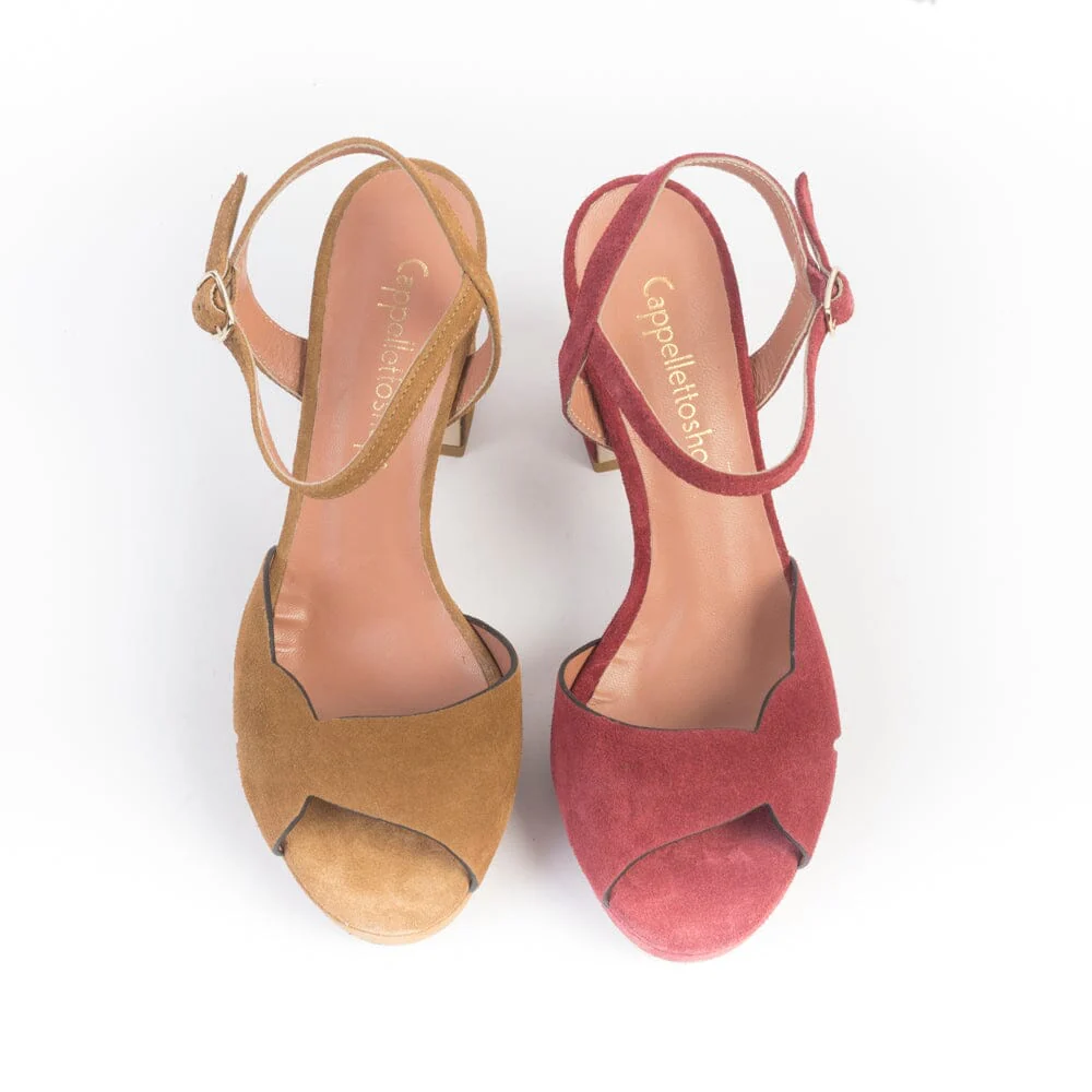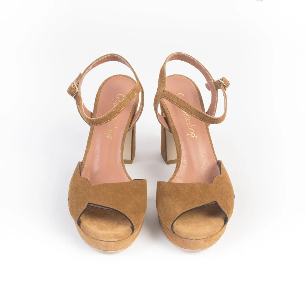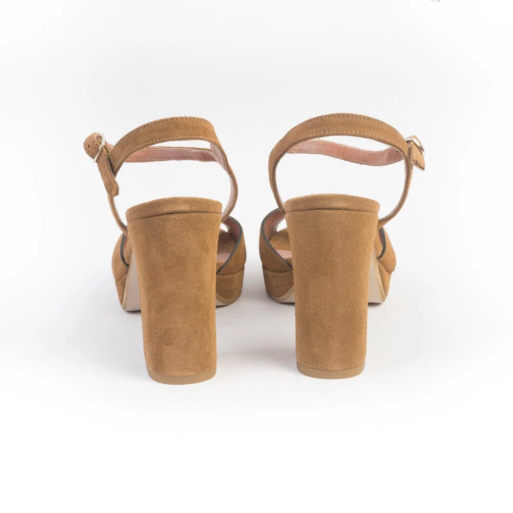 Sandali realizzati per CappellettoShop in camoscio di colore cuoio. Fascia asimmetrica sull’avampiede con cinturino alla caviglia regolabile. Tacco colonna di altezza 9 cm circa con plateau di 1,5 cm, per una calzata più confortevole. Sottopiede in pelle. Suola antiscivolo. Calzata regolare.