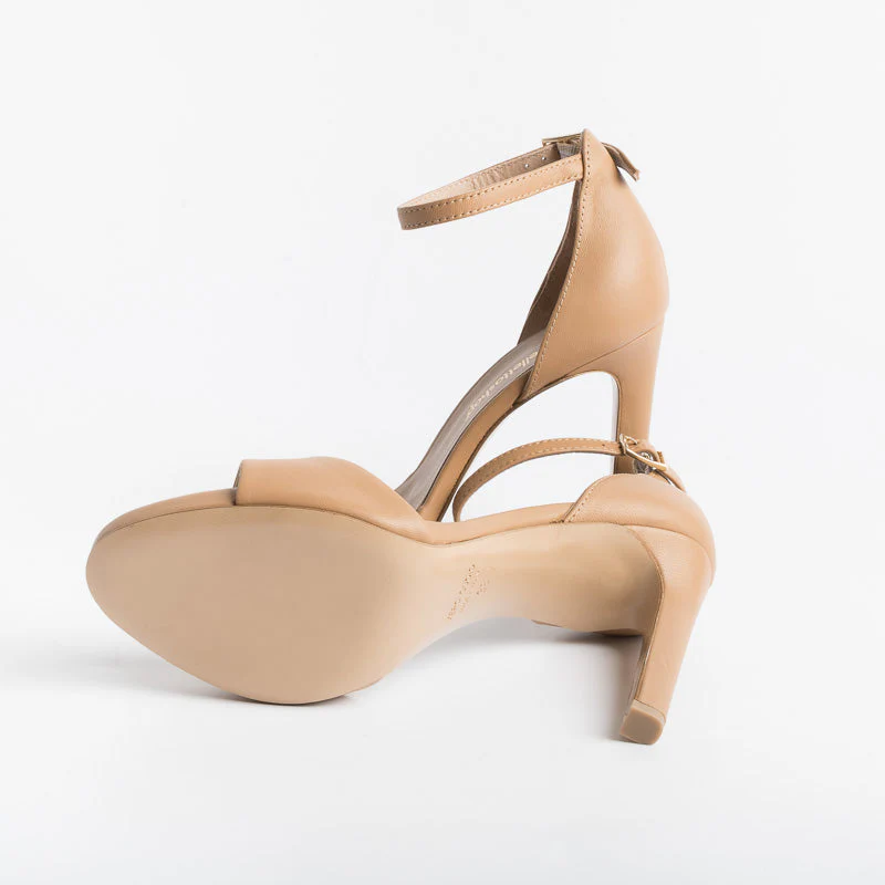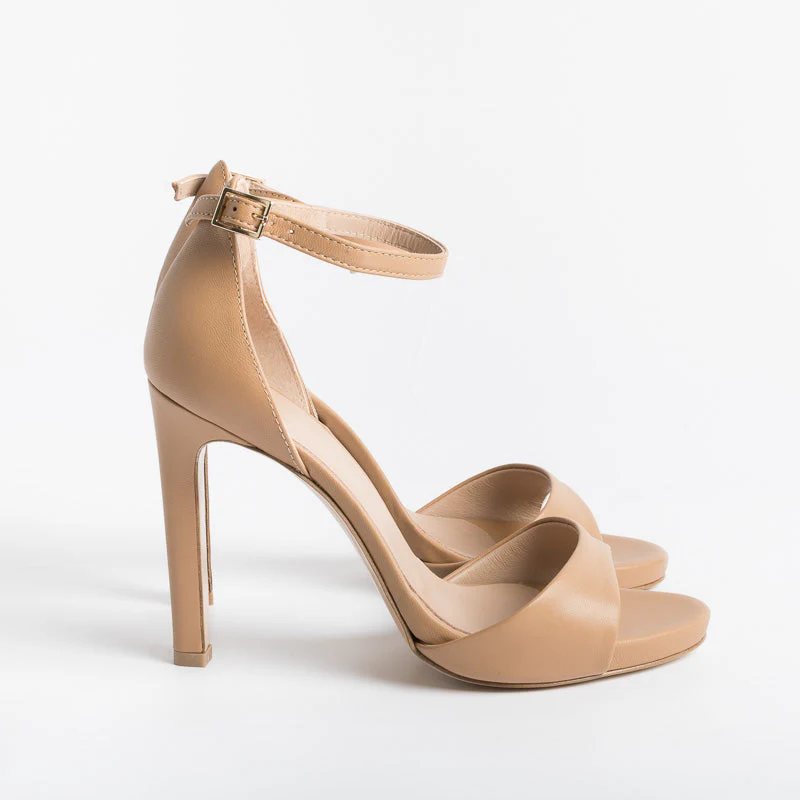 Sandali a fascia, realizzati in pelle di vitello di colore cuoio. Sottopiede in pelle. Chiusura con cinturino regolabile alla caviglia. Tacco stiletto 11 cm e plateau di 1 cm. Suola in cuoio. Calzata regolare.