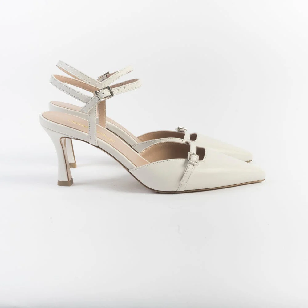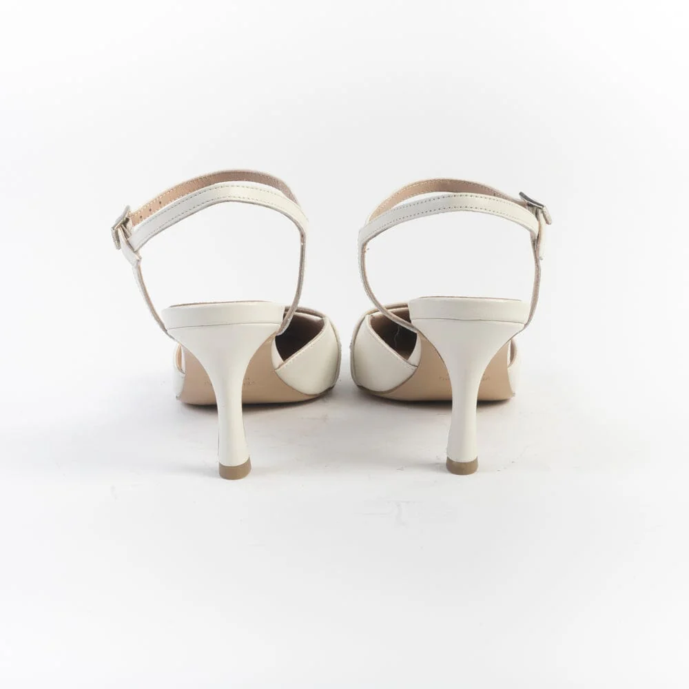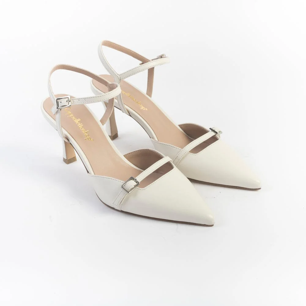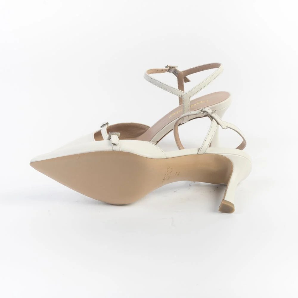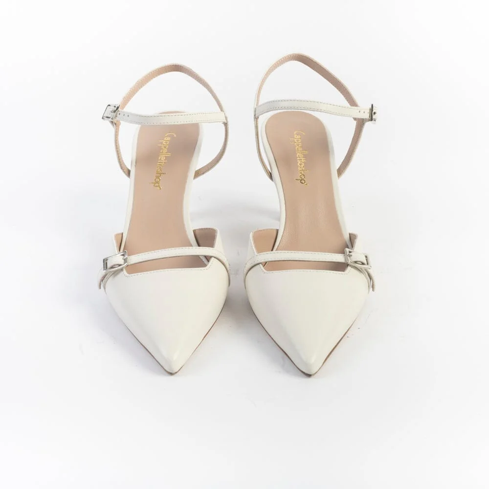 Sandali realizzati per CappellettoShop in morbida nappa di colore bianco. Chiusura con cinturino regolabile alla caviglia. Fodera interna in pelle. Punta affusolata; decorazione con cinturino sull’avampiede. Tacco di altezza 8.5 cm, suola in cuoio.