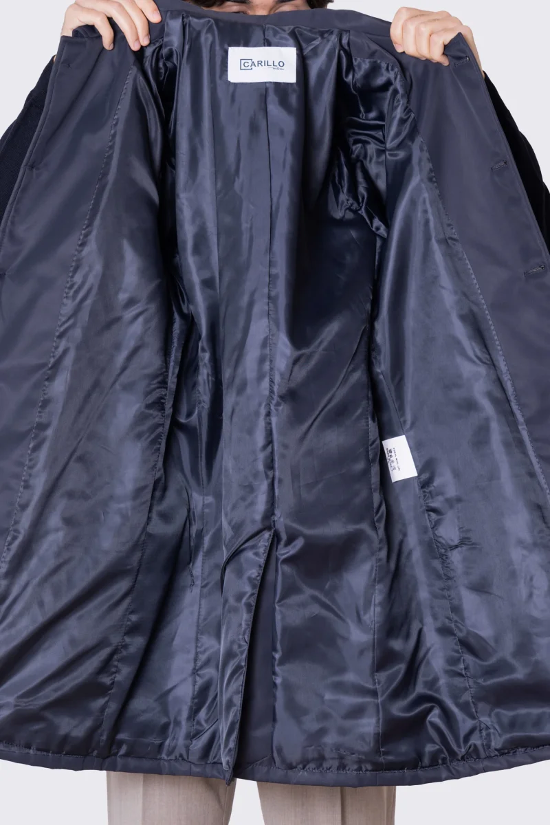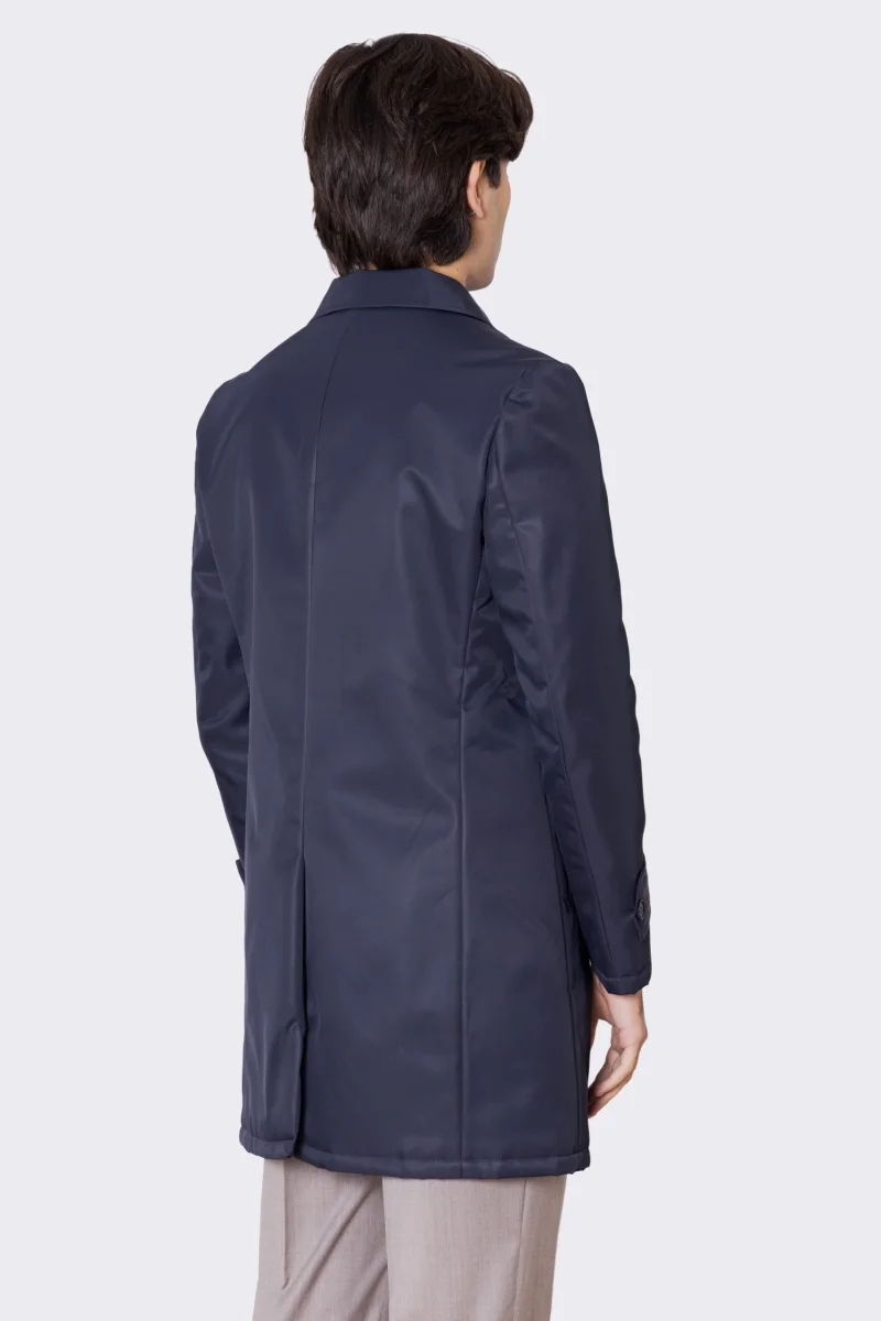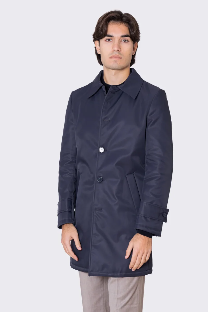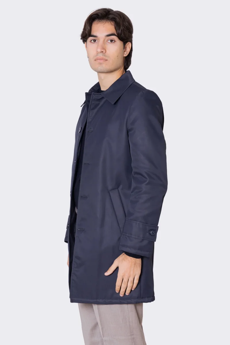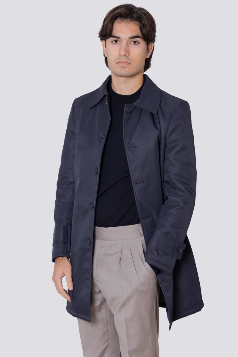 Cappotto blu notte in nylon monopetto con collo camicia tasche a filo e fascia sui polsi con bottone spacco singolo sul retro