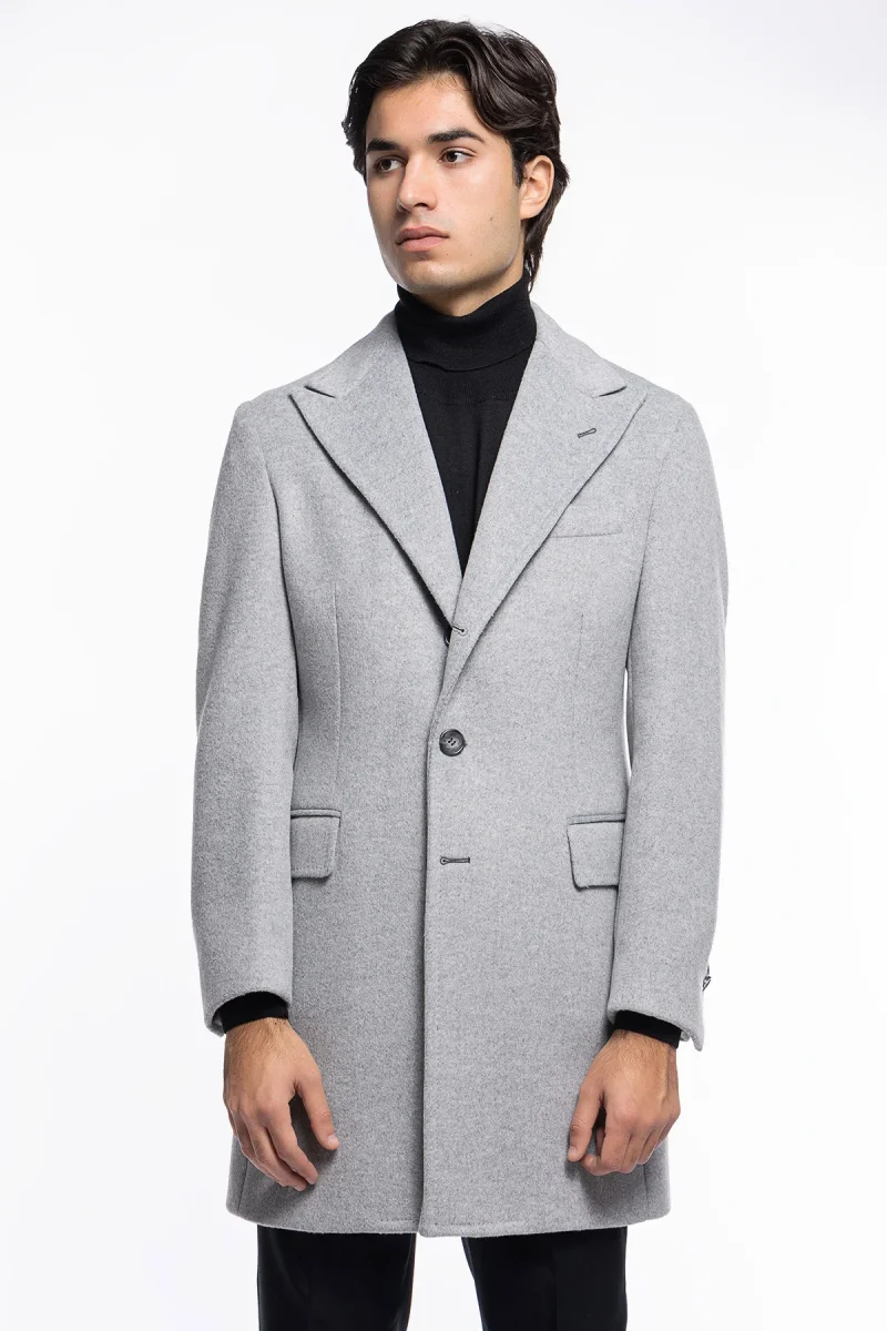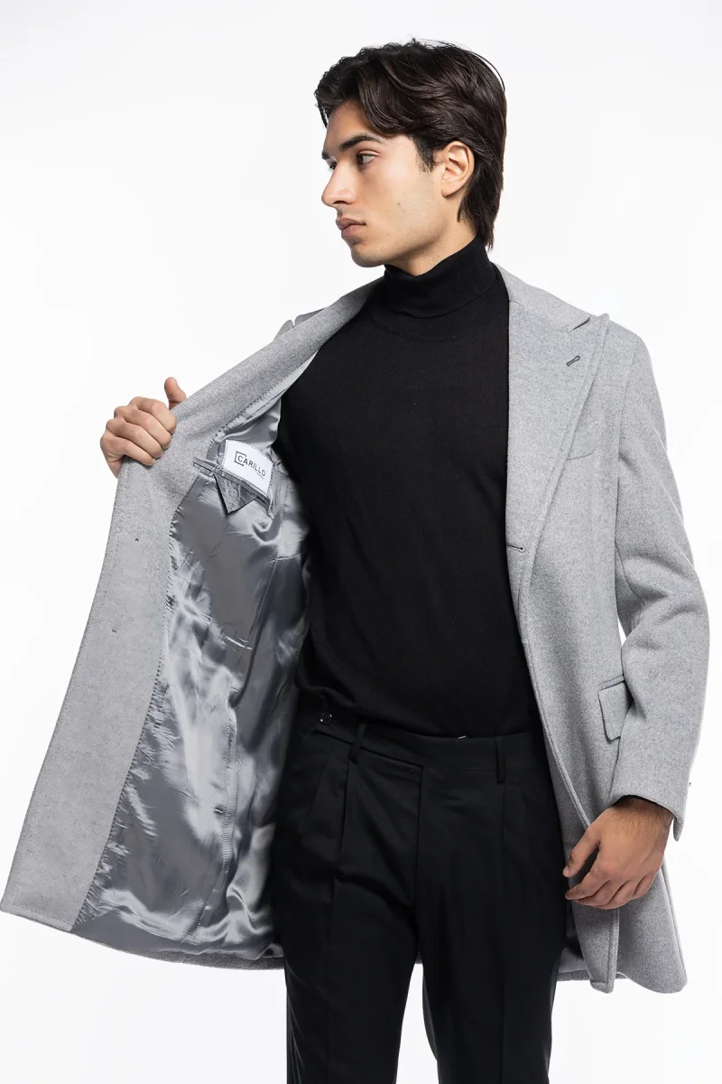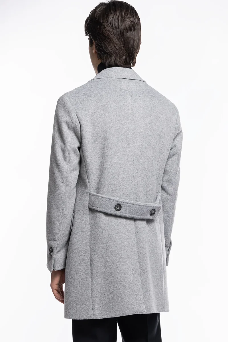 Cappotto uomo grigio chiaro monopetto con martingala sul retro e tasche a filo con pattina