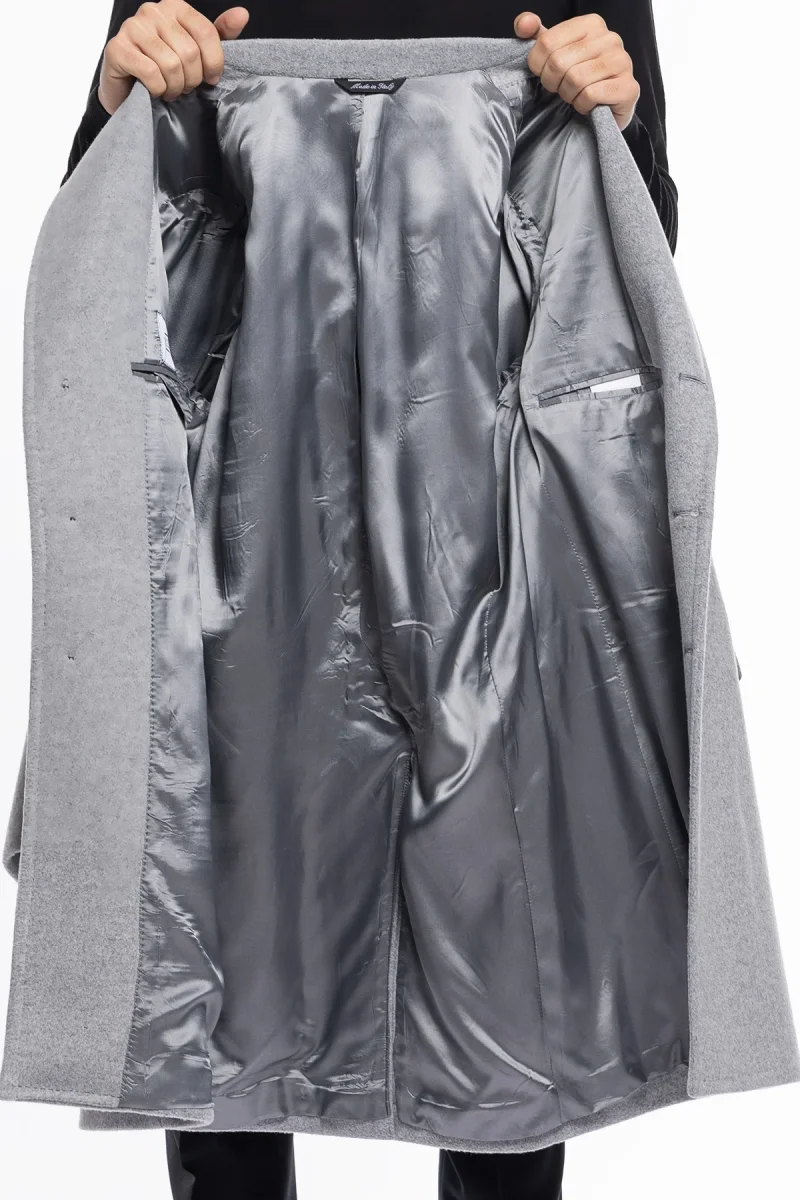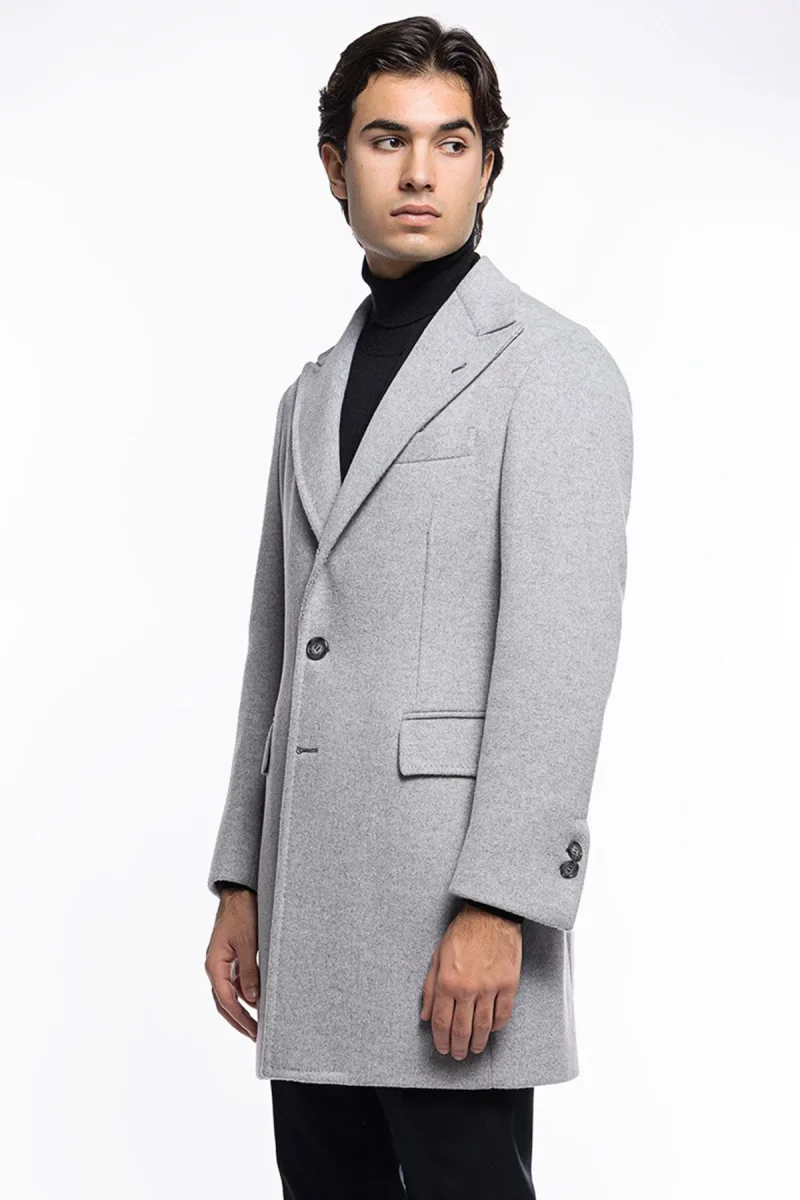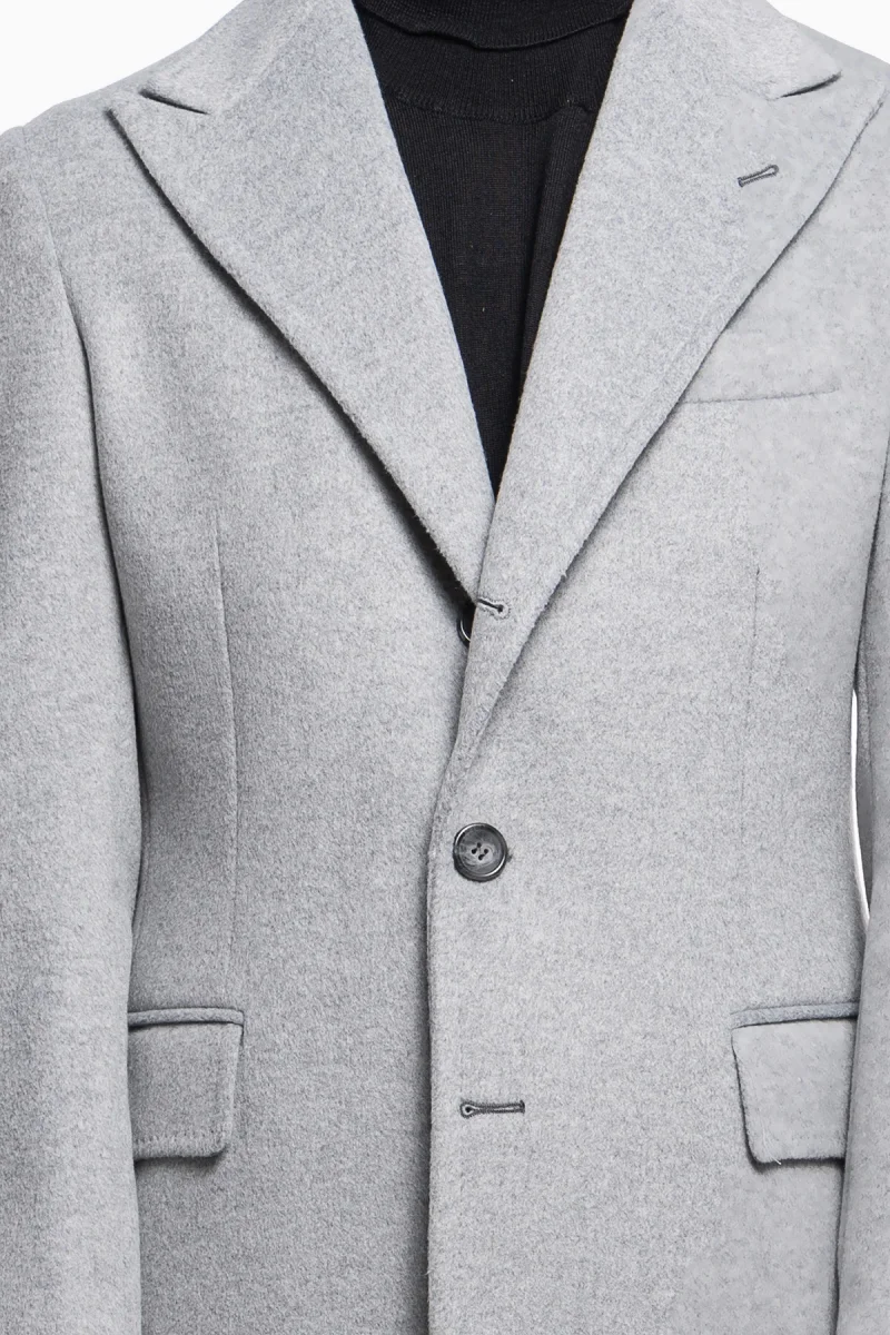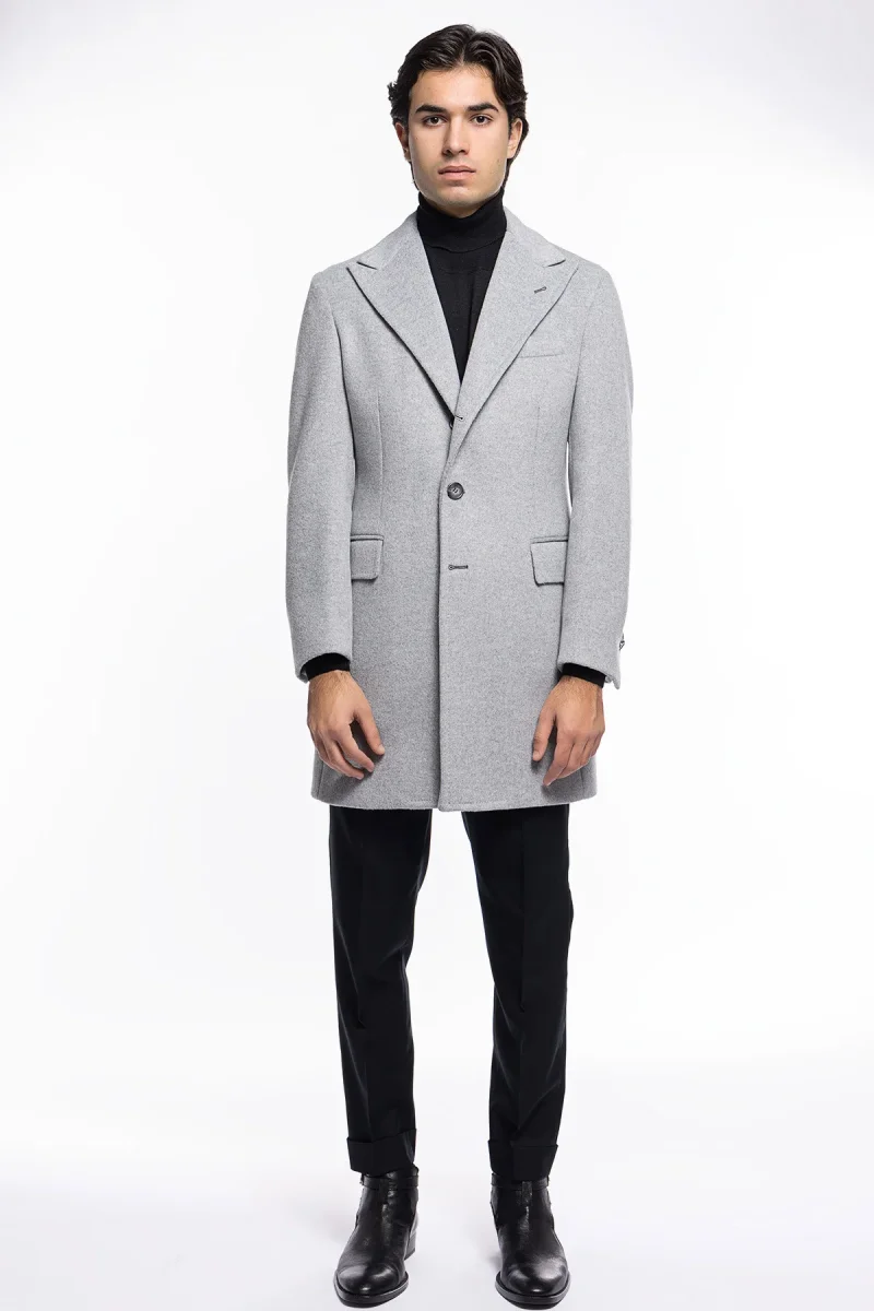 Cappotto uomo grigio chiaro monopetto con martingala sul retro e tasche a filo con pattina