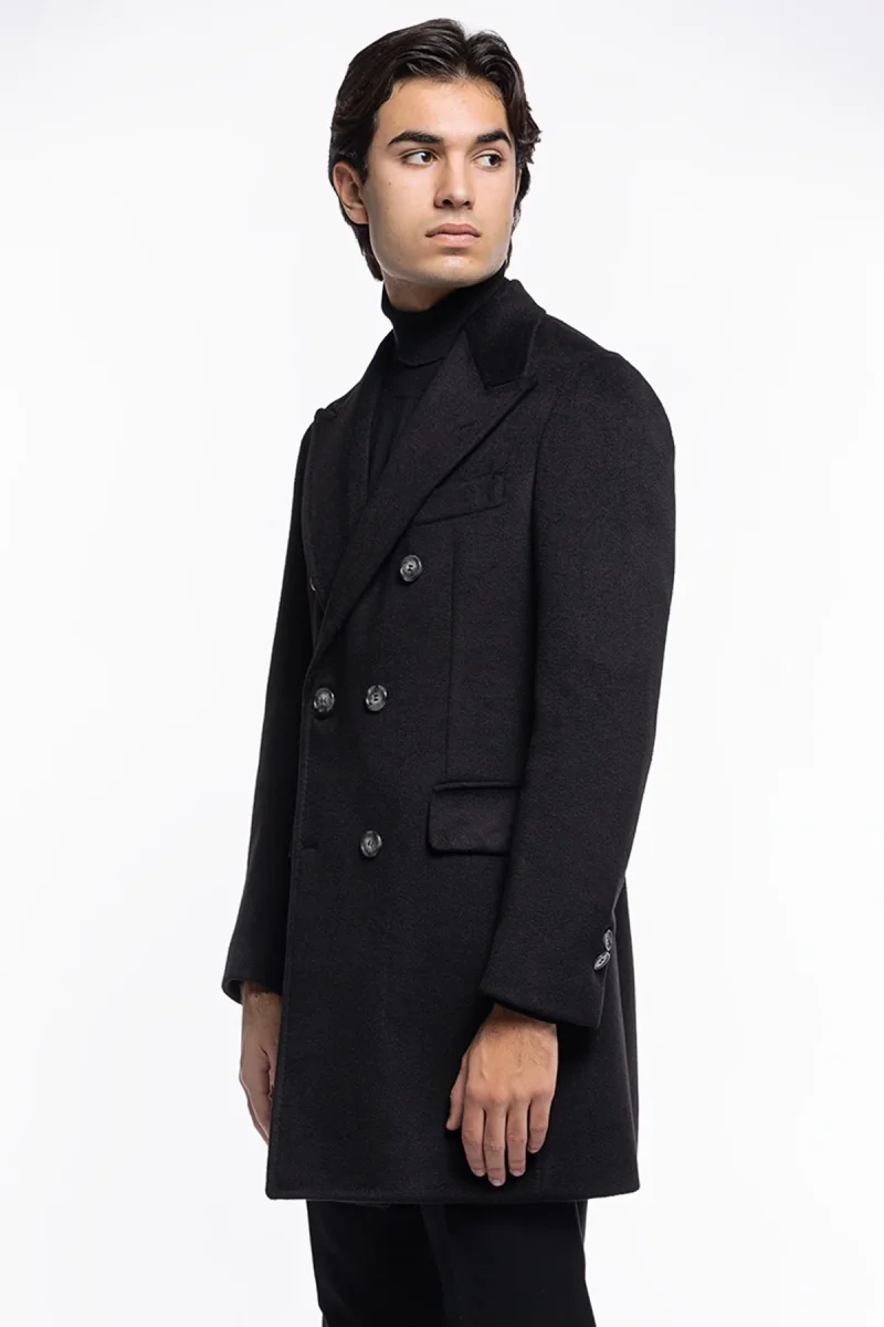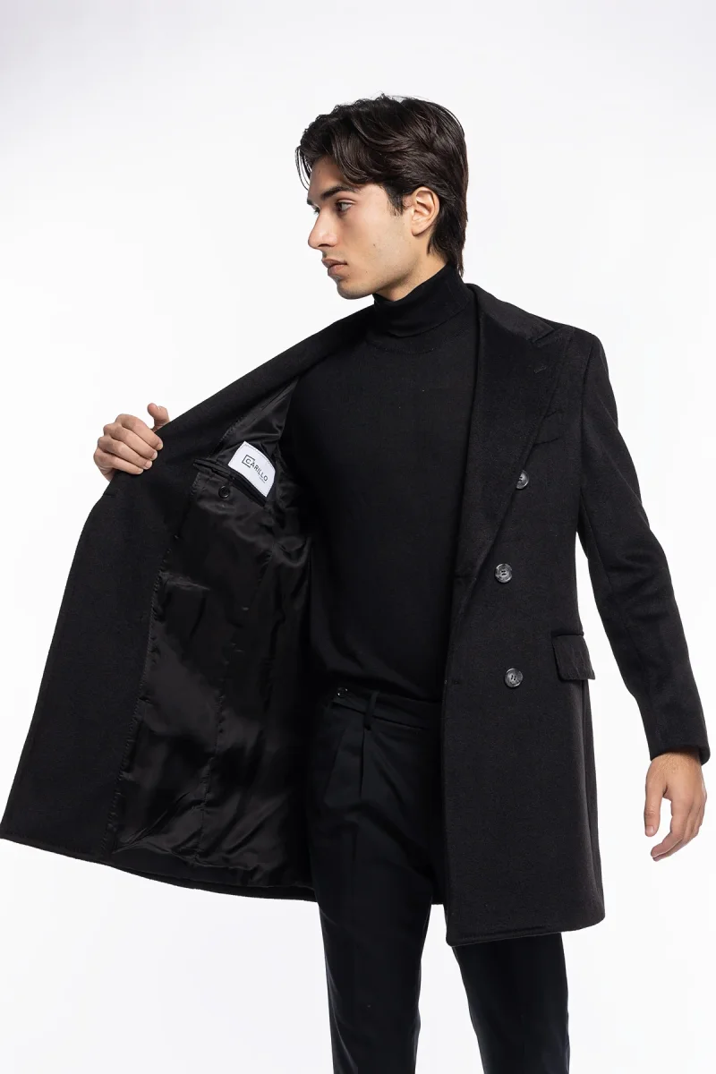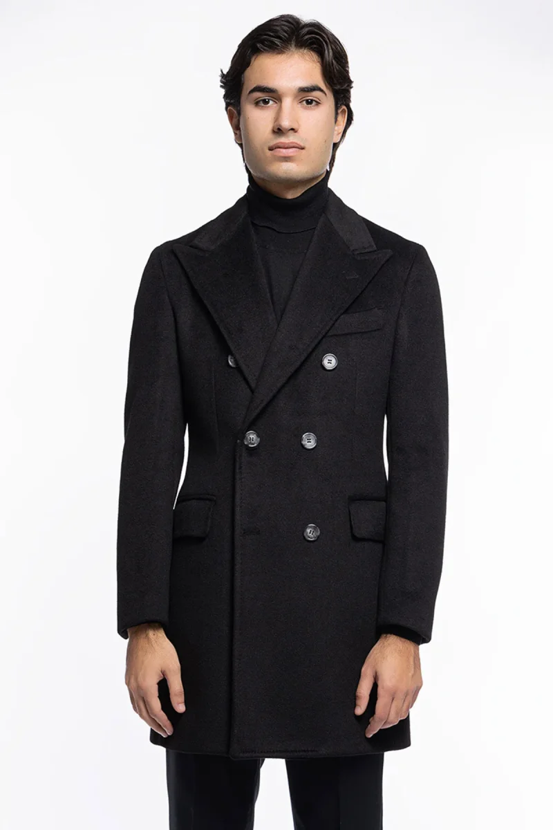 Cappotto uomo nero doppiopetto 6 bottoni con martingala sul retro e polsi con due bottoni