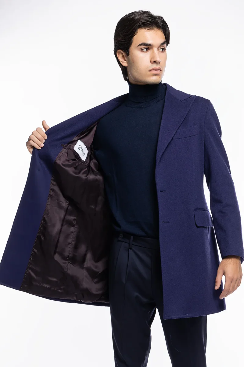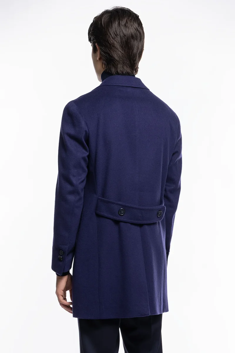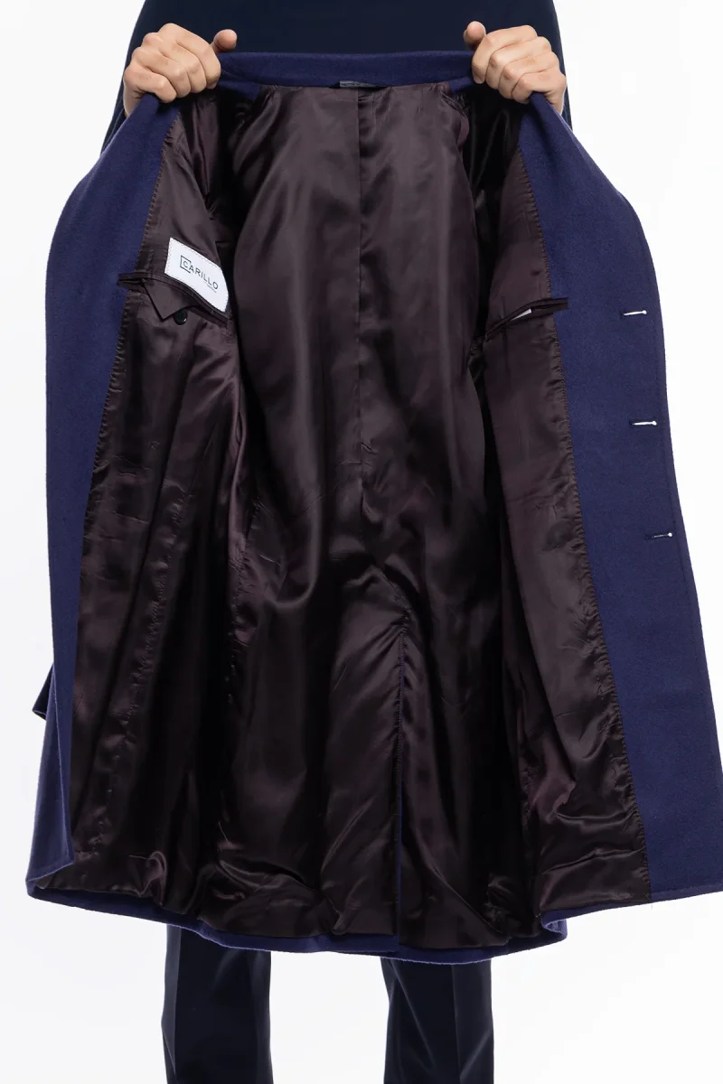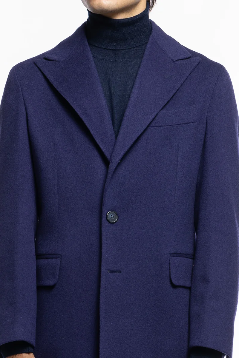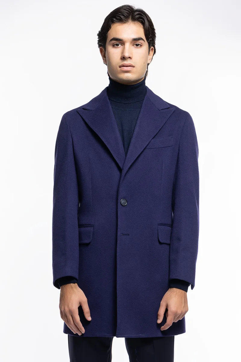 Cappotto uomo royal blu monopetto in lana e cashmere Bristol Tessuti Napoli rever 13cm con martingala