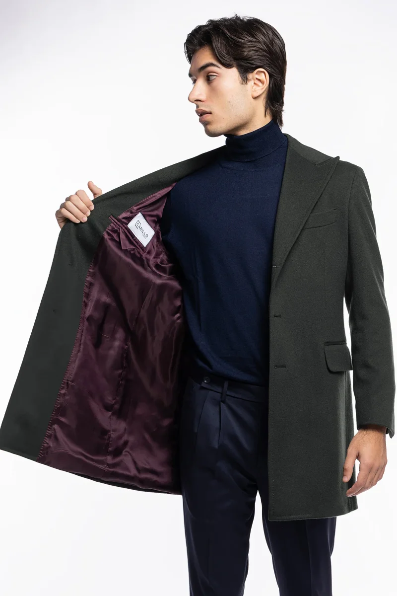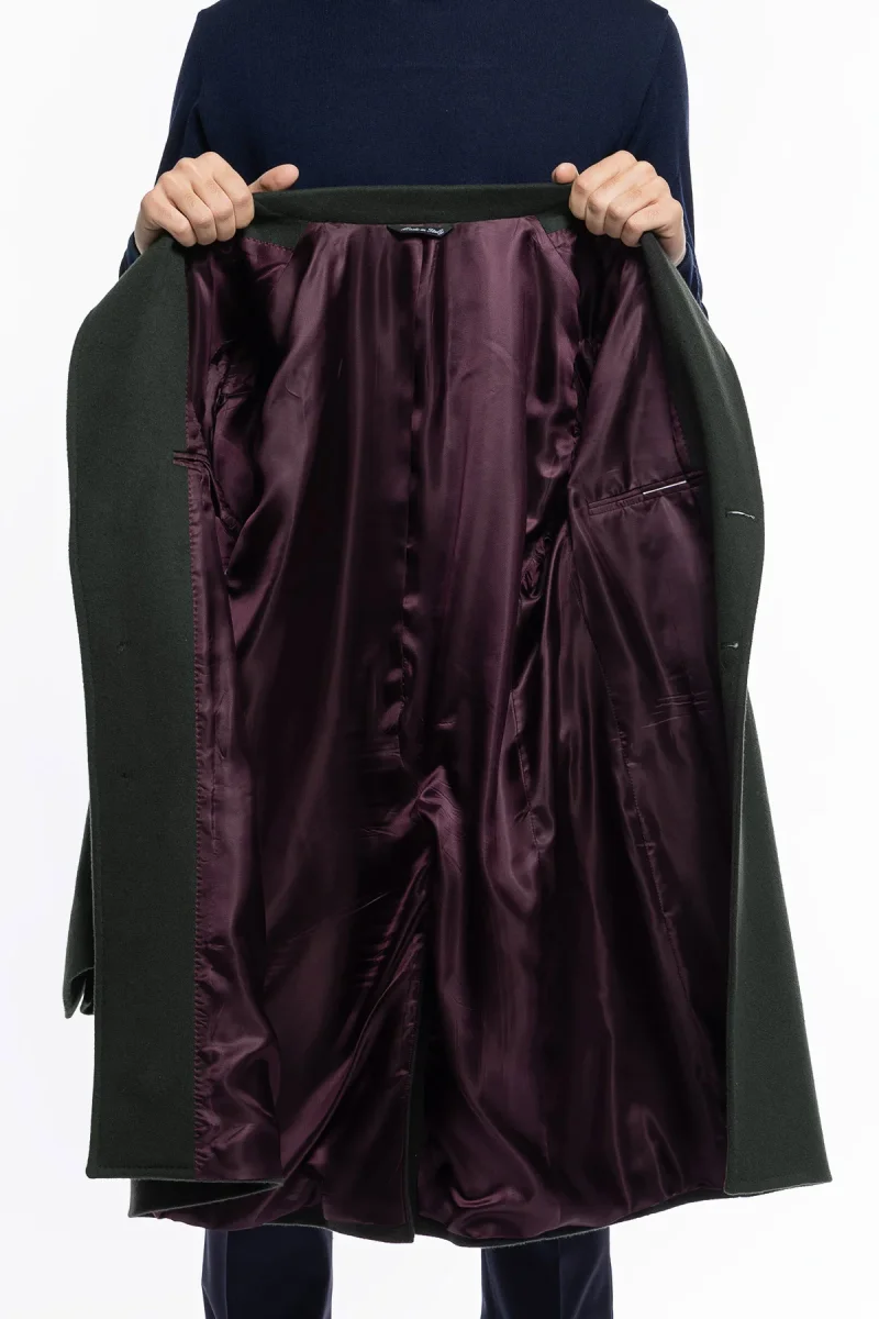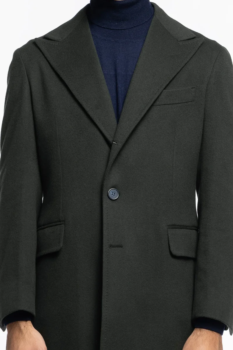 Cappotto uomo verde militare monopetto in lana e cashmere Bristol Tessuti Napoli rever 13cm con martingala