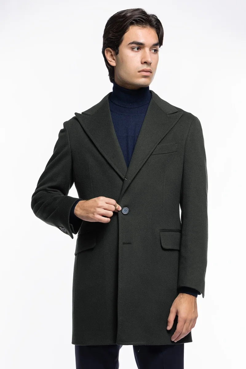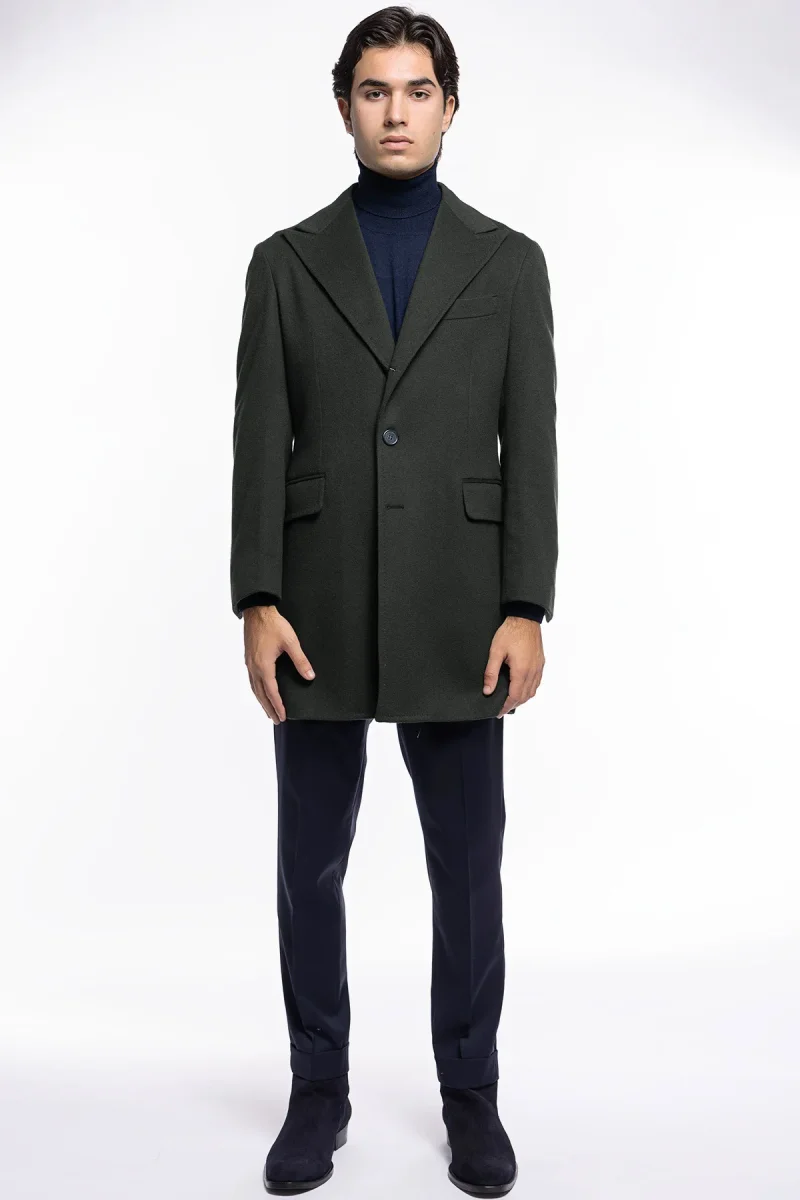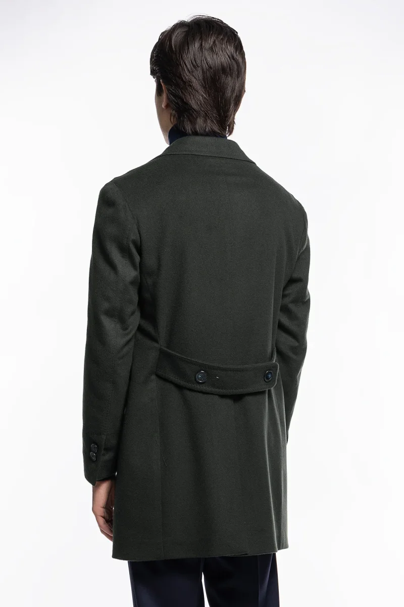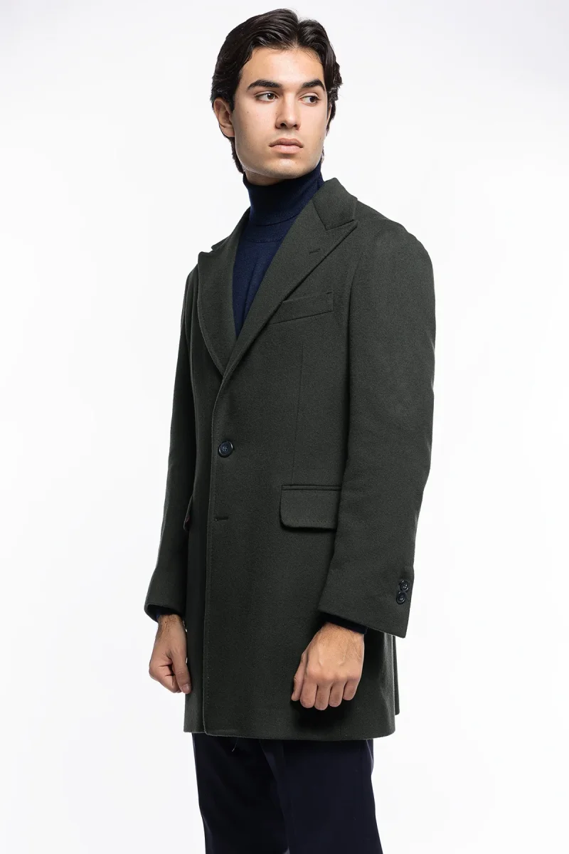 Cappotto uomo verde militare monopetto in lana e cashmere Bristol Tessuti Napoli rever 13cm con martingala