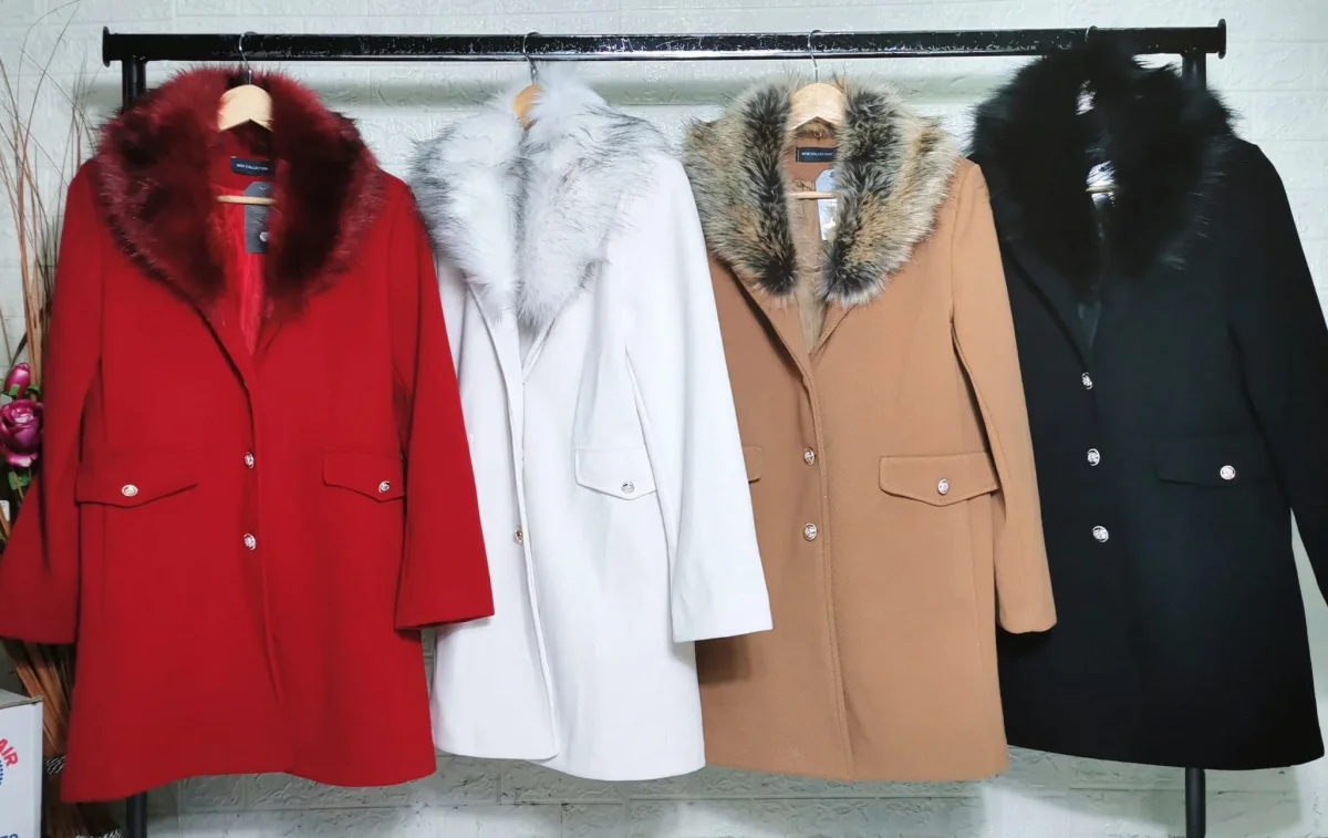 Cappotto con collo in ecopelliccia, chiusura con bottoni e tasche laterali con bottone. Foderato all’interno.