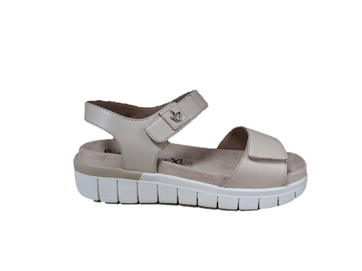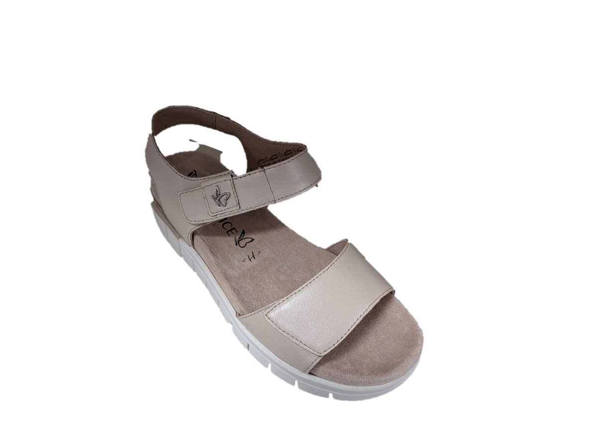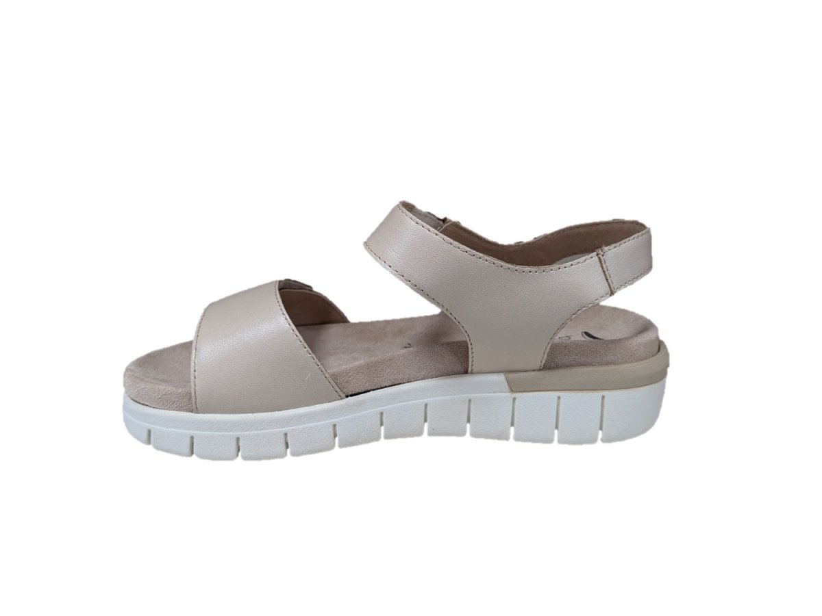 Sandalo in pelle, zeppa di 4,5cm suola in gomma, allacciatura con velcro.