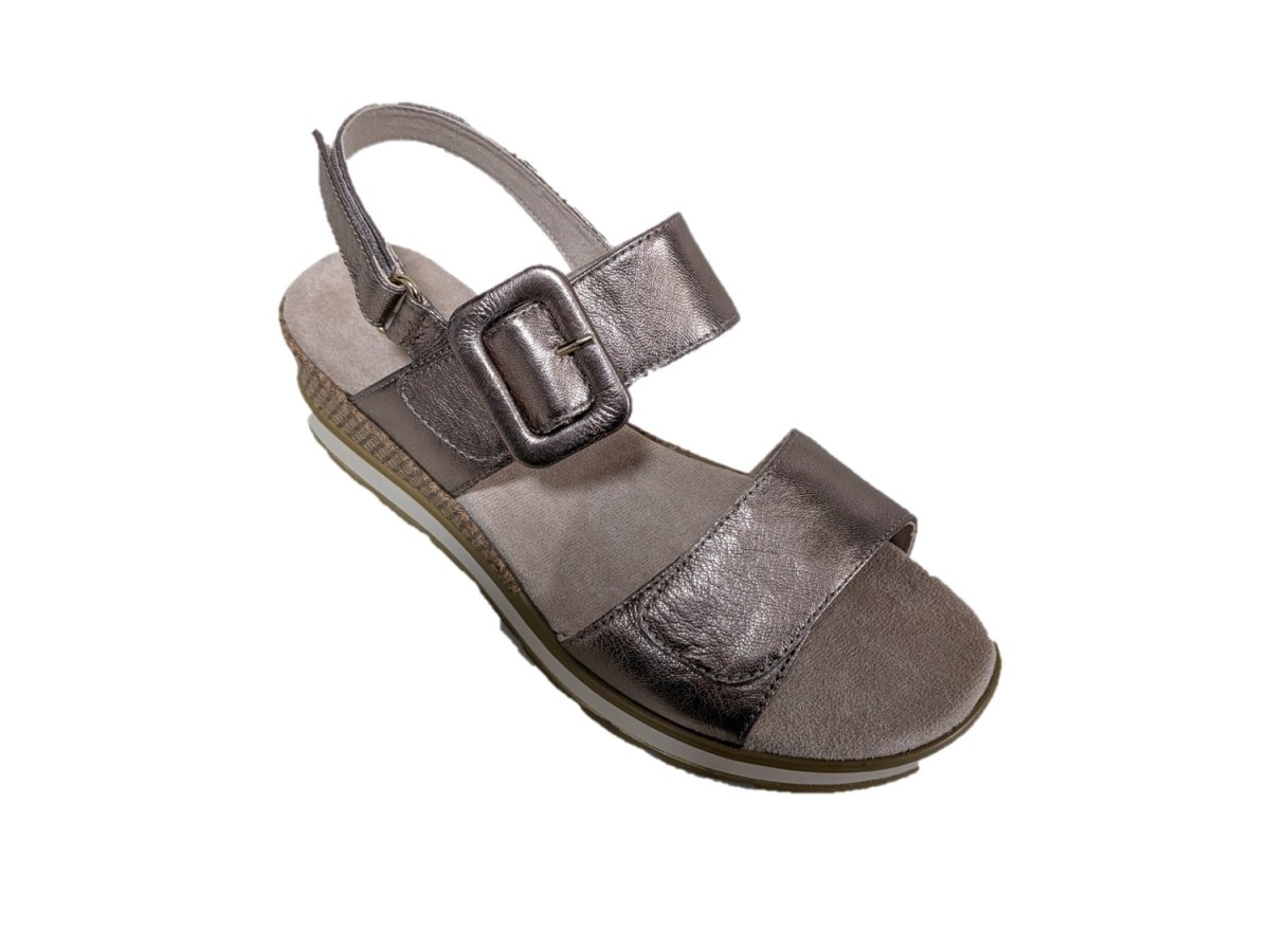 Sandali in pelle colore taupe metallic, zeppa di 5cm, suola in gomma, allacciatura con velcro e fiibbia