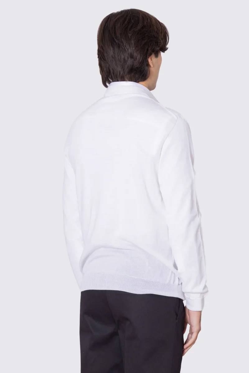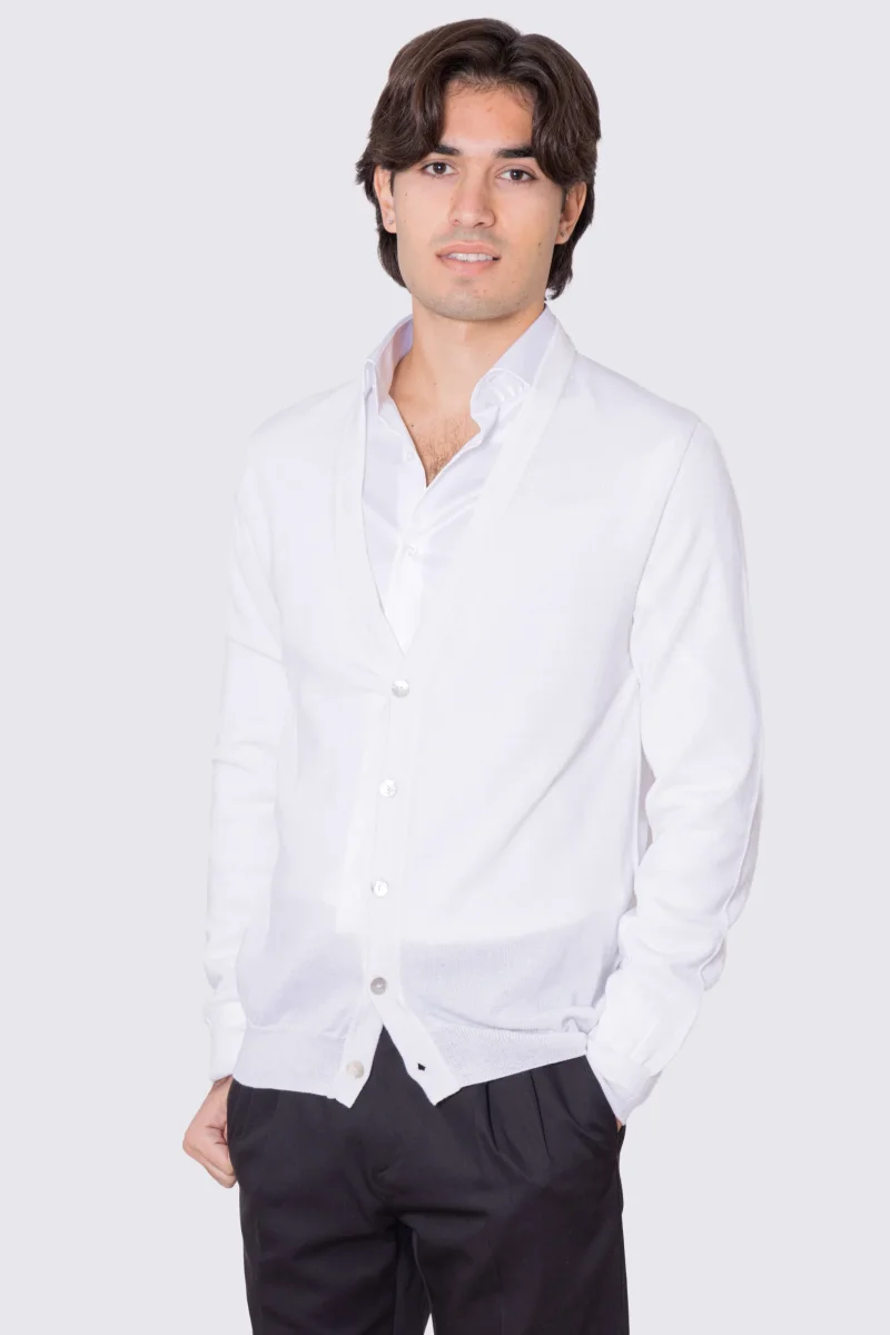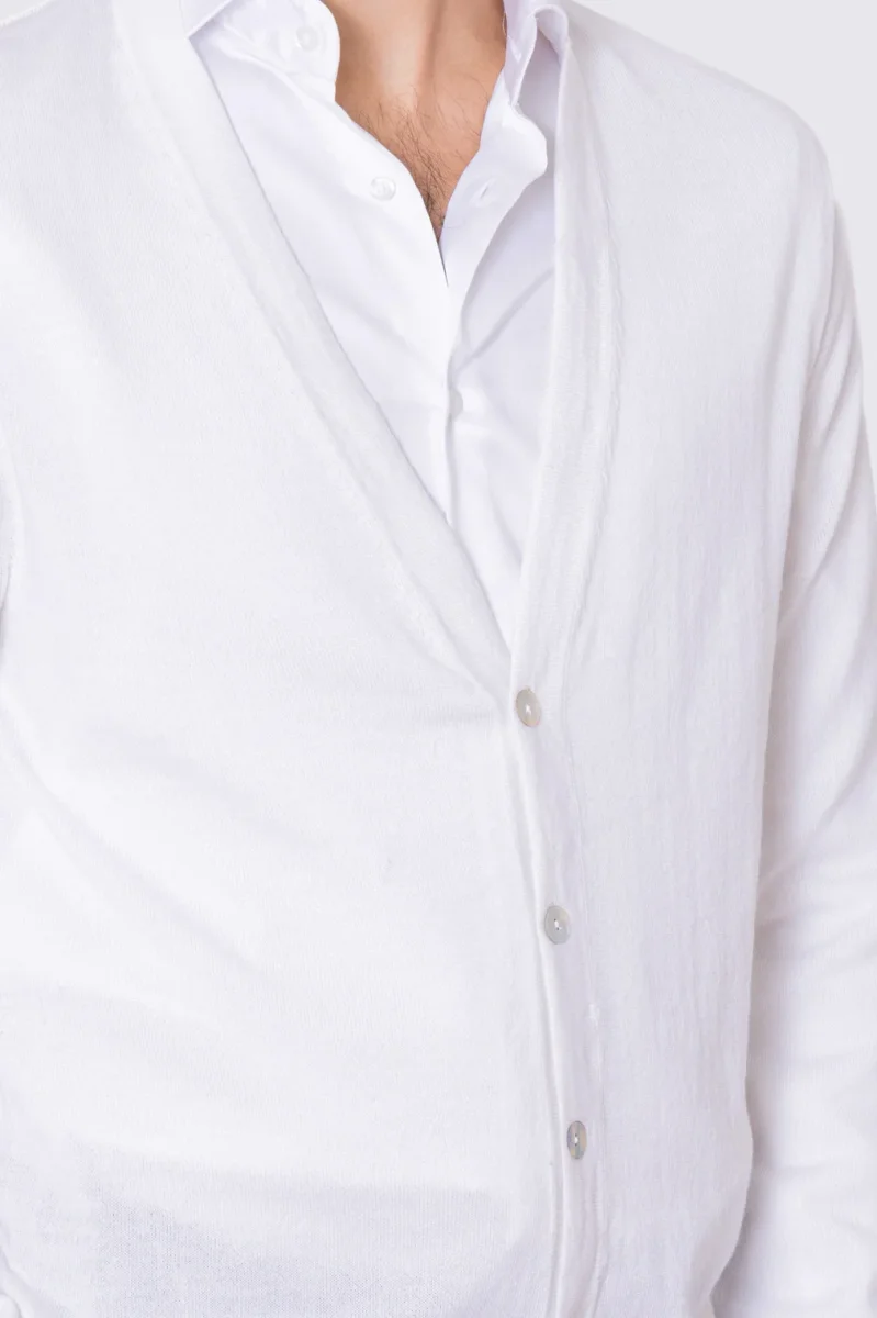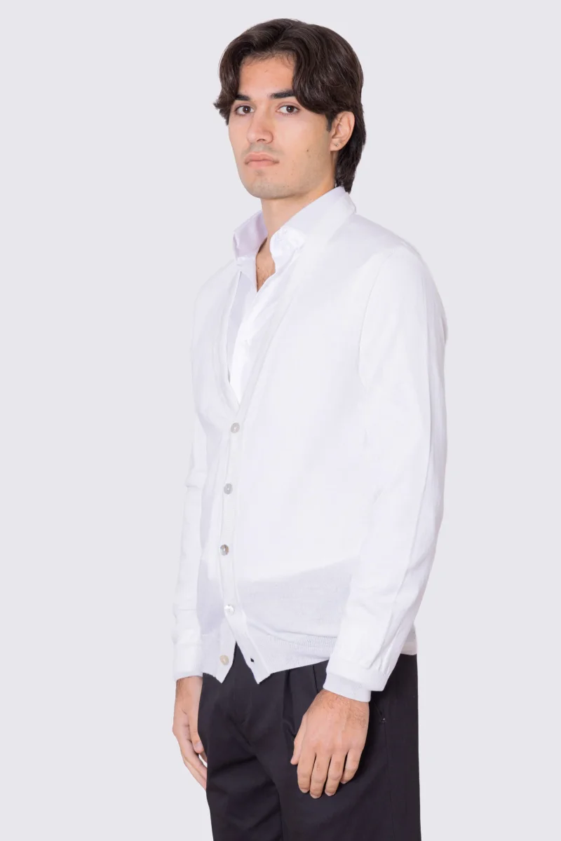 Cardigan Bianco scollo a v in lana merinos 100% costruzione tubolare senza cuciture rifinito a mano tinta unita con elastici sulle maniche e sul fondo Finezza 12