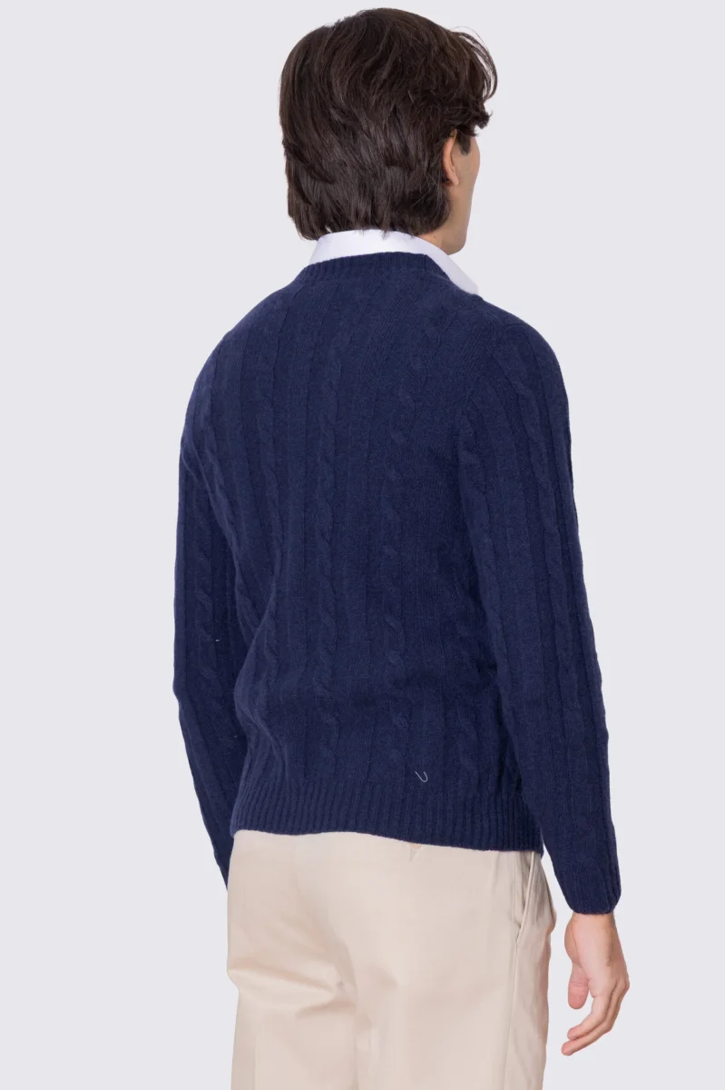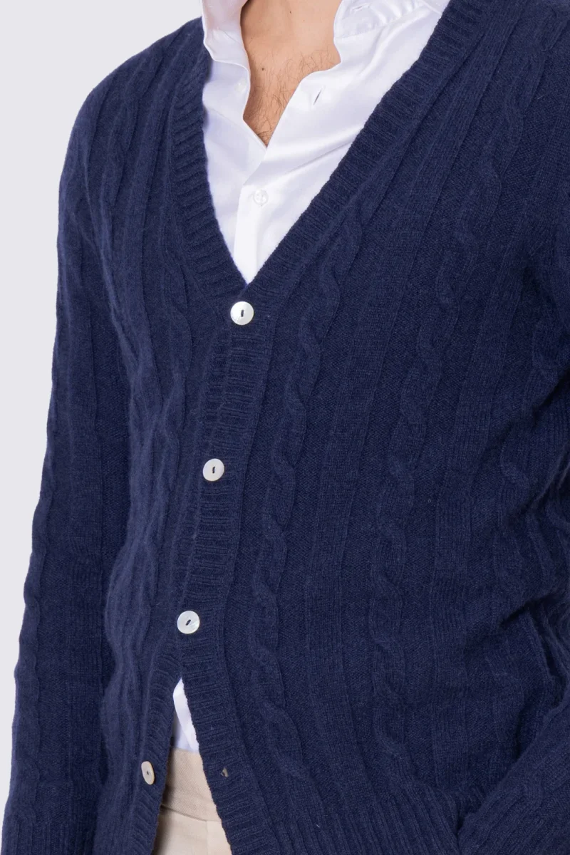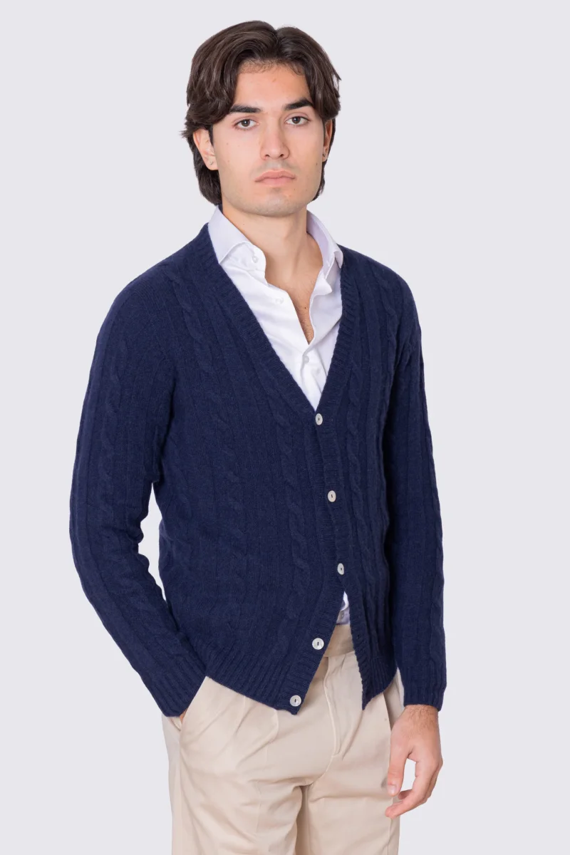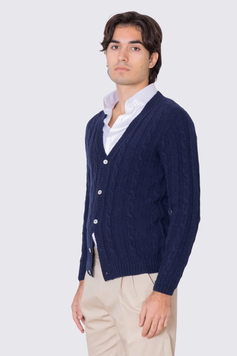 Cardigan Blu in lana grossa e cashmere 5 bottoni con treccia costruzione tubolare senza cuciture rifinito a mano Finezza 7