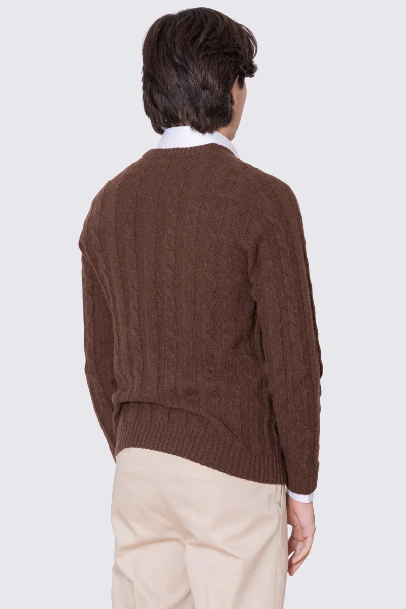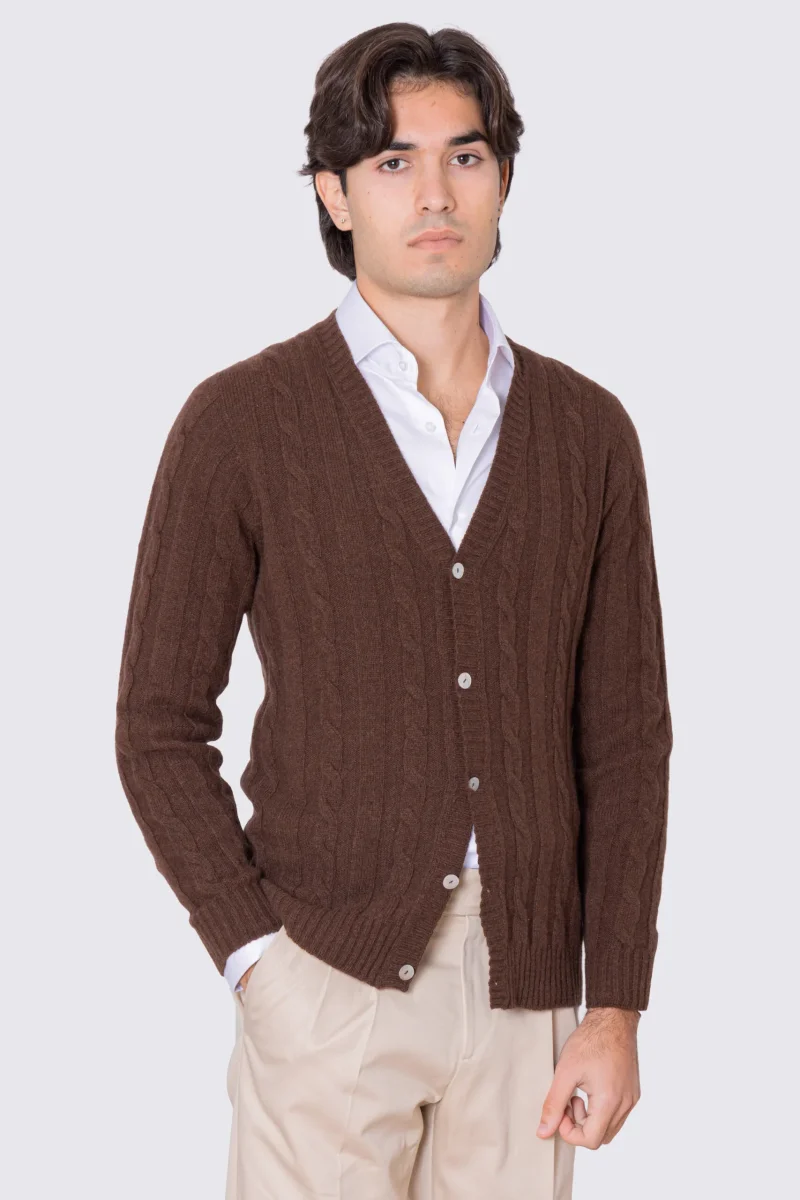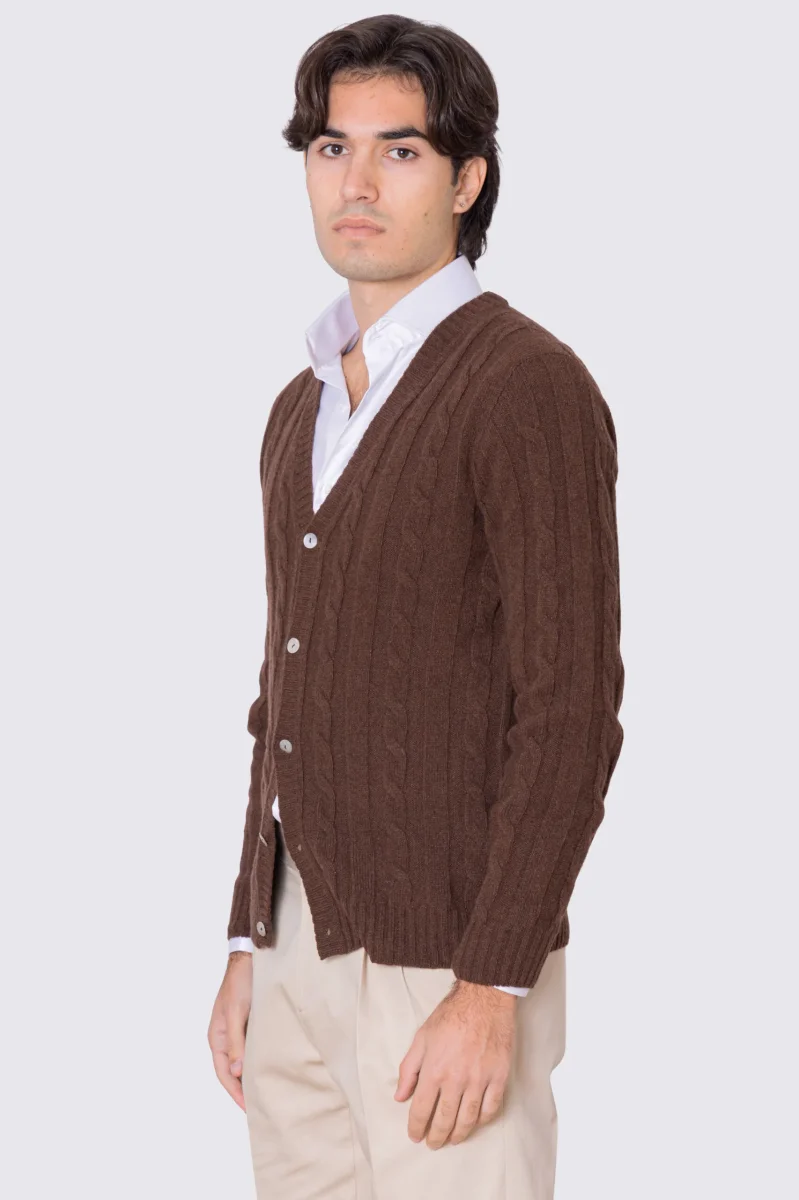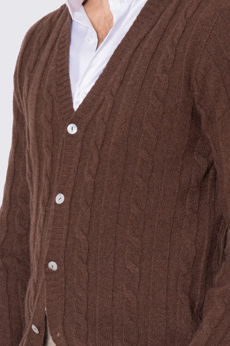 Cardigan Marrone in lana grossa e cashmere 5 bottoni con treccia costruzione tubolare senza cuciture rifinito a mano Finezza 7