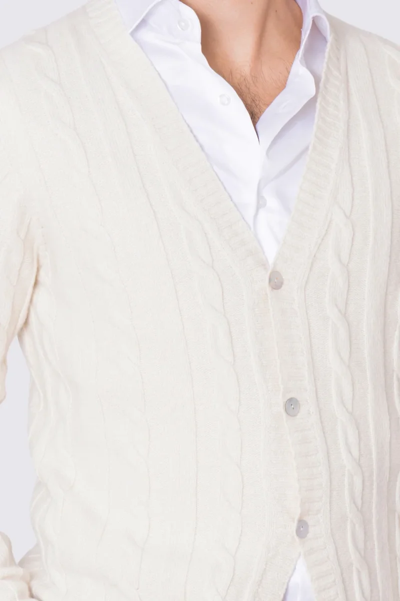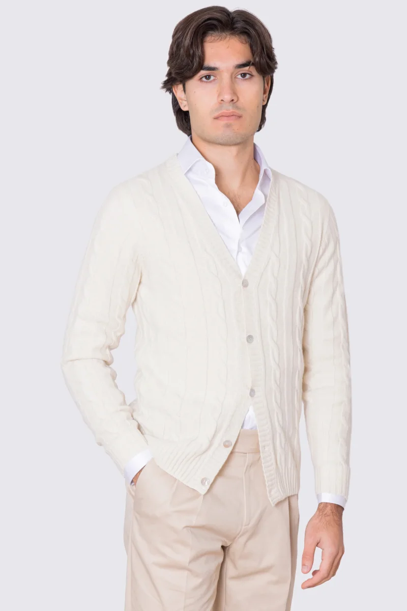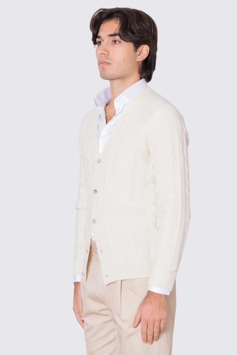 Cardigan panna in lana grossa e cashmere 5 bottoni con treccia costruzione tubolare senza cuciture rifinito a mano Finezza 7