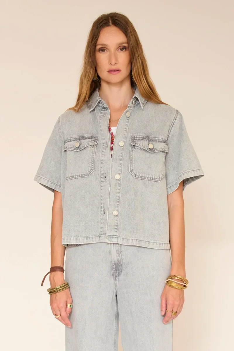 Un denim chiaro dall’aspetto leggermente sbiadito, perfetto per l’estate. Il taglio è dritto e un po’ accorciato, con maniche corte che danno una silhouette pulita e moderna. Il caduto è strutturato senza essere rigido, facile da indossare tutti i giorni. Un capo casual e versatile, da abbinare in total look denim o semplicemente con jeans o pantaloncini per un look estivo rilassato e attuale.
