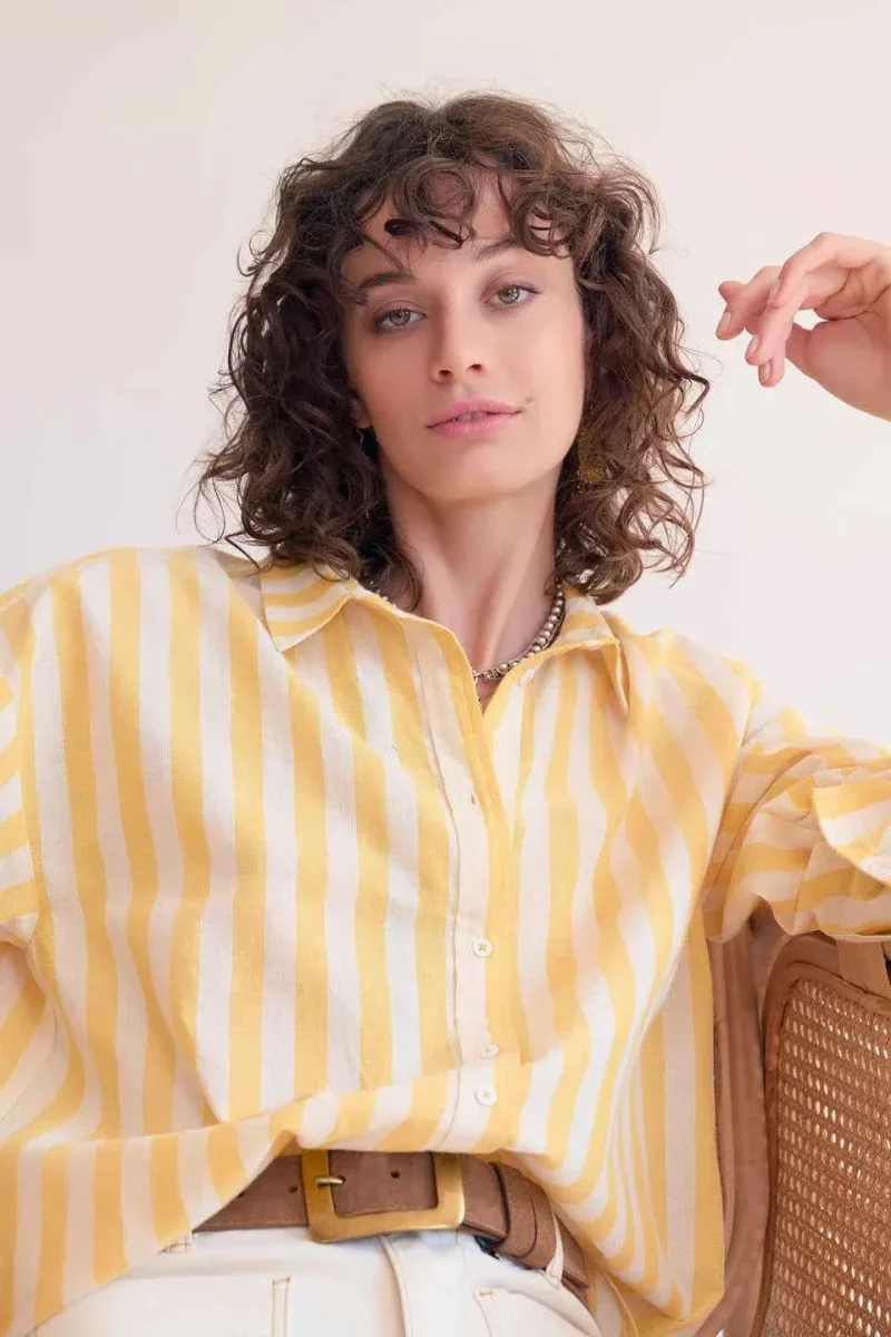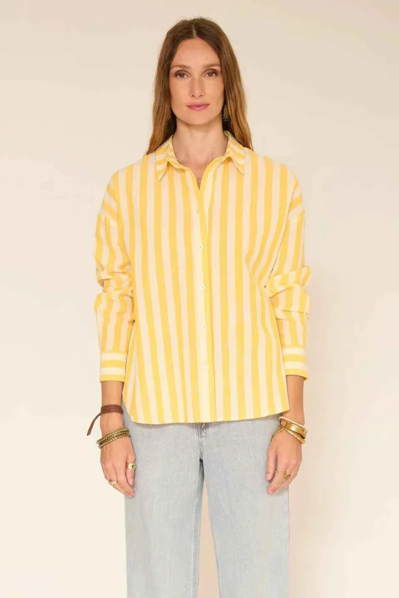 Uno spirito camicia estiva, facile e luminoso. Le strisce gialle apportano subito lucentezza, ammorbidite da un tessuto leggero dalla caduta fluida. Il taglio è dritto, leggermente ampio, con spalle morbide che danno un aspetto rilassato ma curato. Indossata infilata in jeans chiari o lasciata libera su pantaloni ecru, funziona bene sia di giorno che a fine giornata, maniche arrotolate per ancora più nonchalance