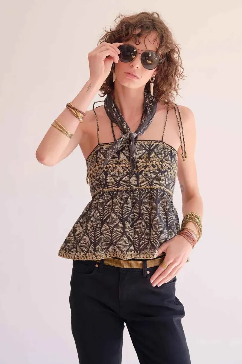 Il motivo grafico dà subito il tono e porta una vera presenza al look. Il top Huma gioca su un taglio leggero e spalline sottili che liberano la silhouette, perfetto per le giornate calde. Indossato con pantaloncini in denim o pantaloni a vita alta, crea un look estivo deciso, allo stesso tempo cool e femminile.