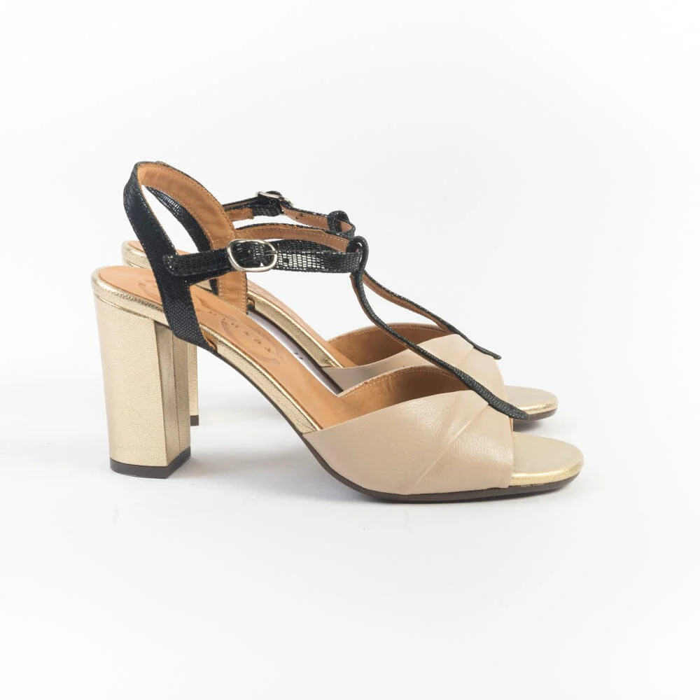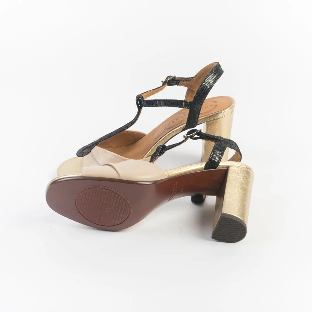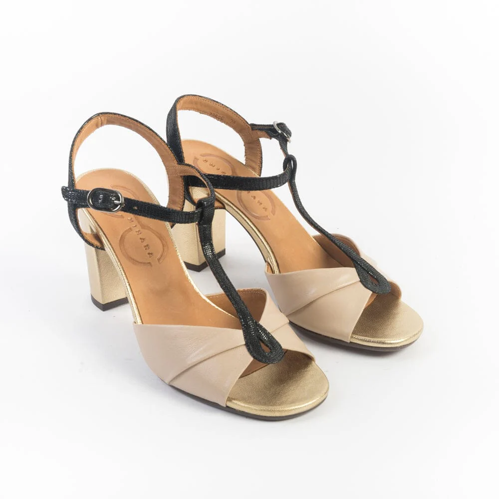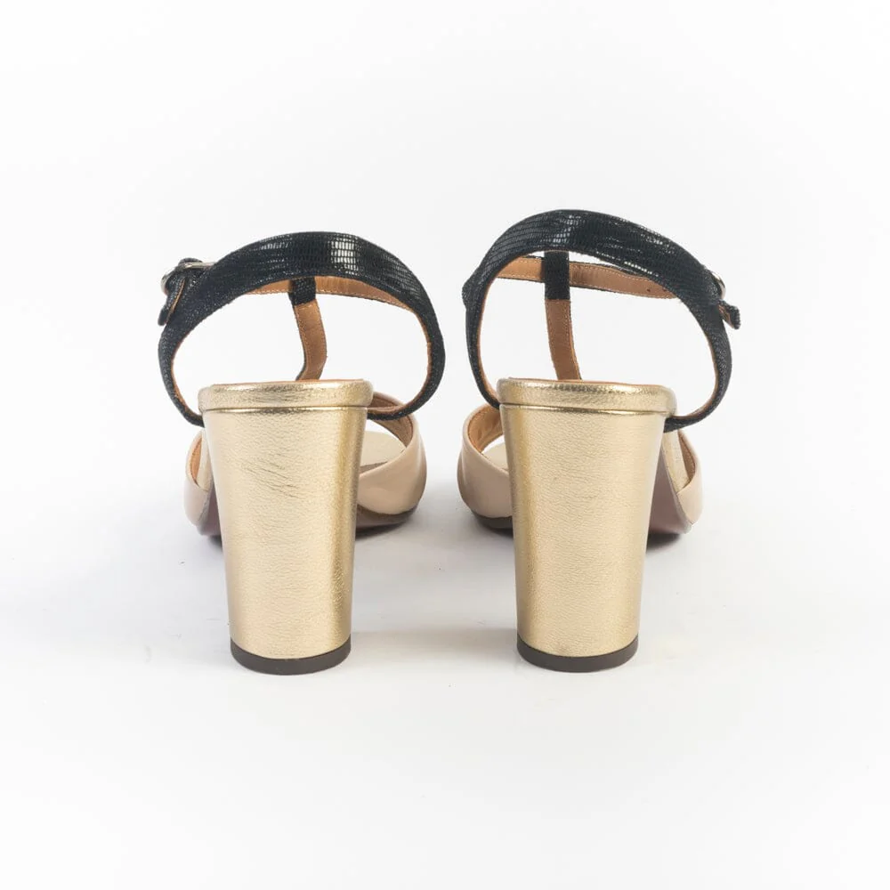 Sandali a T di Chie Mihara realizzati in pelle di colore nudo e pelle effetto rettile di colore nero. Chiusura con cinturino alla caviglia. Tacco colonna in pelle laminata di colore oro, di 9 cm. Calzata estremamente comoda e adatta anche a piedi con pianta particolarmente larga. Sottopiede in pelle, suola in cuoio con inserto in gomma.