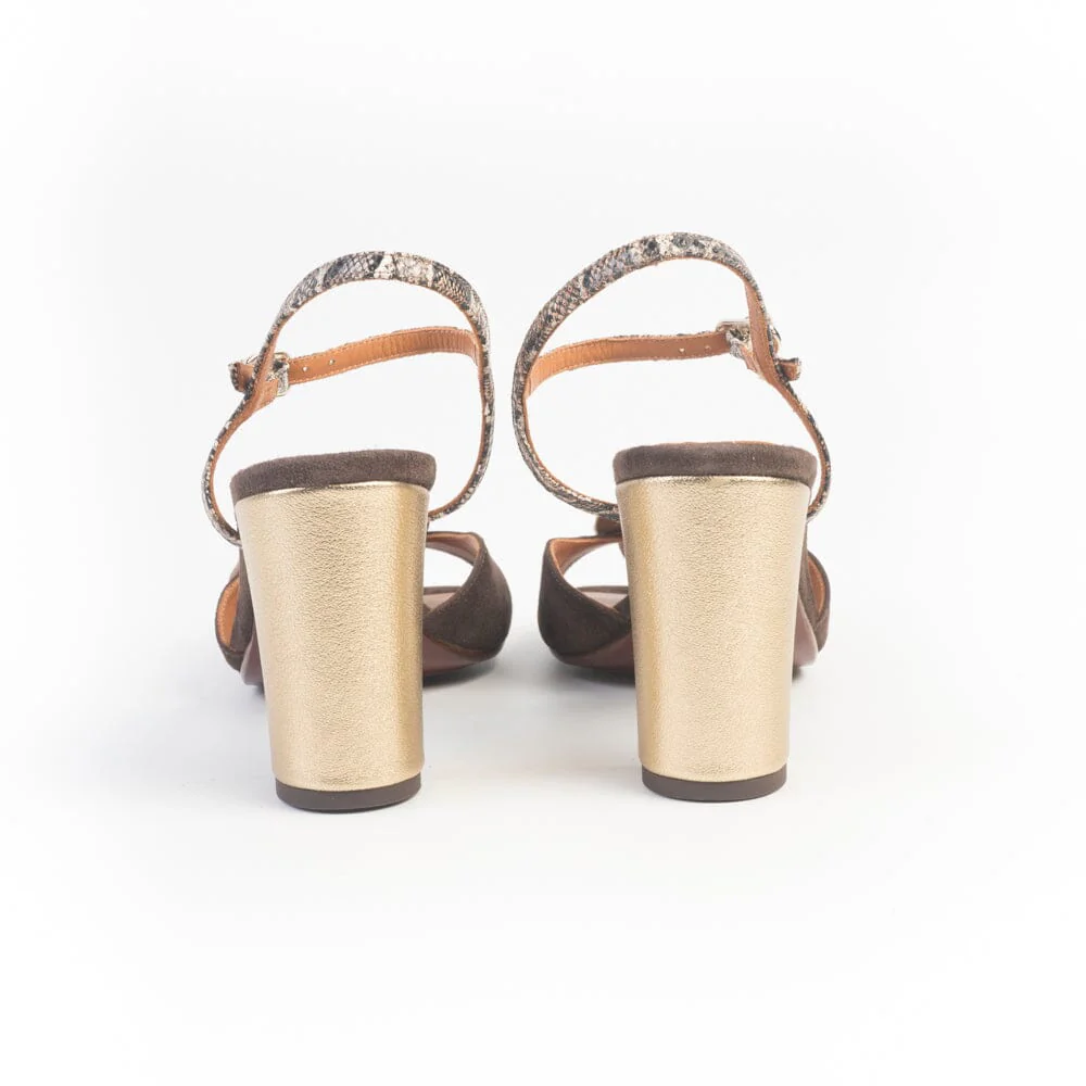 Sandali di Chie Mihara realizzati in morbidissimo camoscio di colore testa di moro con applicazione di fiore in pelle laminata di colore champagne sul fronte della calzatura. Chiusura con cinturino regolabile alla caviglia in pelle stampa pitone. Sottopiede in pelle. Suola in cuoio con inserto in gomma. Tacco colonna di 9 cm rivestino in pelle laminata platino.