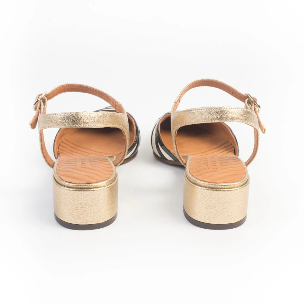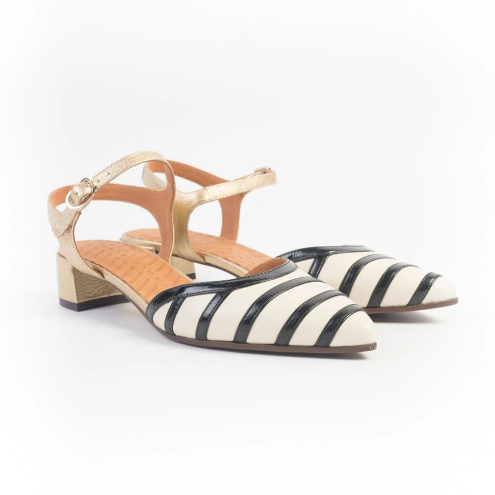 Sandalo di Chie Mihara dalla forma a punta affusolata, realizzate in morbida pelle di colore avorio e pelle verniciata di colore nero. Cinturino alla caviglia regolabile in pelle laminata di colore champagne. Sottopiede in pelle, suola in cuoio e gomma antiscivolo. Tacco di 4 cm rivestito in pelle laminata.