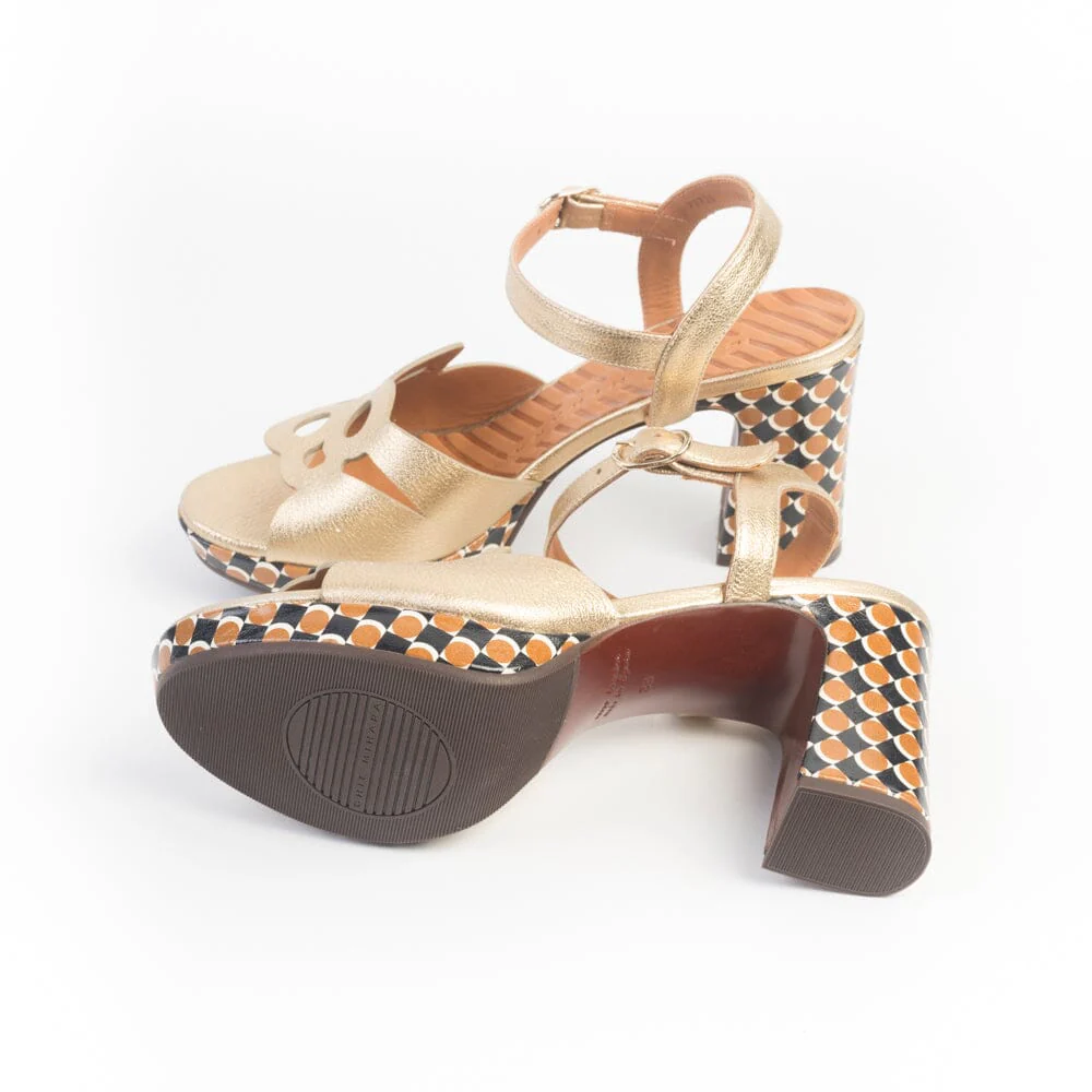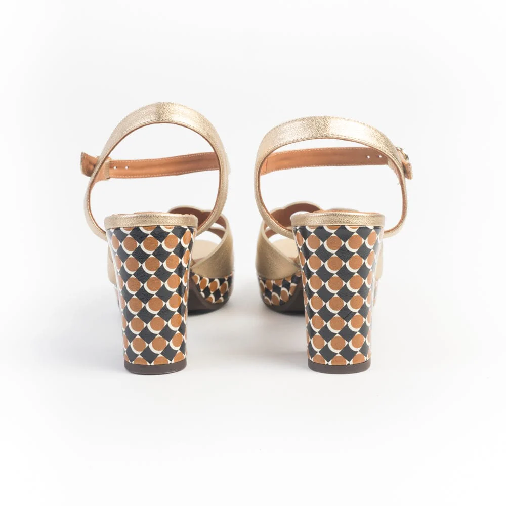 Sandali di Chie Mihara realizzati in pelle laminata di colore champagne. Tomaia con fascia traforata sul fronte della calzatura. Chiusura con cinturino regolabile a lato caviglia. Decorazione su plateau e tacco con disegni geometrici nei toni del nero e cuoio. Tacco colonna di 9 cm e plateau di 1.5 cm per una calzata estremamente comoda e adatta anche a piedi con pianta particolarmente larga. Morbido sottopiede in pelle, suola in gomma.