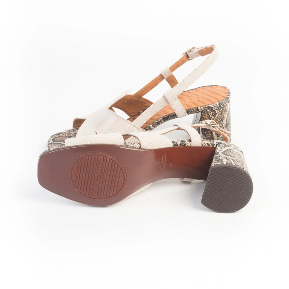 Sandalo di Chie Mihara, a punta leggermente squadrata, realizzato in pelle stampata lucida in avorio con fascia incrociata sull’avampiede. Chiusura con cinturino regolabile a lato della caviglia. Tacco colonna di 6.5 cm decorato con pelle stampata pitone nei colori nero, cuoio e beige. Sottopiede in pelle di colore cuoio e stampa pitone. Suola in cuoio con inserti in gomma.
