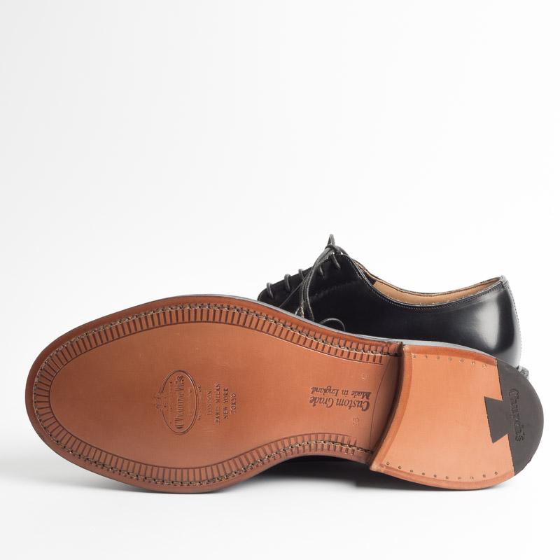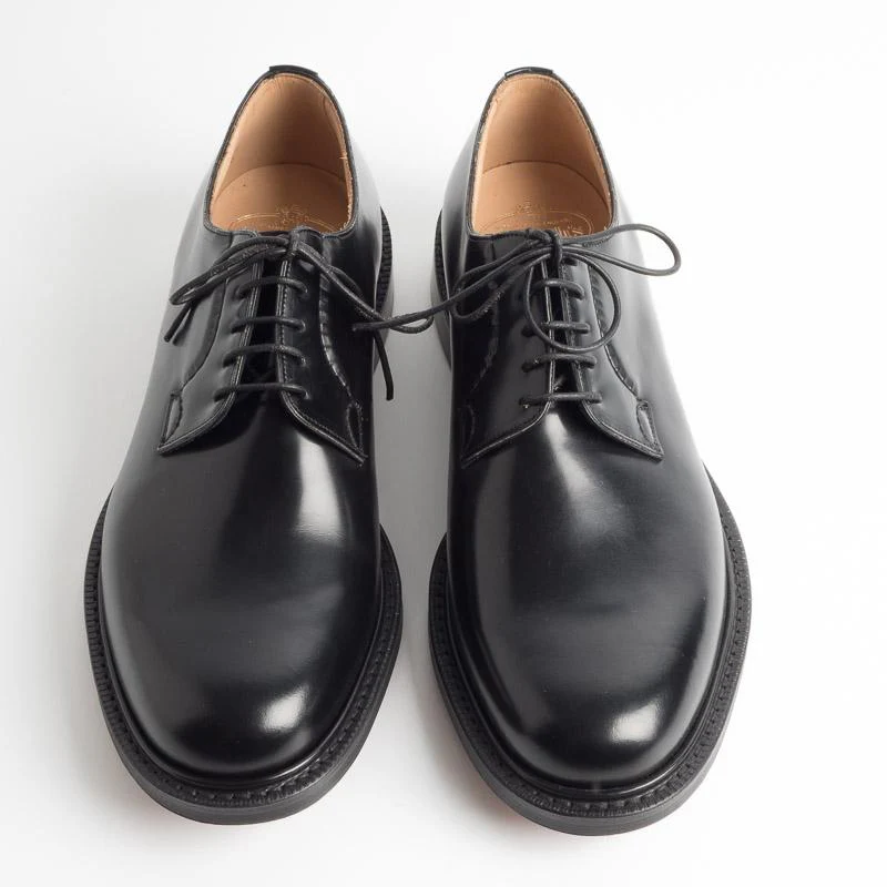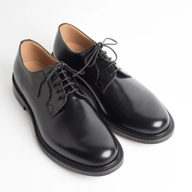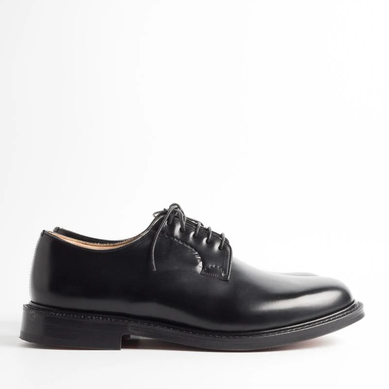 La Shannon è un modello classico della casa madre inglese Church’s. Derby liscio, in polished binder nero, lavorazione goodyear, triplo fondo in cuoio.