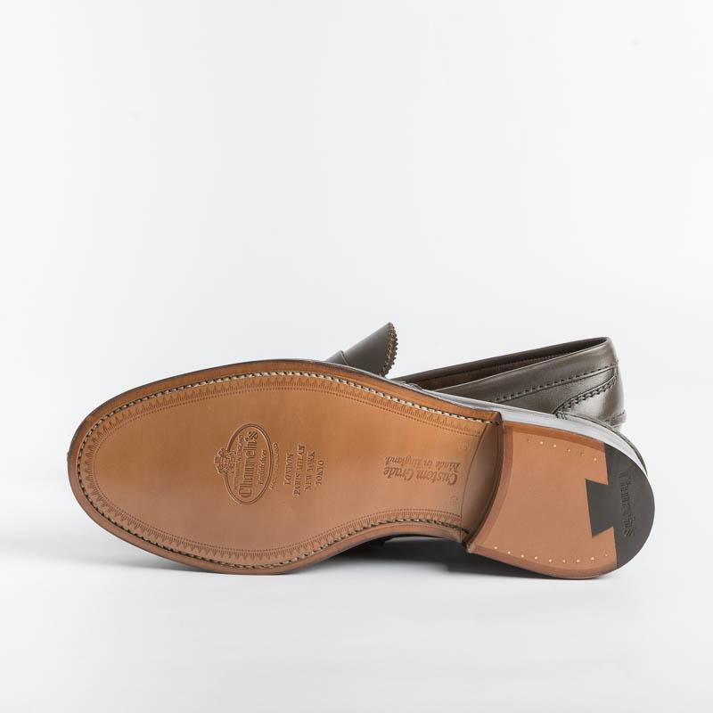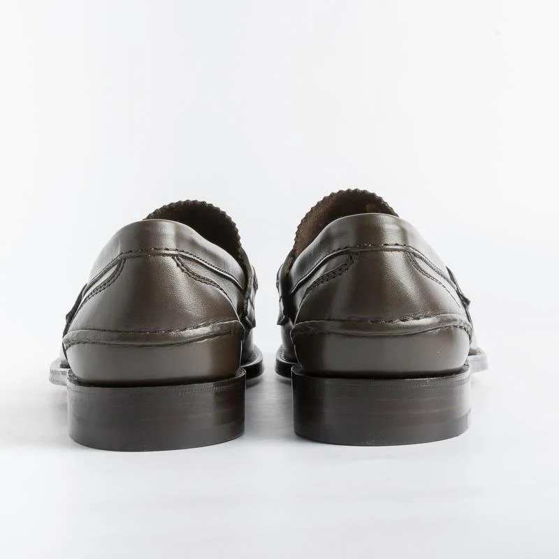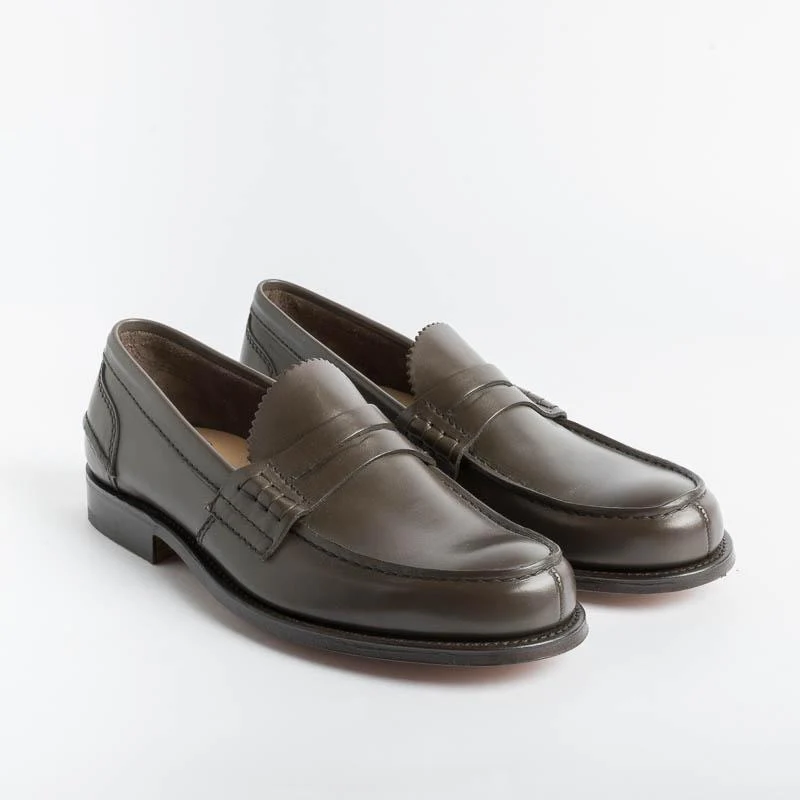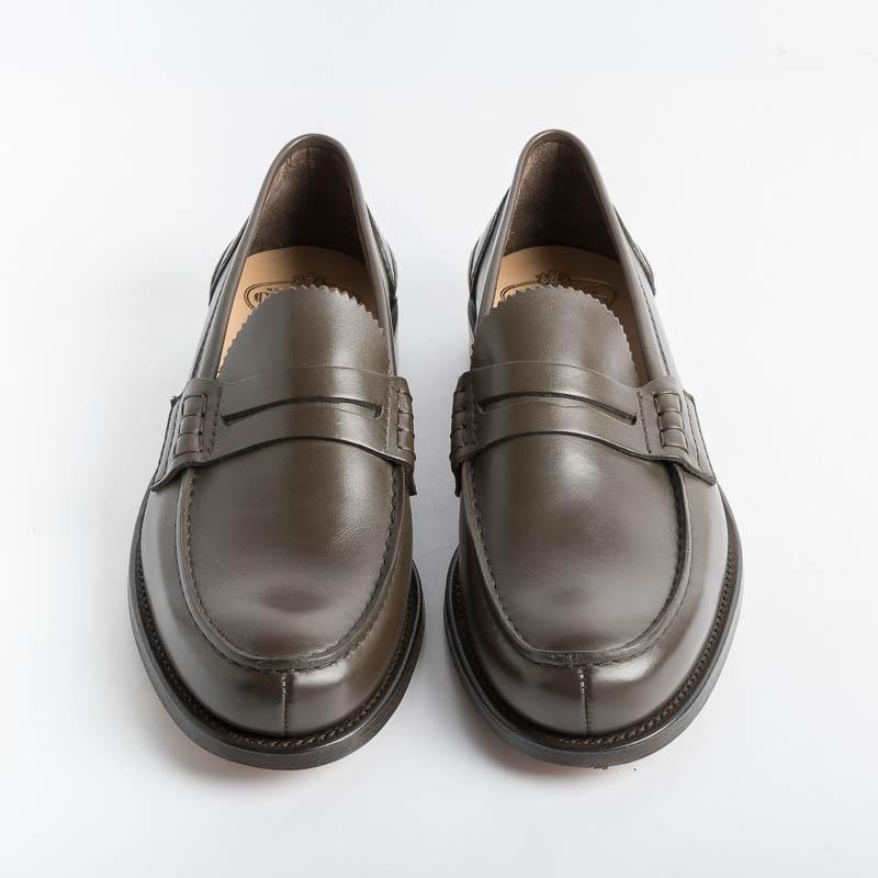 Mocassino classico Pembrey di Church’s realizzato in pelle di vitello di colore marrone scuro. La costruzione della scarpa è Goodyear, interno sfoderato e sottopiede in pelle, la suola è tripla ed è in cuoio.