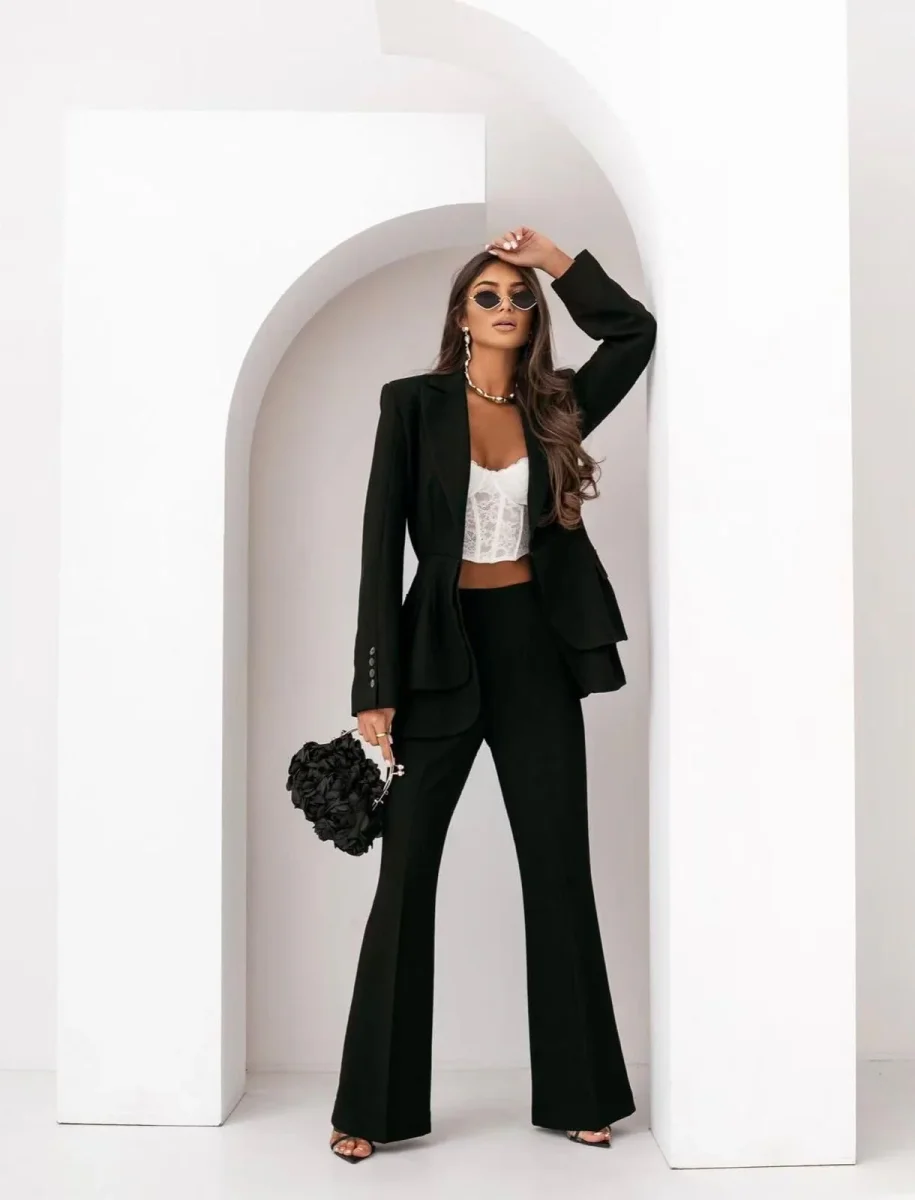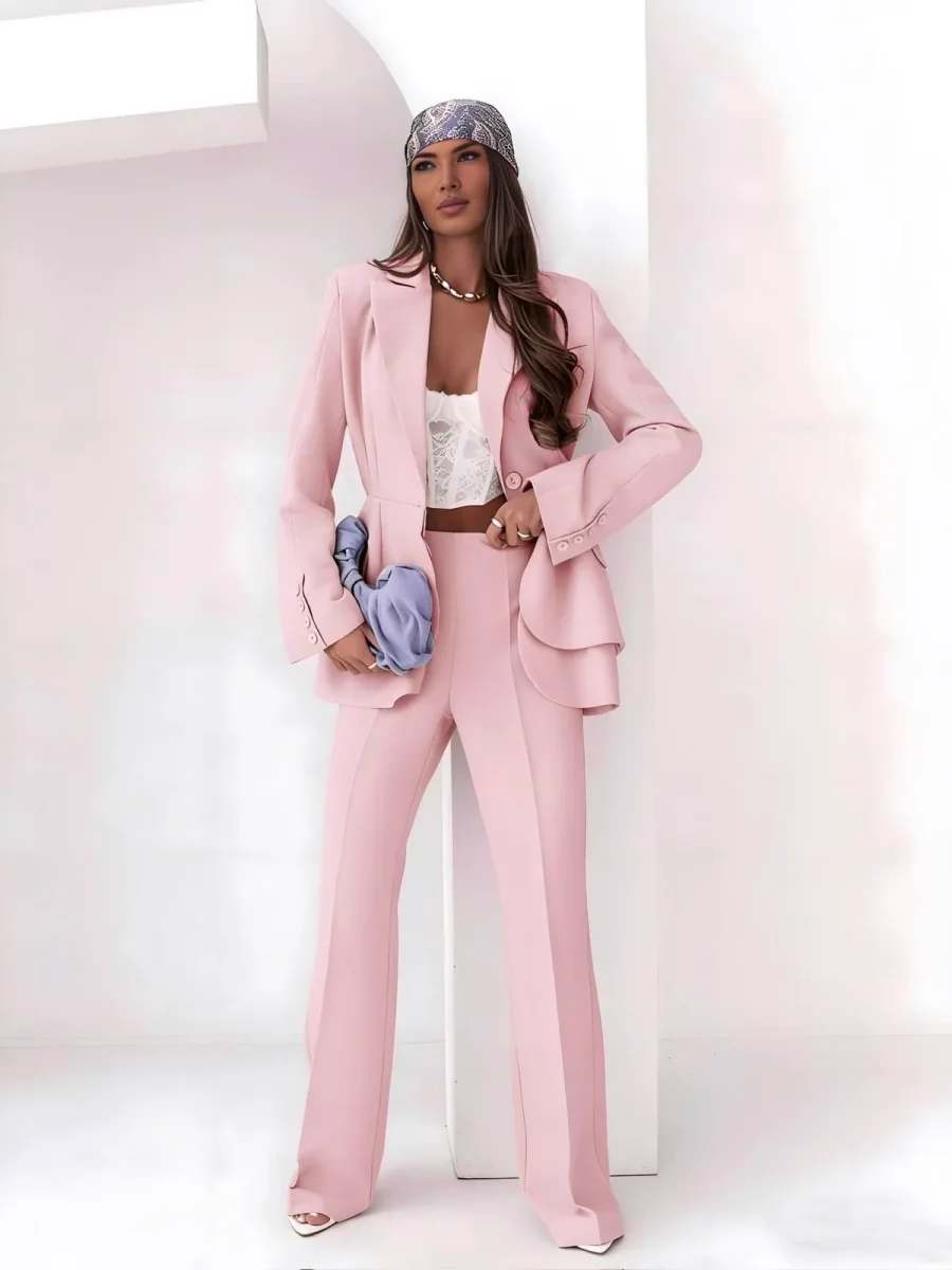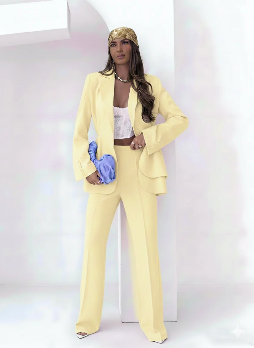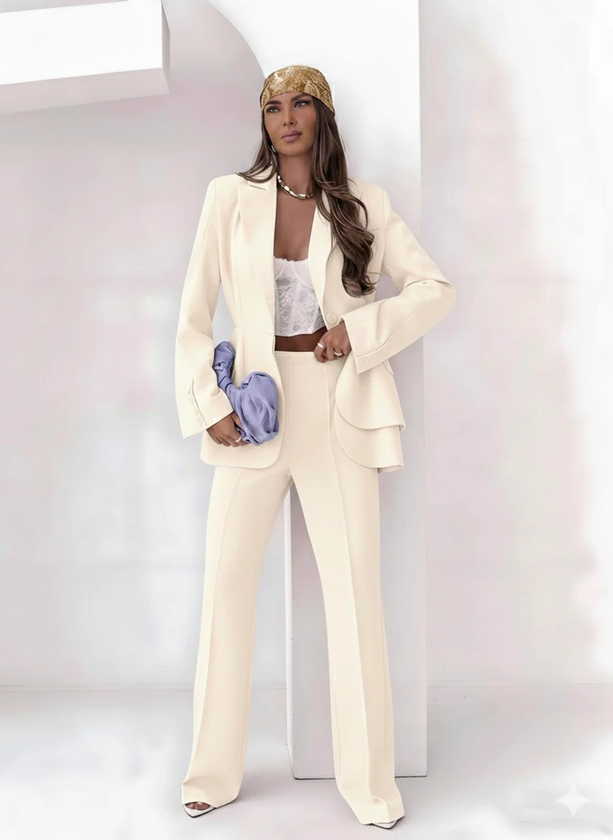 tailleur pantalone dal taglio moderno e sofisticato, caratterizzato da un design strutturato ma fluido.