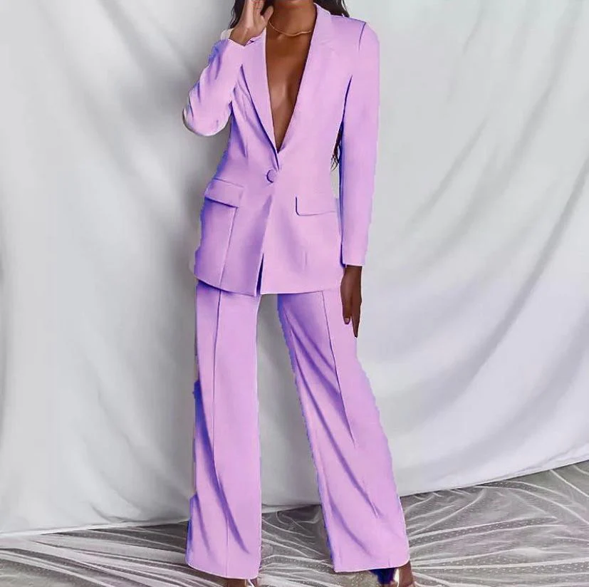 Completo giacca/pantaloni. Giacca foderata con spalline interne, rever classico, bottone e tasche decorative. Pantalalone con bottone e zip modello a zampa.
