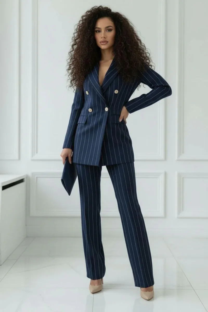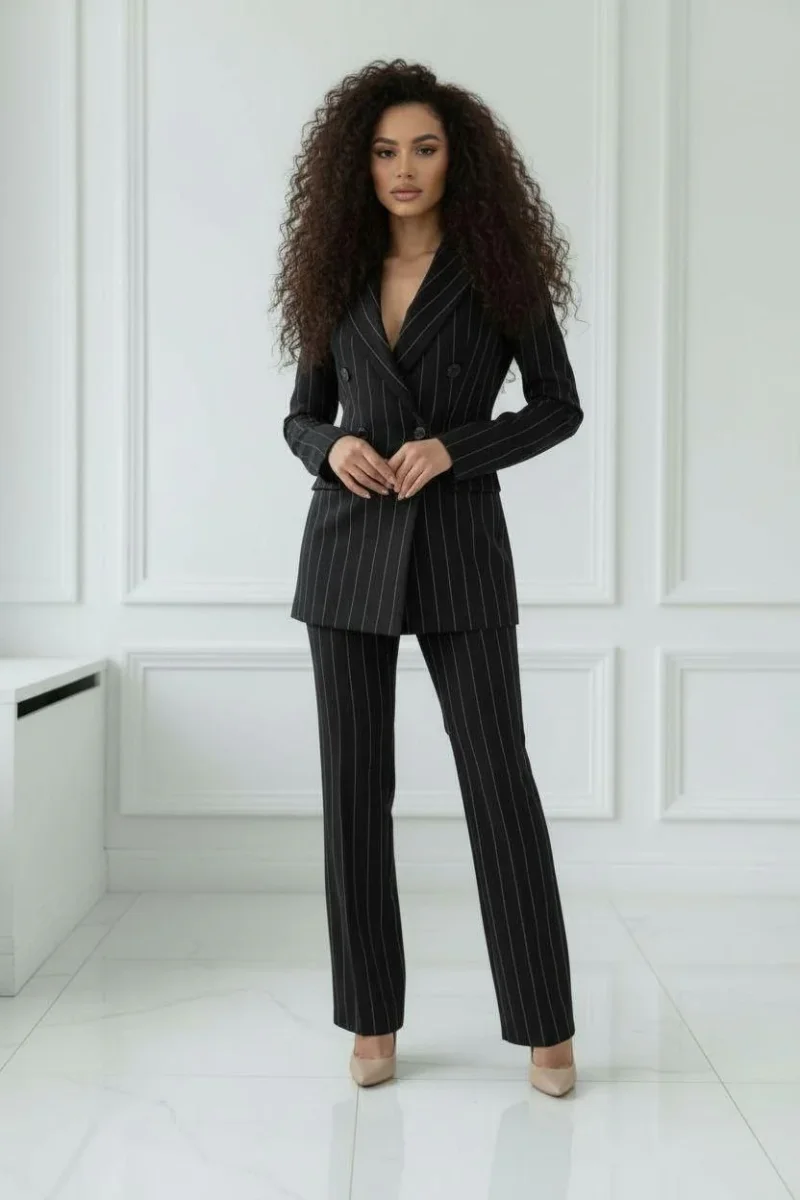 raffinato tailleur pantalone dal taglio sartoriale, caratterizzato da un’estetica elegante e professionale.