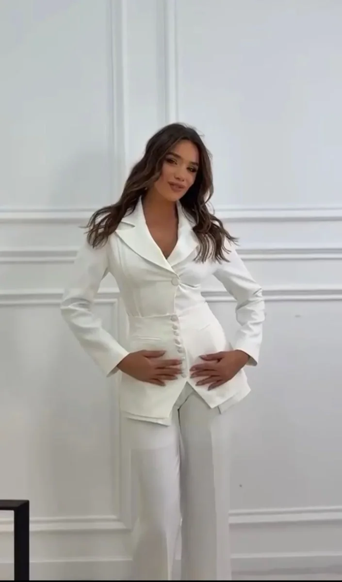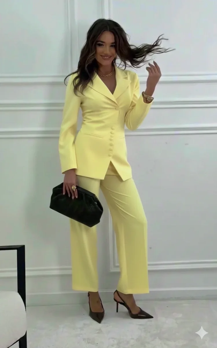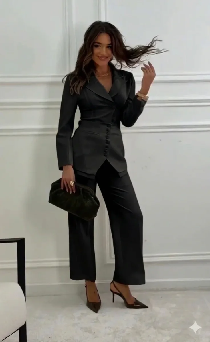 Questo set di capi d’abbigliamento presenta un’estetica elegante e contemporanea, caratterizzata da un taglio sartoriale pulito.