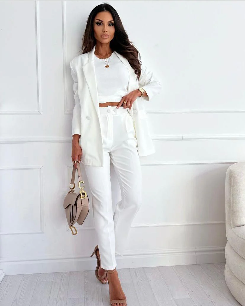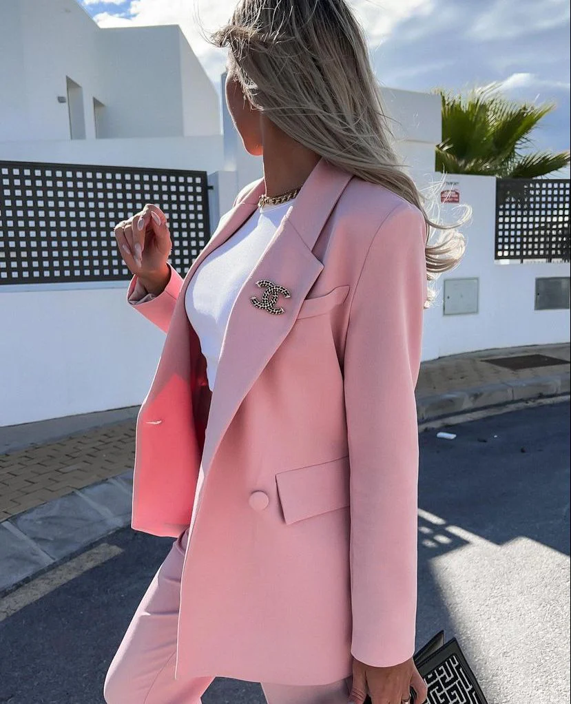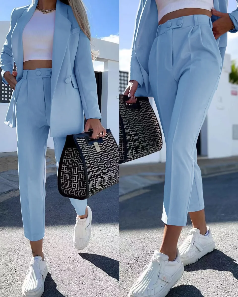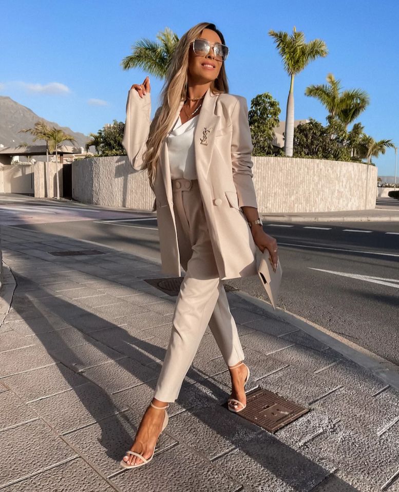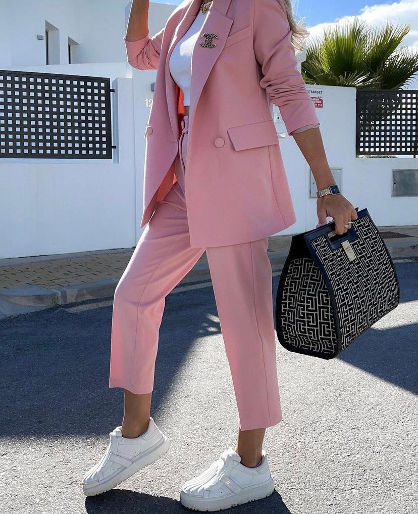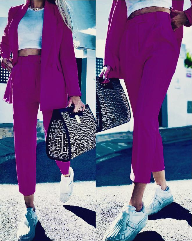 Completo giacca/pantalone tinta unita in scuba crepe, giacca con rever a lancia, bottoni e tasche decorative. Pantalone modello sigaretta, a vita alta con pinches,tasche, doppio bottone, zip ed elastico in vita posteriore.