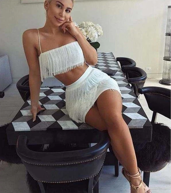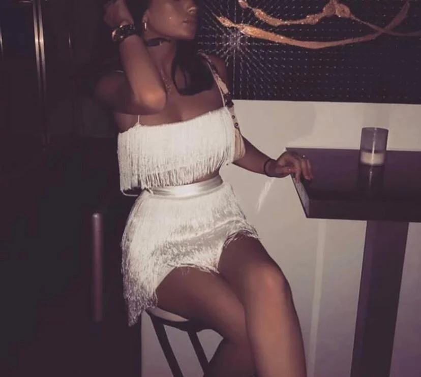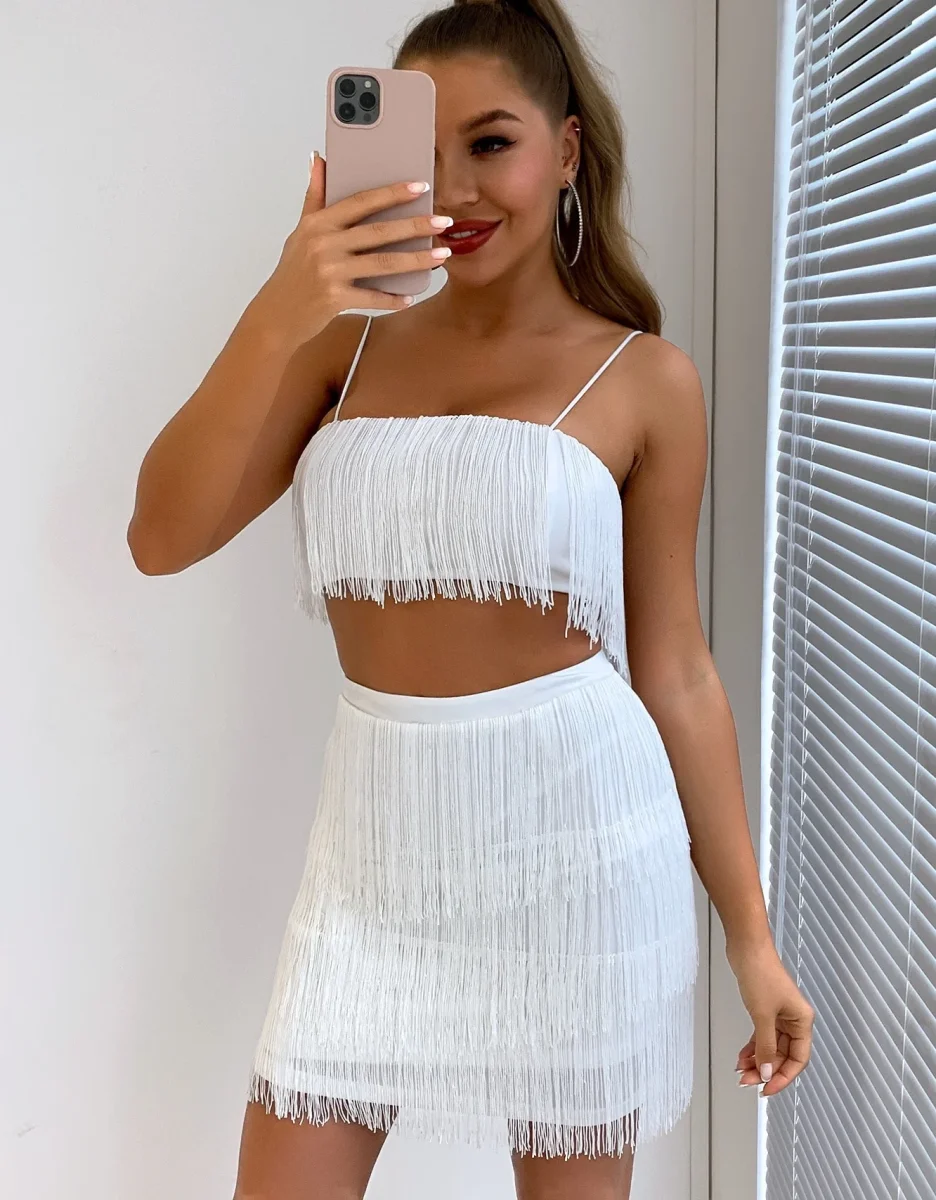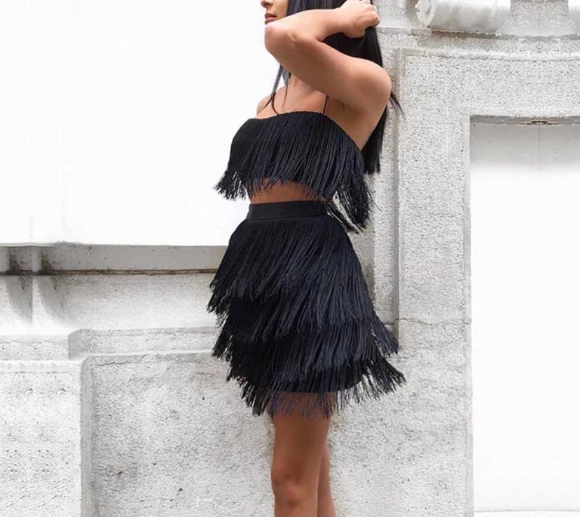 Completo top gonna in poliestere ed elastan, con frange, gonna a vita alta elasticizzata, top a fascia con spalline sottili e chiusura sul retro con zip.