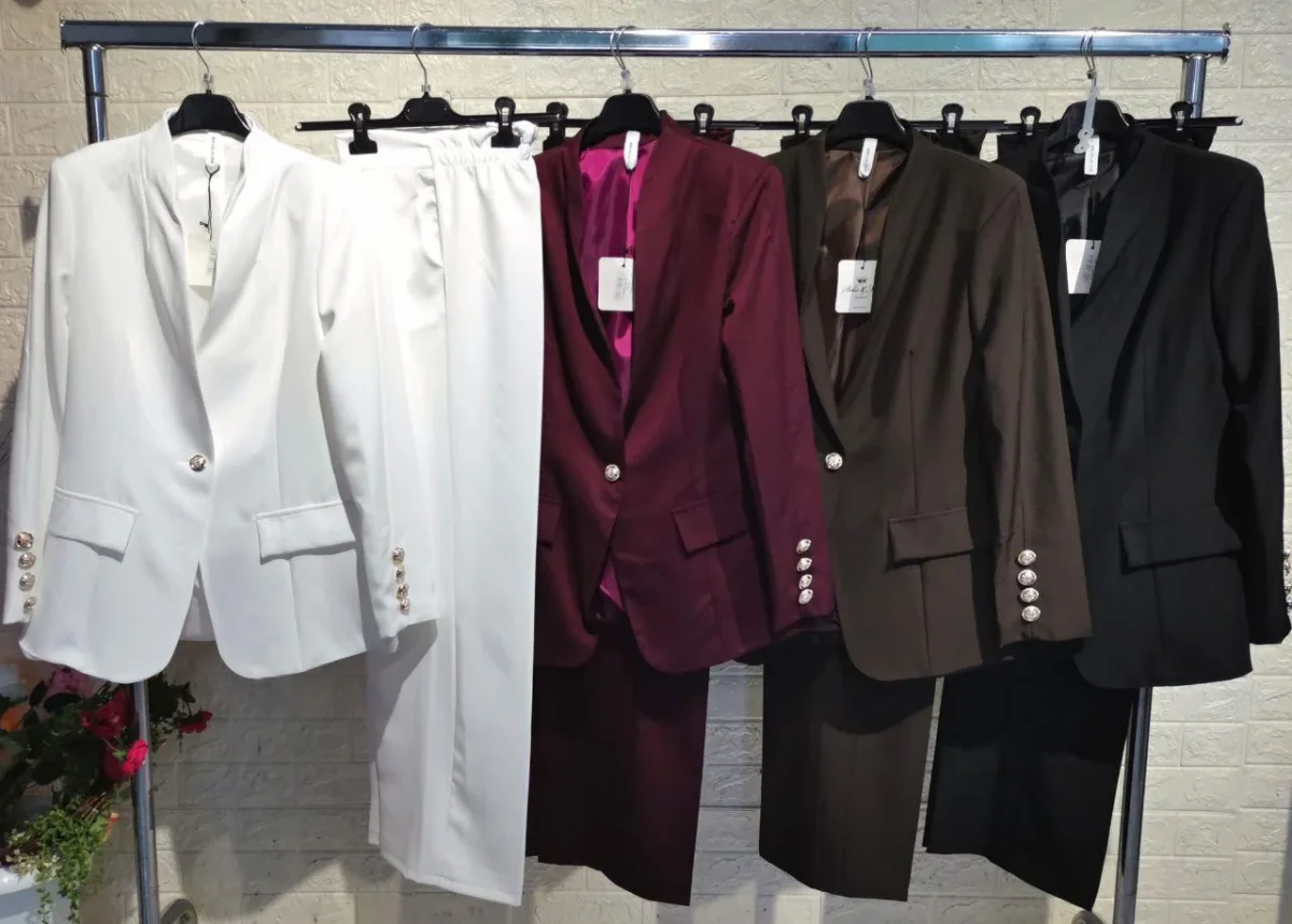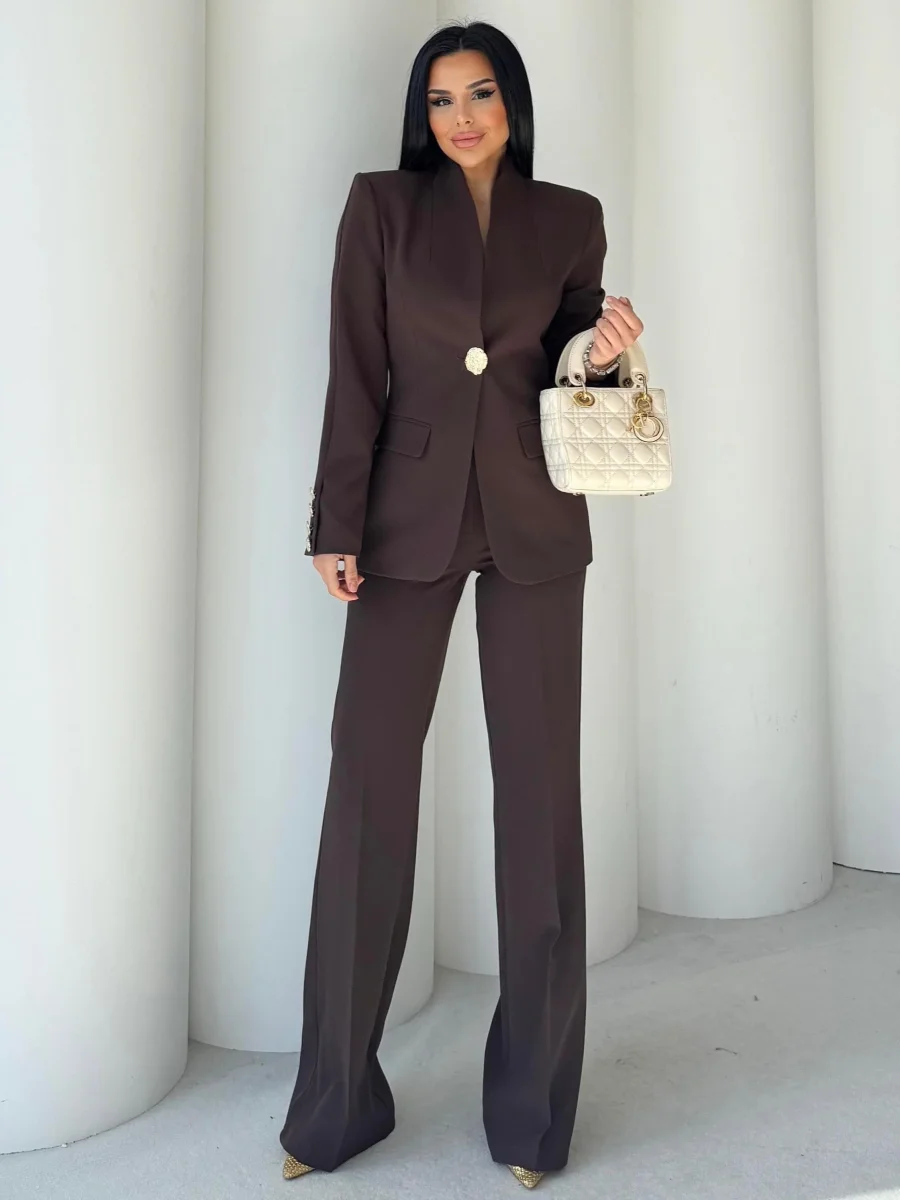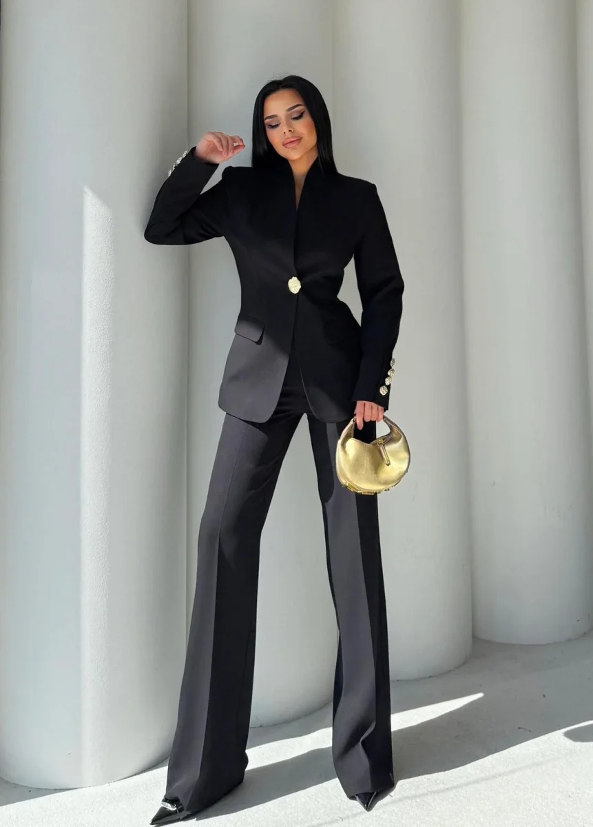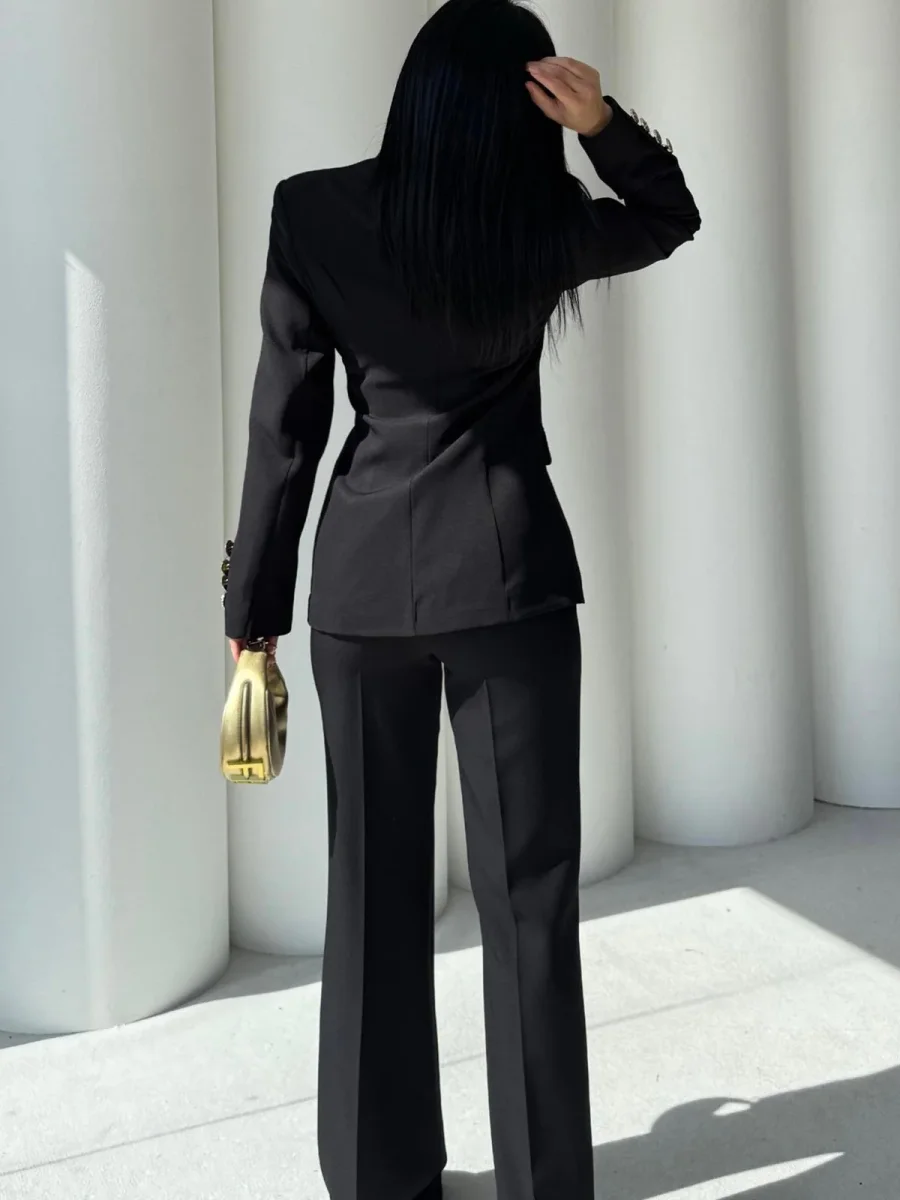 Completo con bottoni dorati, giacca foderata con spalline e pantalone palazzo con elastico in vita sul retro.