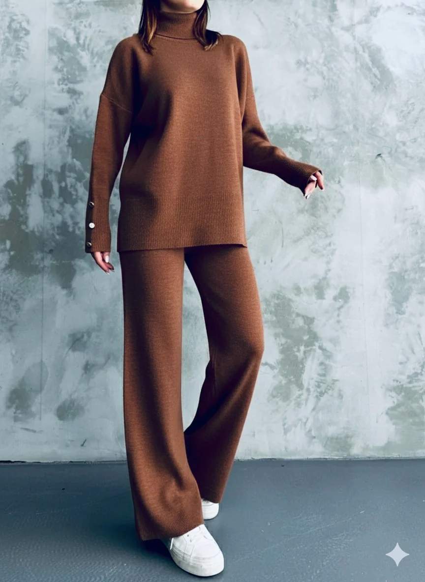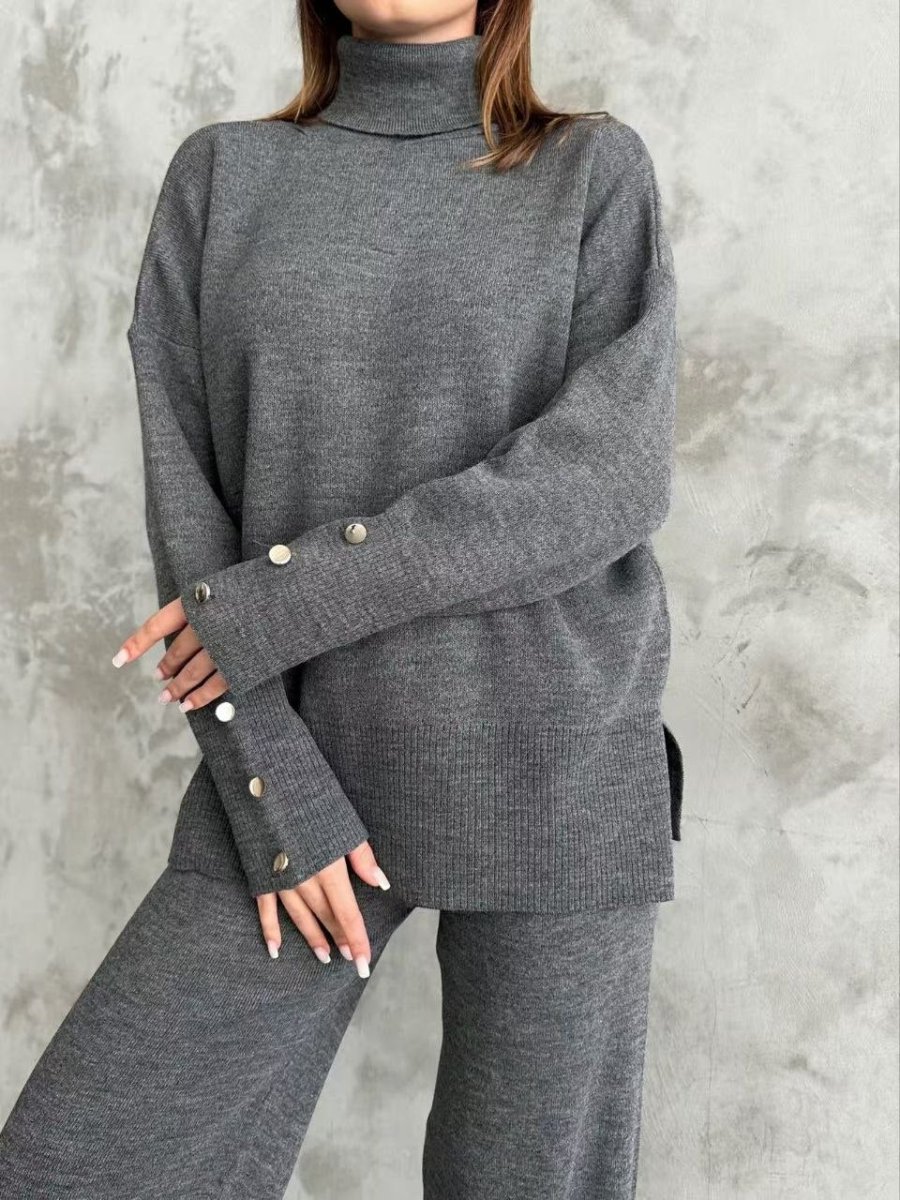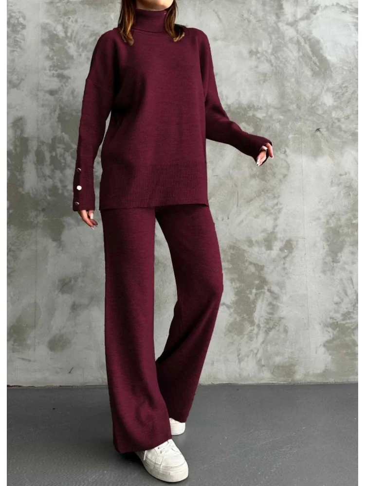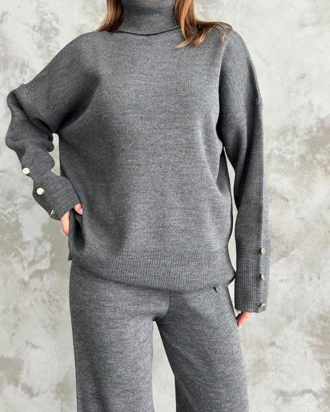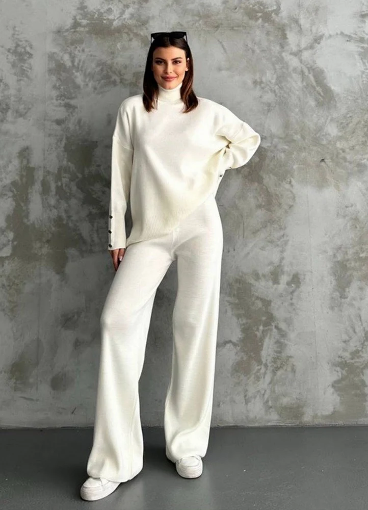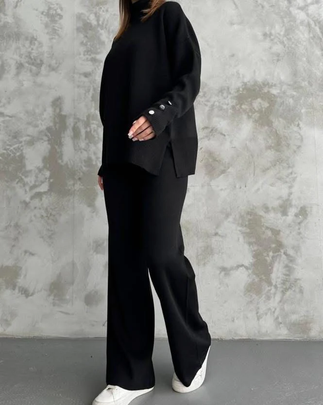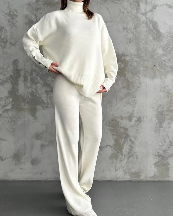 Completo in maglia composto da maglioncino ampio con collo alto e bottoni sulle maniche e pantapalazzo.