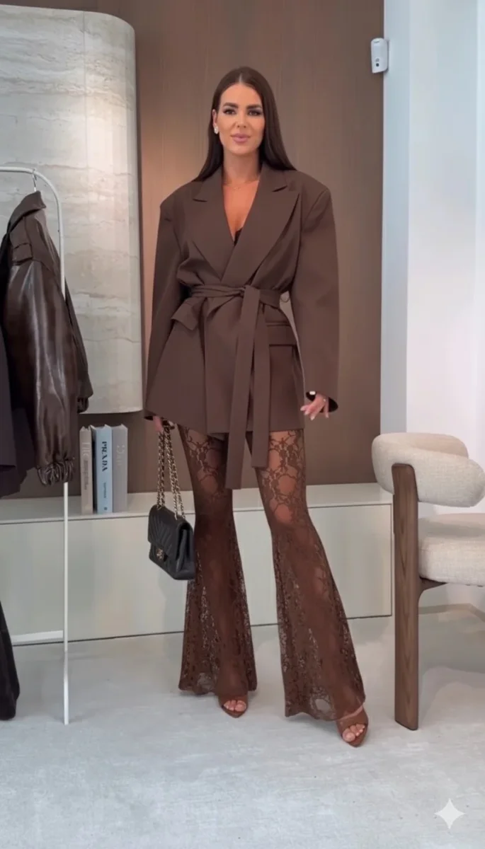 Completo giacca con cinta e pantaloni a zampa in pizzo. Un outfit molto audace e di tendenza che gioca con le proporzioni e le trasparenze, per un look glamour, serale e d’impatto.
