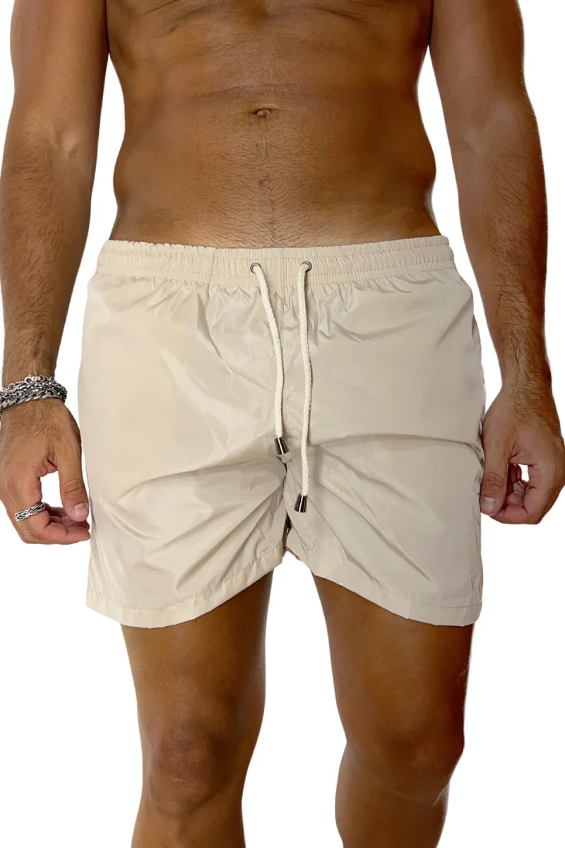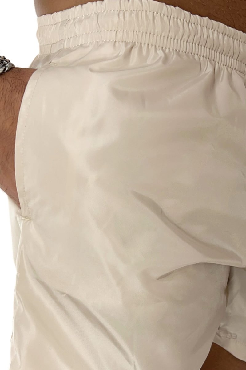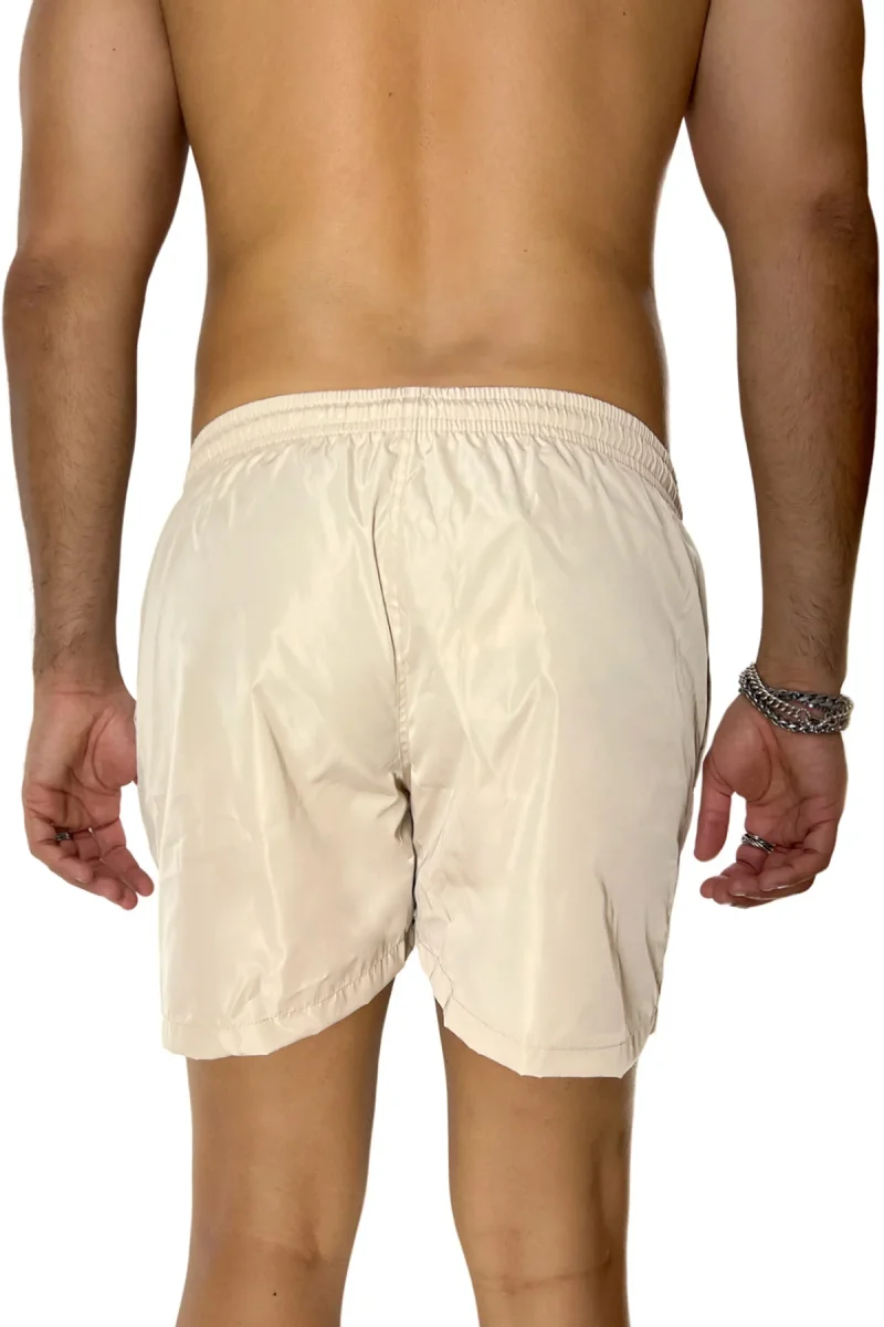 Costume da bagno per uomo con doppia tasca laterale realizzato utilizzando tessuto 100% poliestere di alta qualità ottenuto da plastica recuperata dall’ambiente.