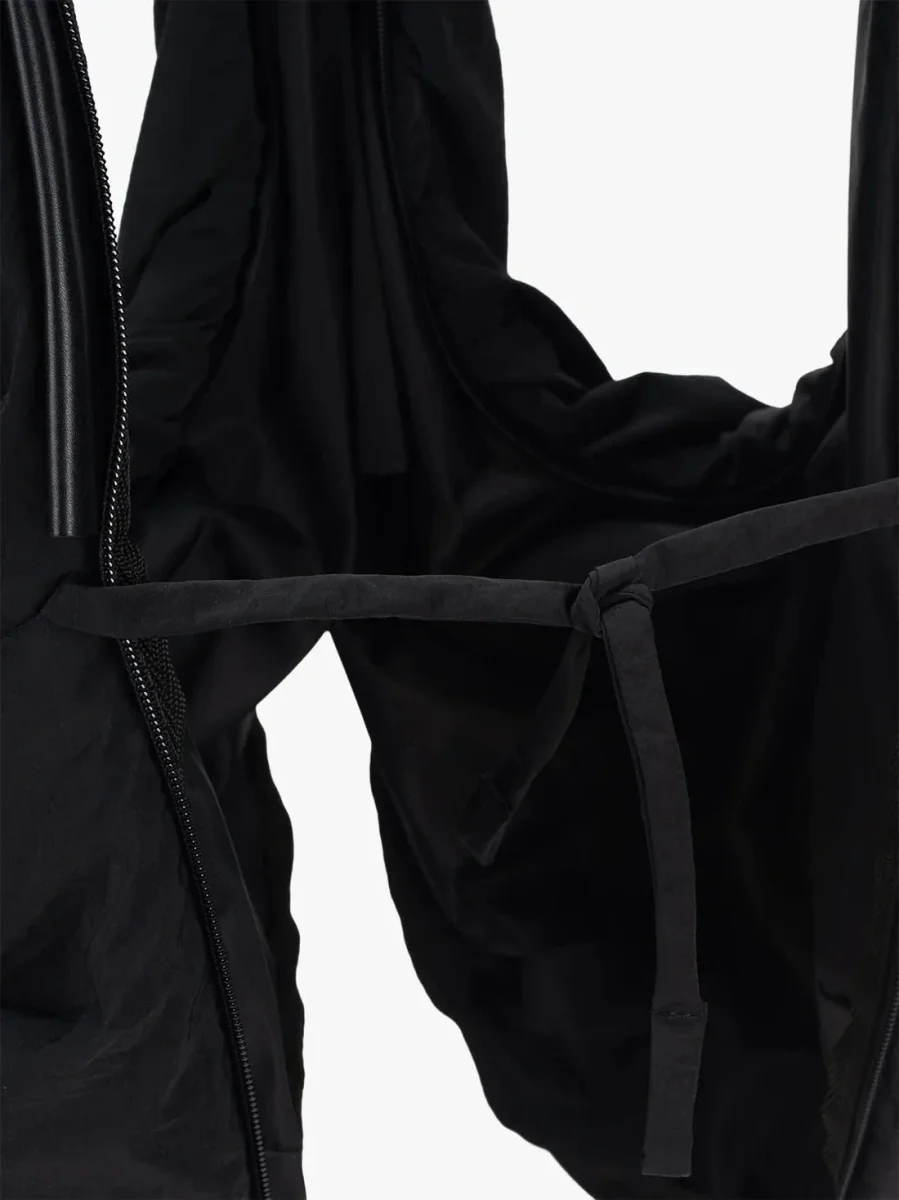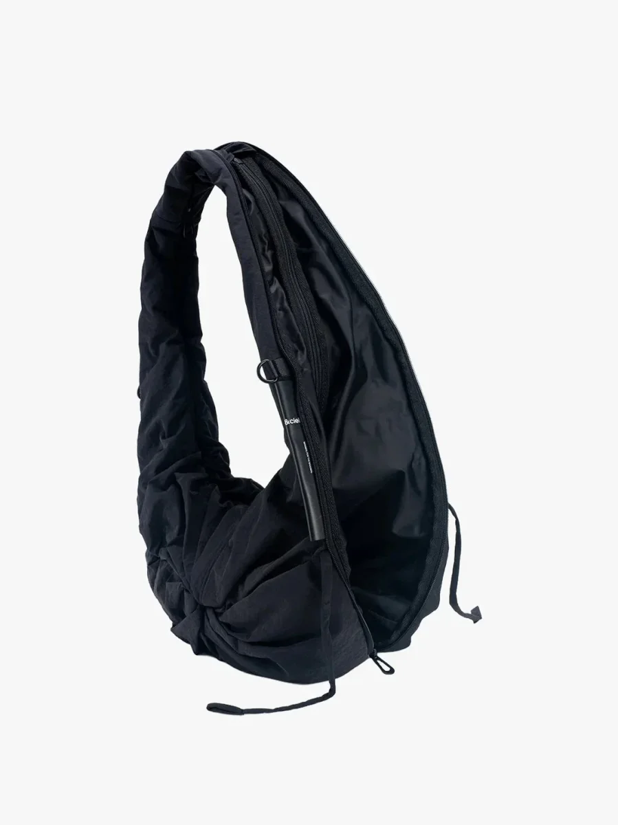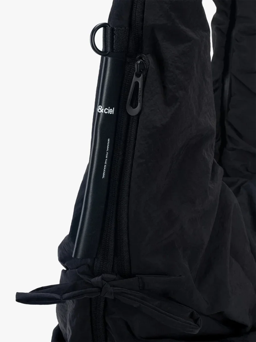 Iconica borsa a tracolla PO di Cote & Ciel, realizzata in nylon nero goffrato totalmente impermeabile. Modello dalla forma mezza luna chiusa con zip in nuance, può essere indossata a tracolla o a spalla. La sua geniale funzione la può trasformare in gilet indossabile in un attimo tramite la cerniera apribile su tutto il profilo della borsa con due lacci in nylon per chiudersi. Due tasche centrali nascoste con zip.