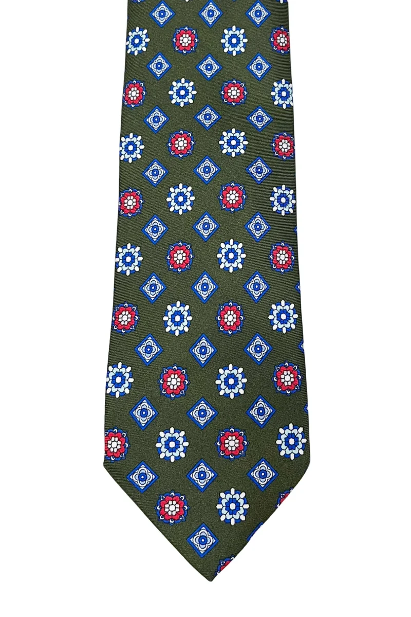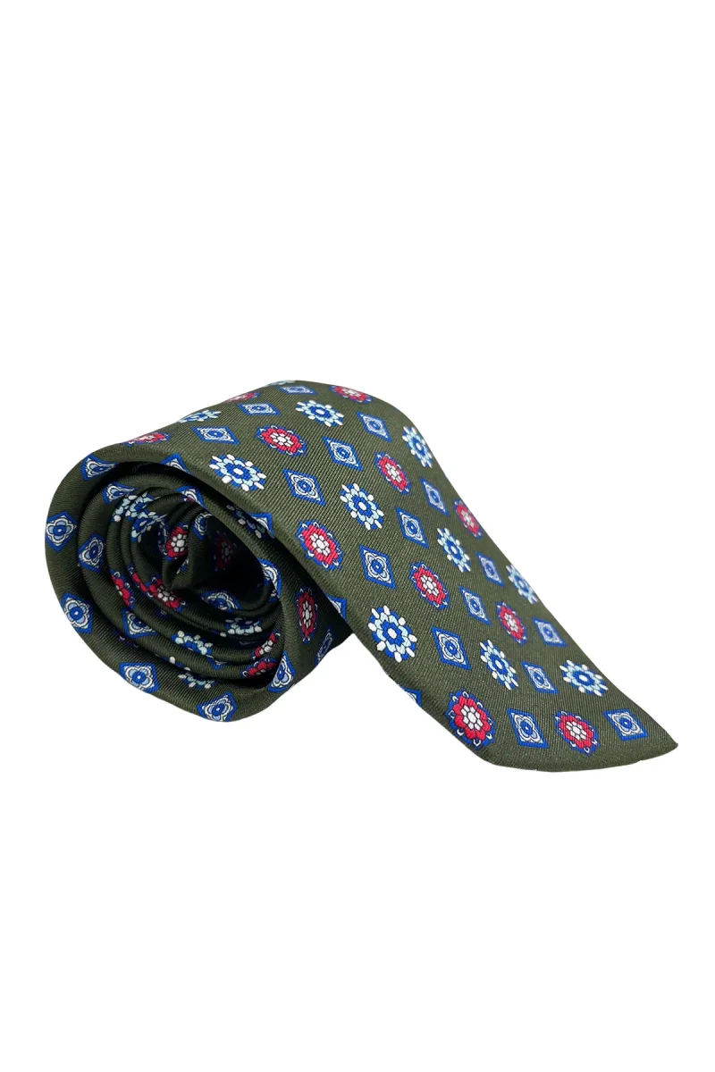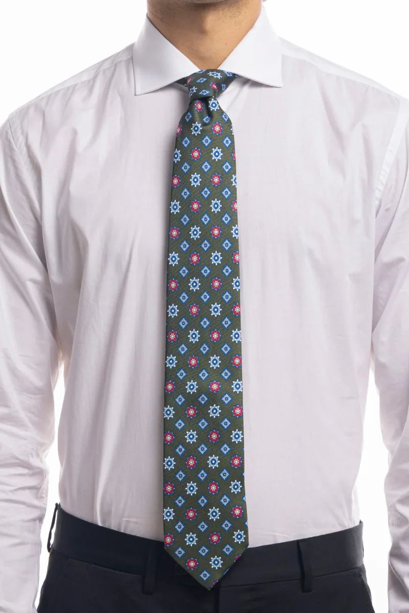 Cravatta uomo verde militare 9cm fantasia fiori multcolor in pura seta cucita a mano