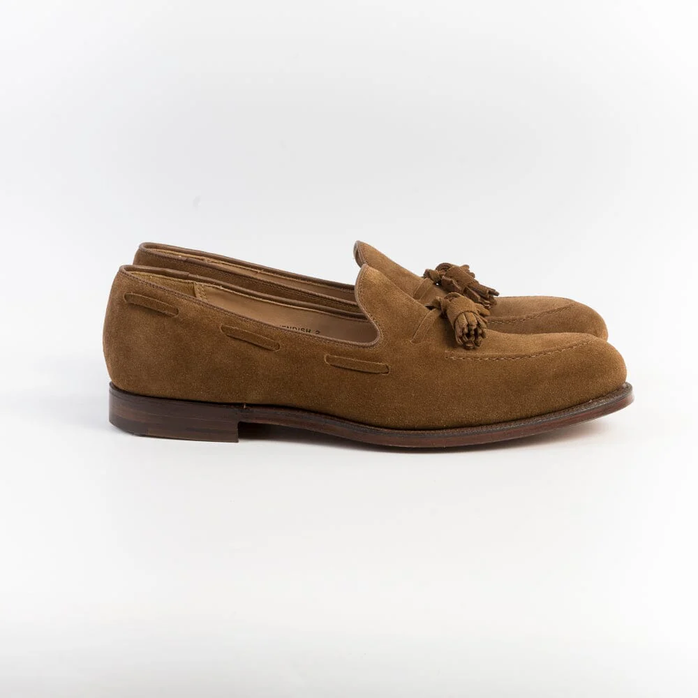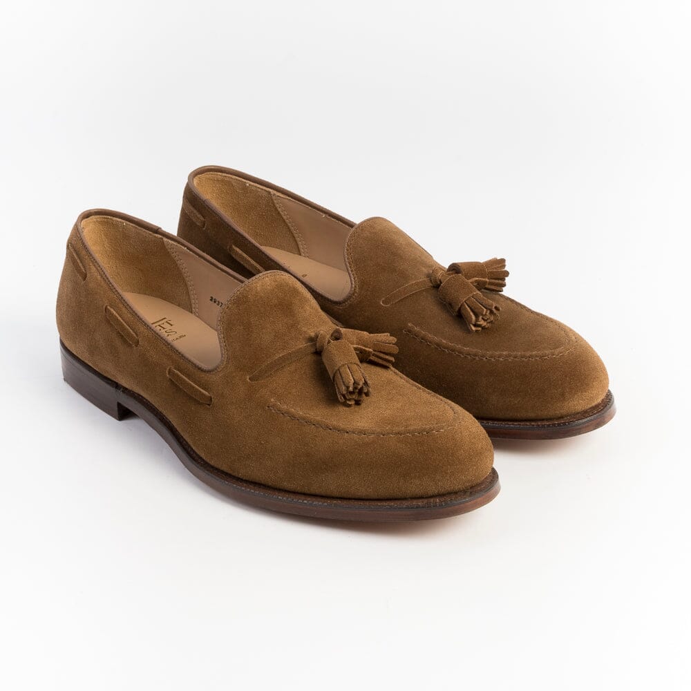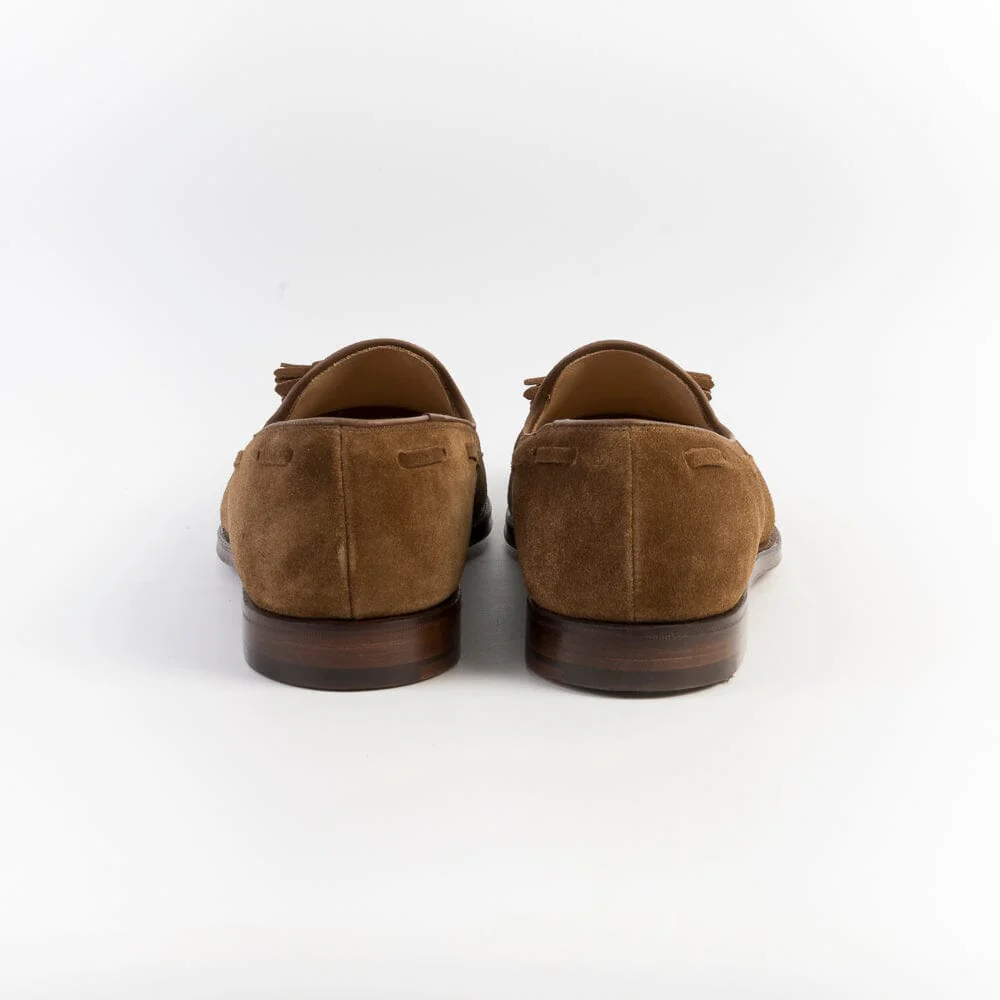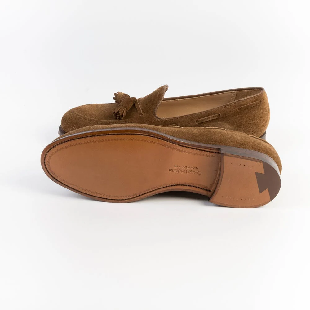 Mocassino con nappine di Crocket & Jones, realizzato in camoscio di colore tabacco. Sottopiede in pelle ed interno foderato. Suola in cuoio con cucitura Goodyear; tacco 2 cm.