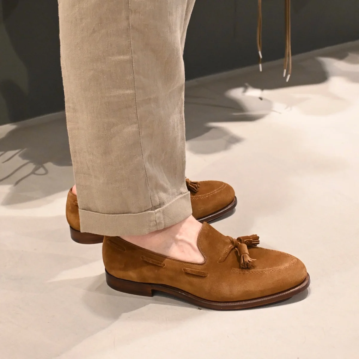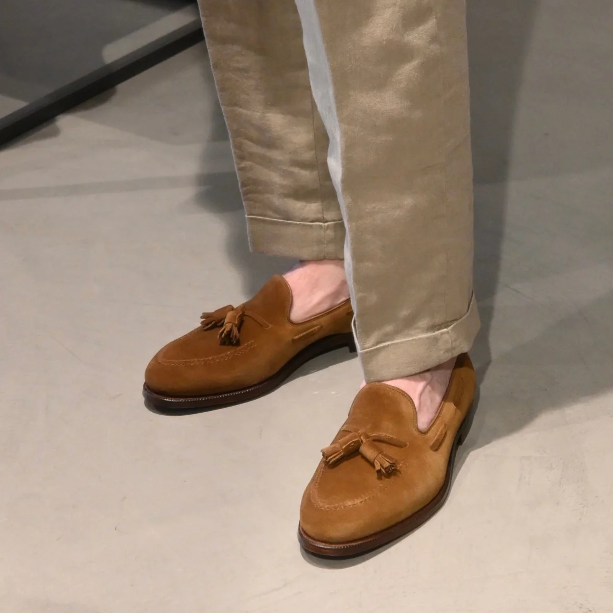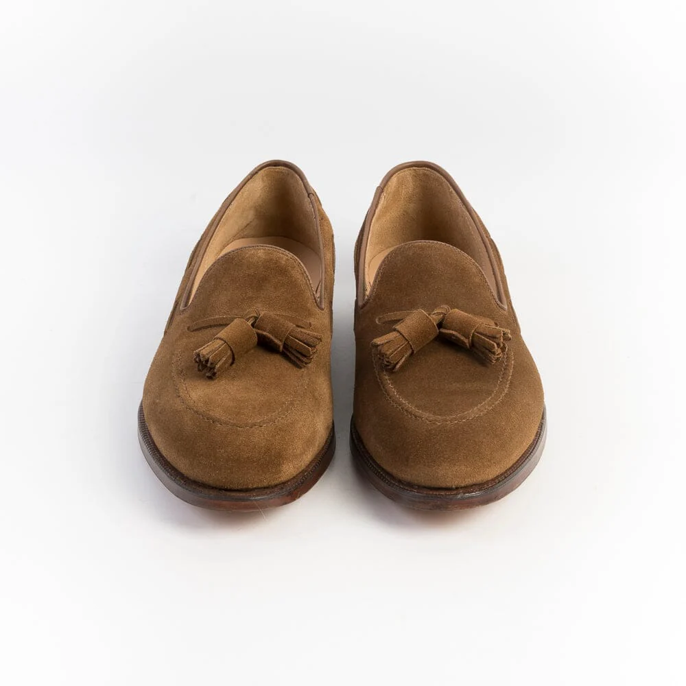 Mocassino con nappine di Crocket & Jones, realizzato in camoscio di colore tabacco. Sottopiede in pelle ed interno foderato. Suola in cuoio con cucitura Goodyear; tacco 2 cm.