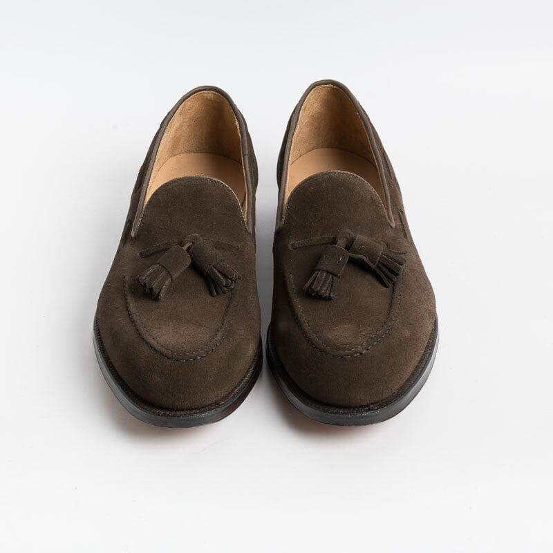 Mocassino con nappine di Crocket & Jones, realizzato in camoscio di colore testa di moro. Sottopiede in pelle ed interno foderato. Suola in cuoio con cucitura Goodyear; tacco con inserto in gomma.