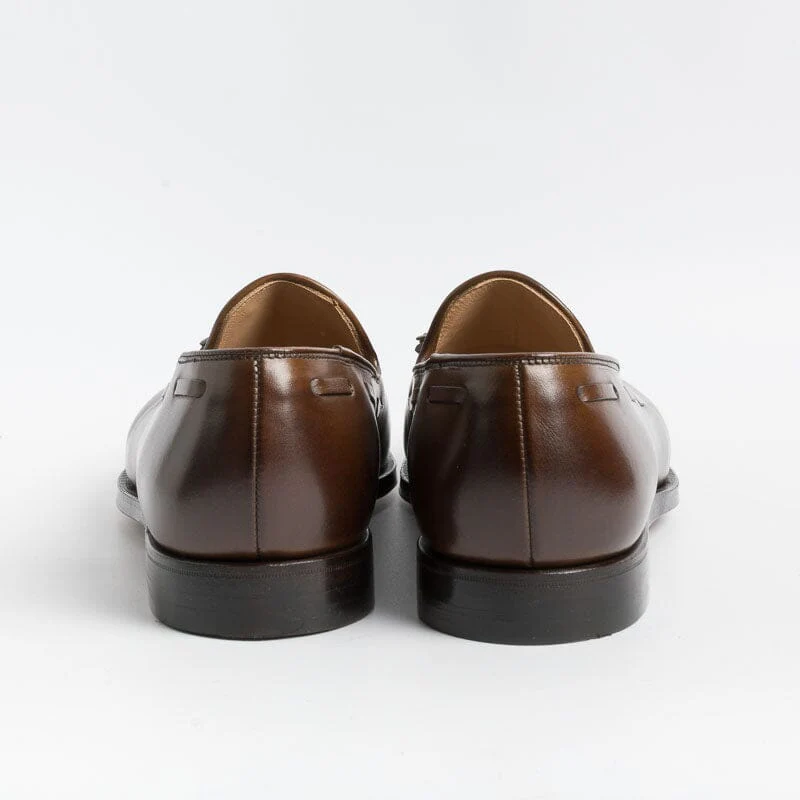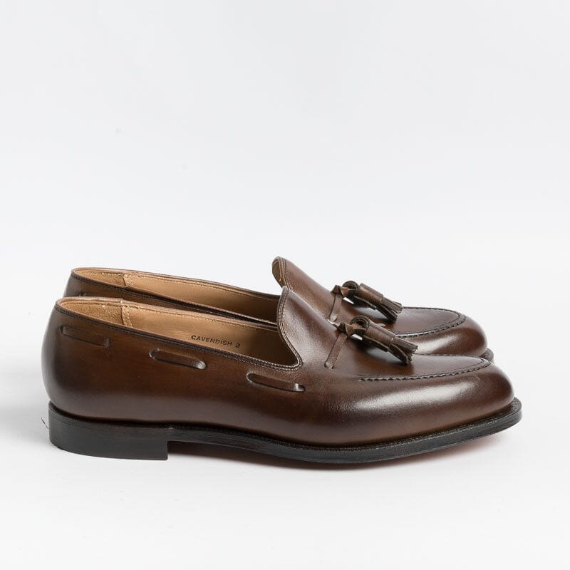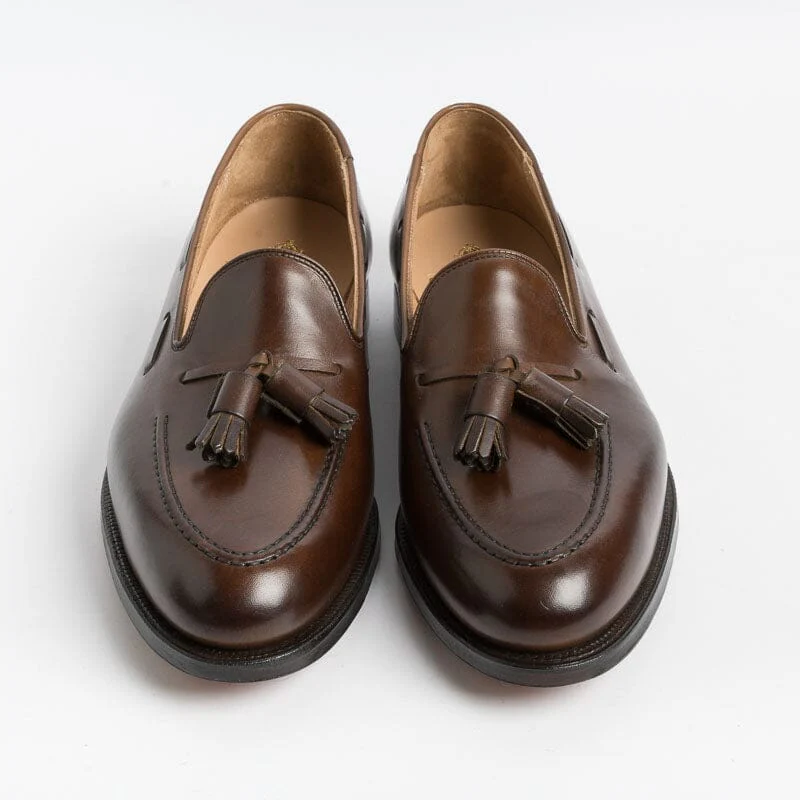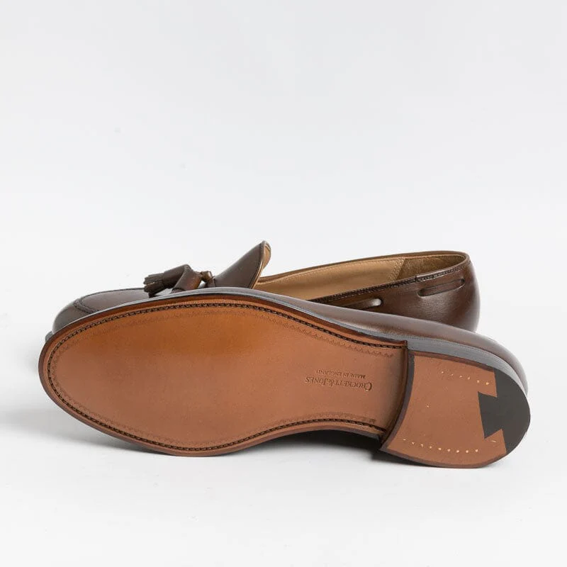 Mocassino con nappine di Crocket & Jones, realizzato in pelle di colore testa di moro. Sottopiede in pelle ed interno foderato. Suola in cuoio con cucitura Goodyear; tacco con inserto in gomma.