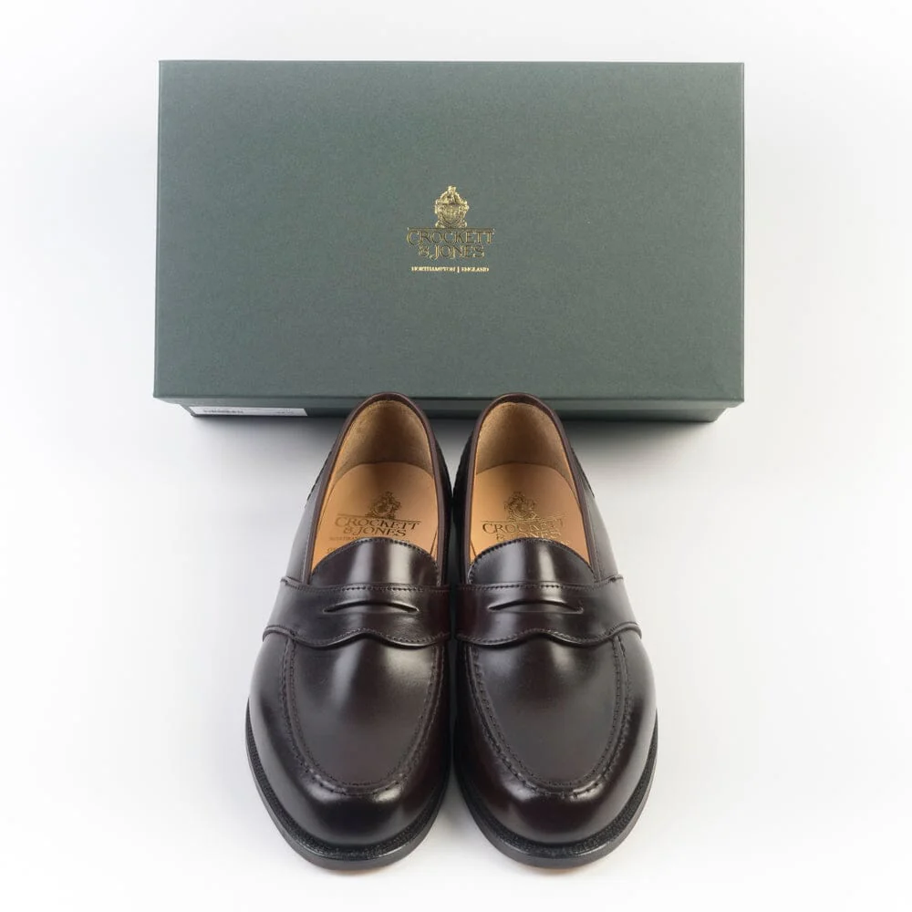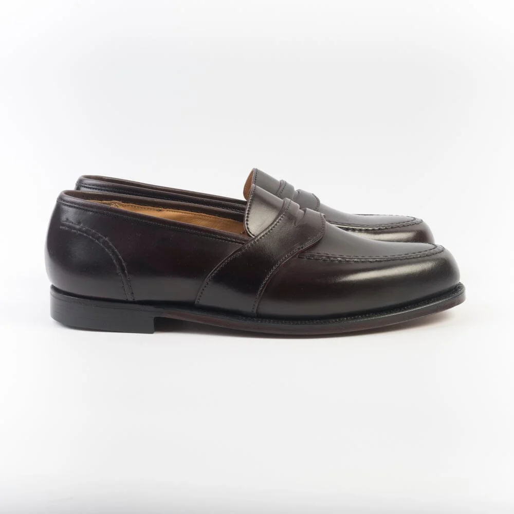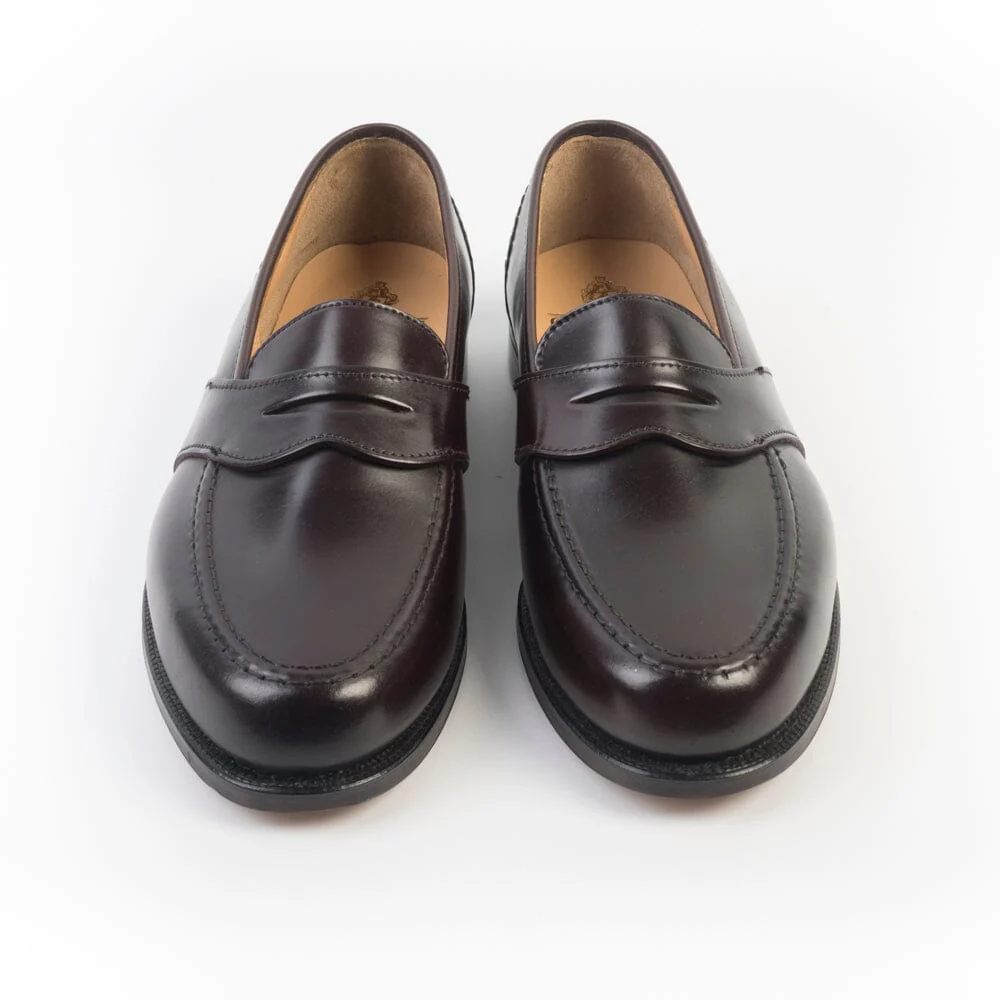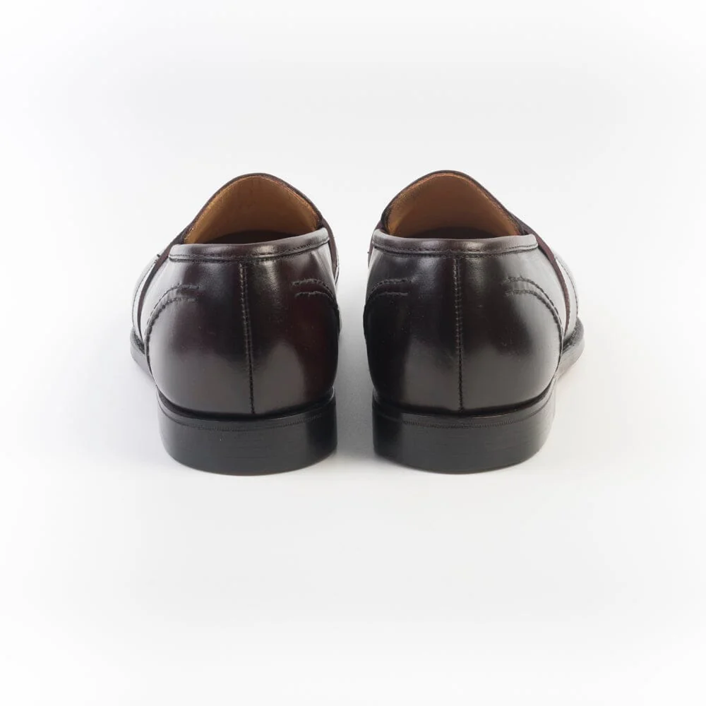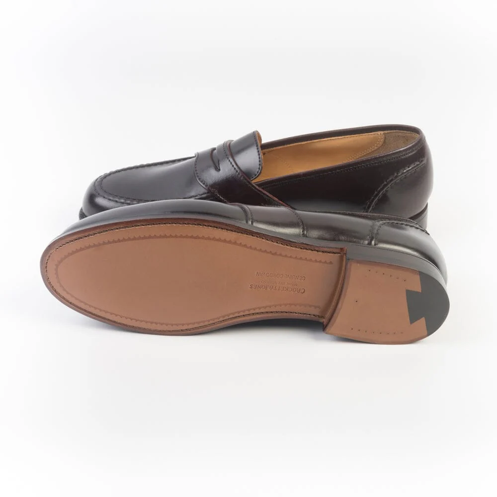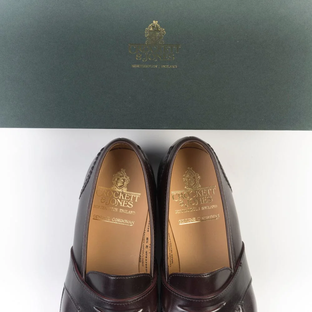 Mocassino con mascherina Full Strap di Crocket & Jones, realizzato in pregiato cordovan shell bordeaux di Horween. Interno foderato e sottopiede in pelle. Suola in cuoio cucita e tacco con inserto in gomma.