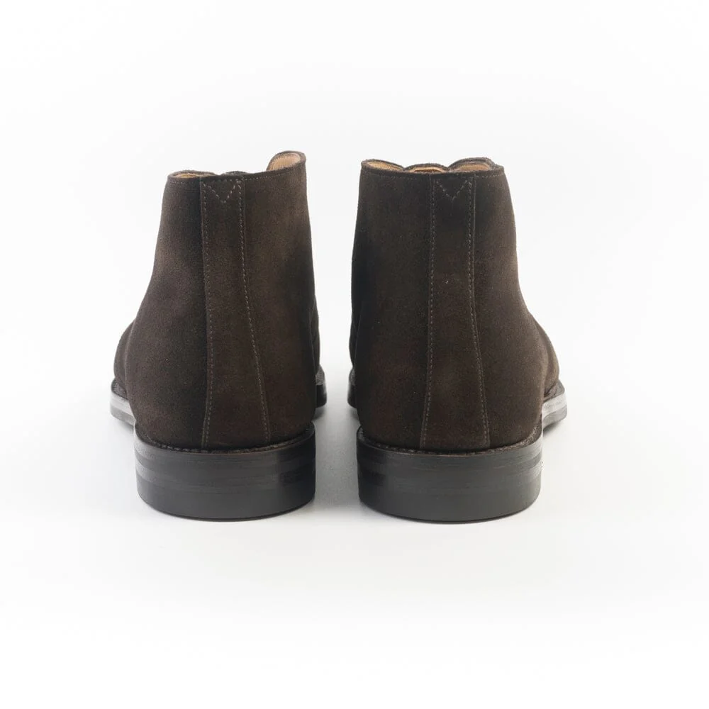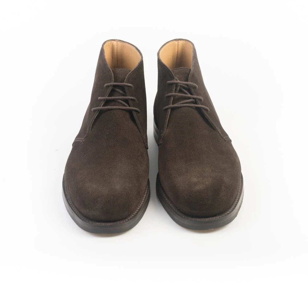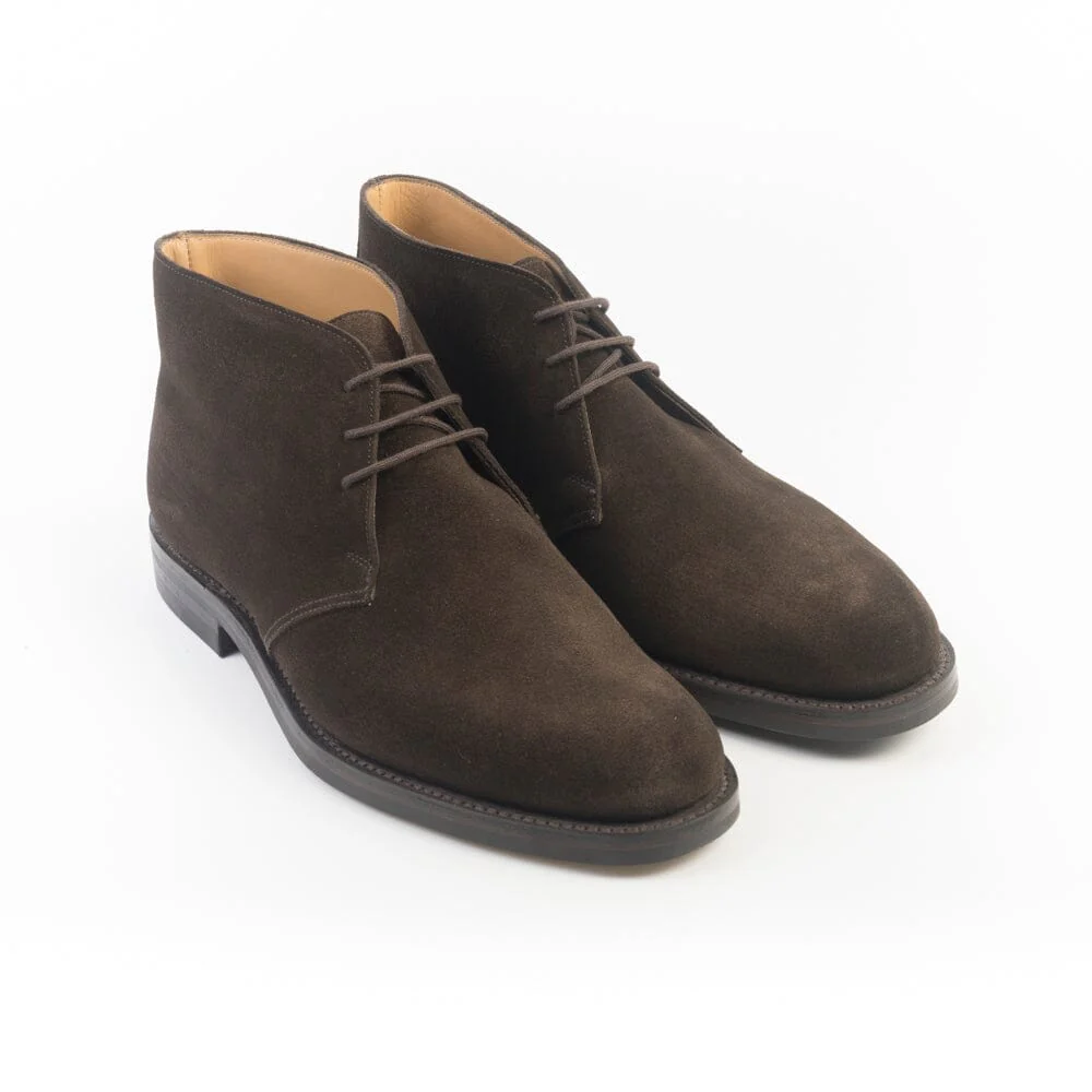 Polacco tre fori di Crockett & Jones, realizzato in camoscio trattato idrorepellente di colore testa di moro. Punta affusolata, sottopiede in pelle ed interno foderato in pelle. Suola in gomma Dainite con cucitura Goodyear; tacco con inserto in gomma.