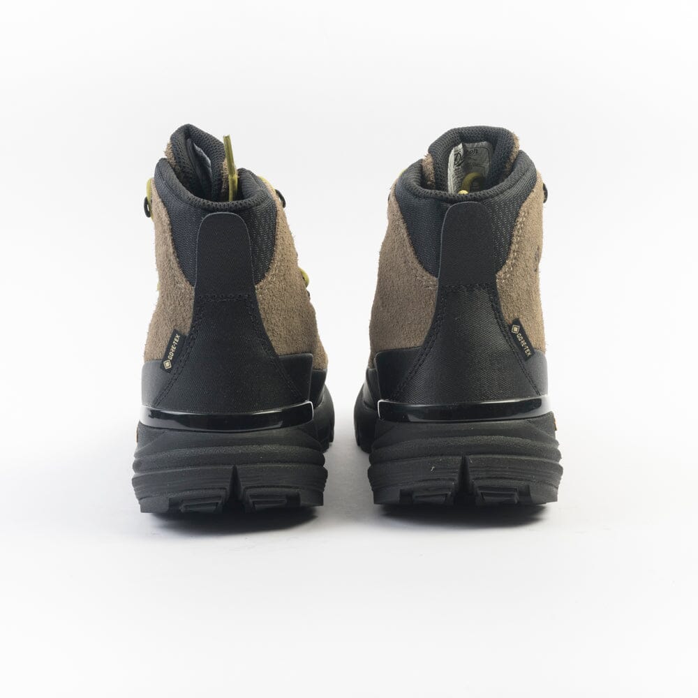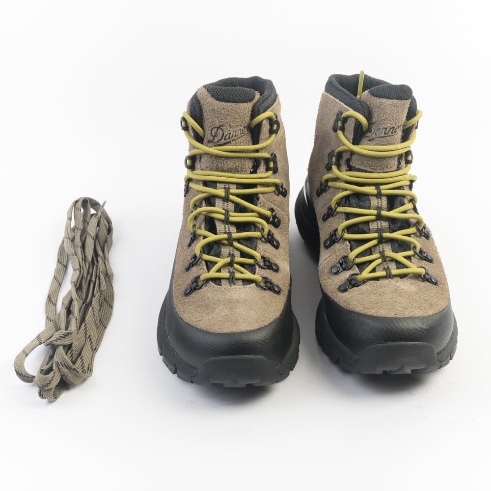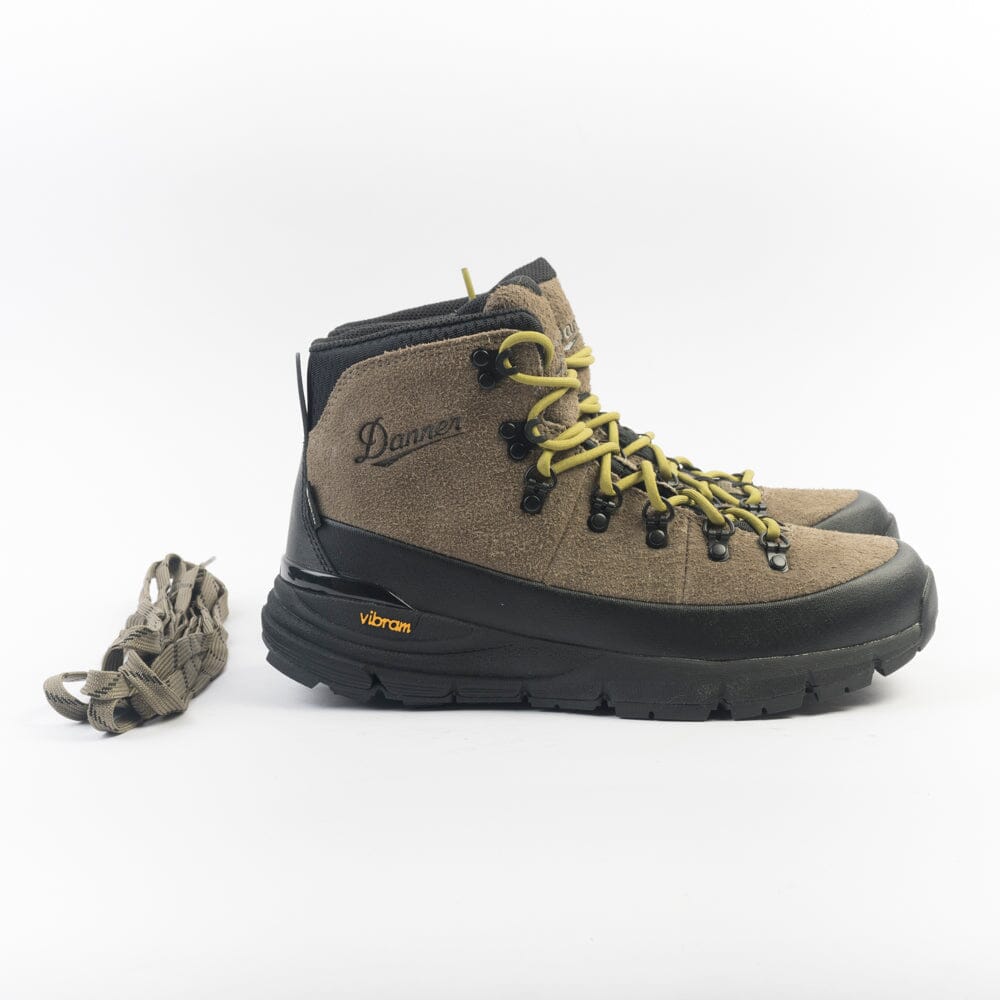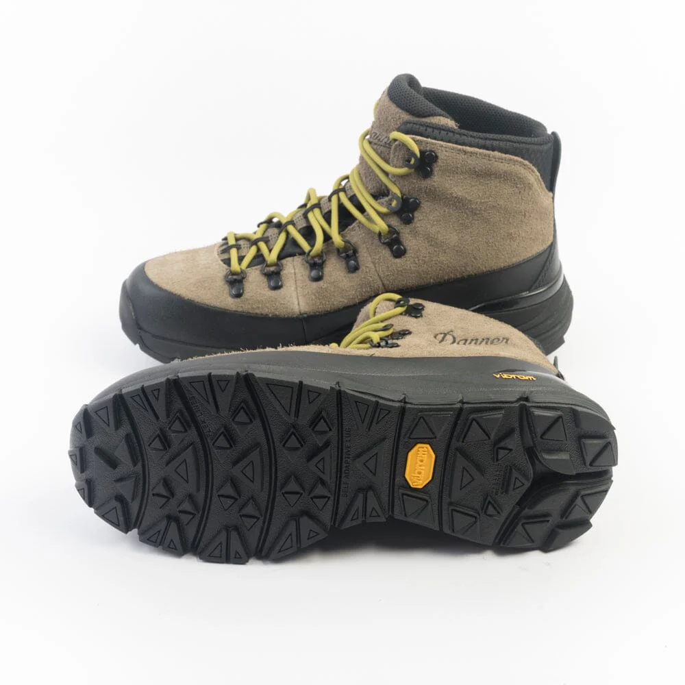 Scarponcini Danner realizzati con tecnologia GORE-TEX impermeabile e camoscio di colore verde militare. Dettagli in gomma nera sul puntale e tallone per proteggere dagli urti. Allacciatura con anelli a D e ganci, morbidi lacci in cotone di colore verde acido, più lacci piatti di colore verde militare. Suola in VIBRAM® con mega-grip e soletto Ortholite.