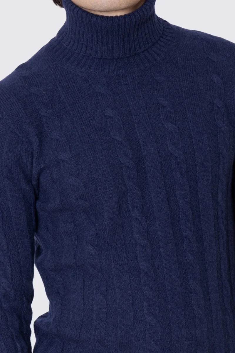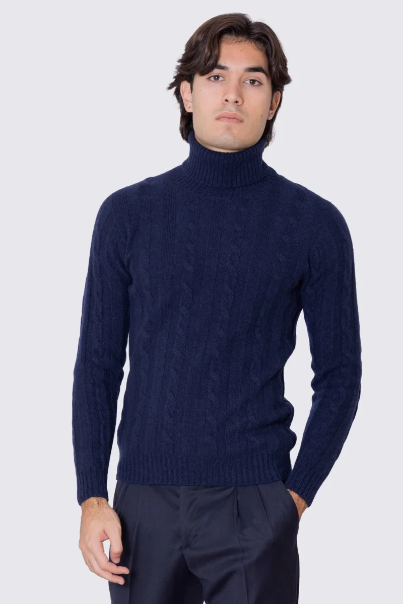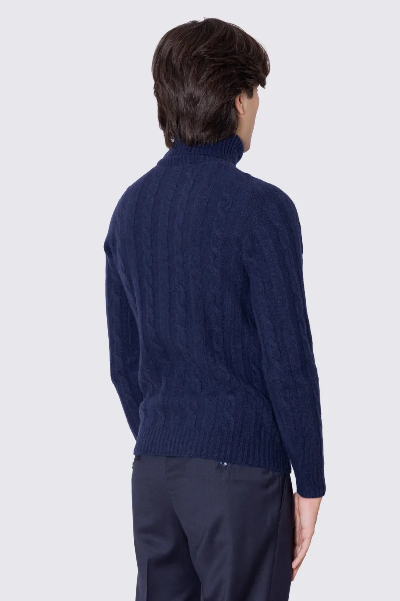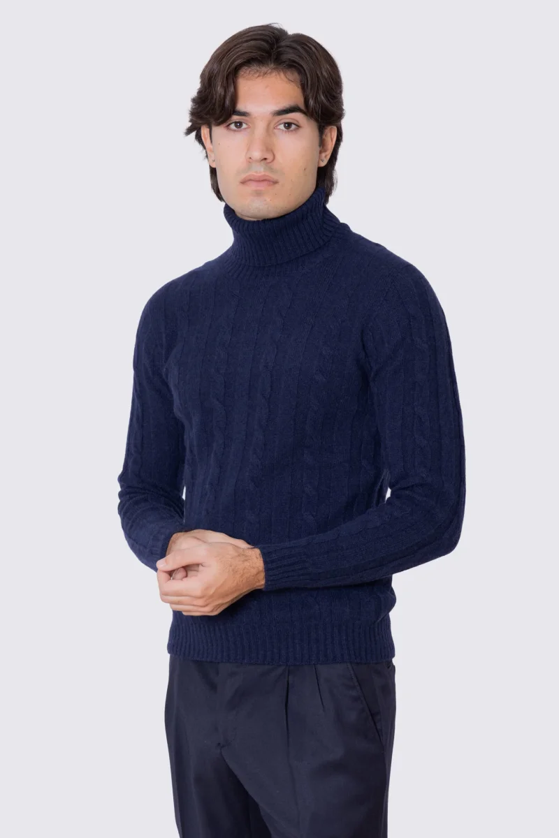 Dolcevita Blu in lana grossa e cashmere con treccia costruzione tubolare senza cuciture rifinito a mano Finezza 7