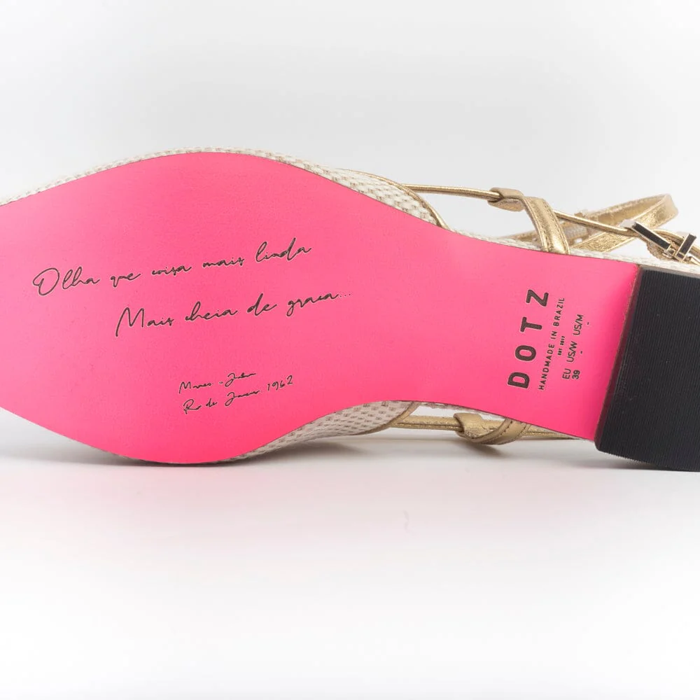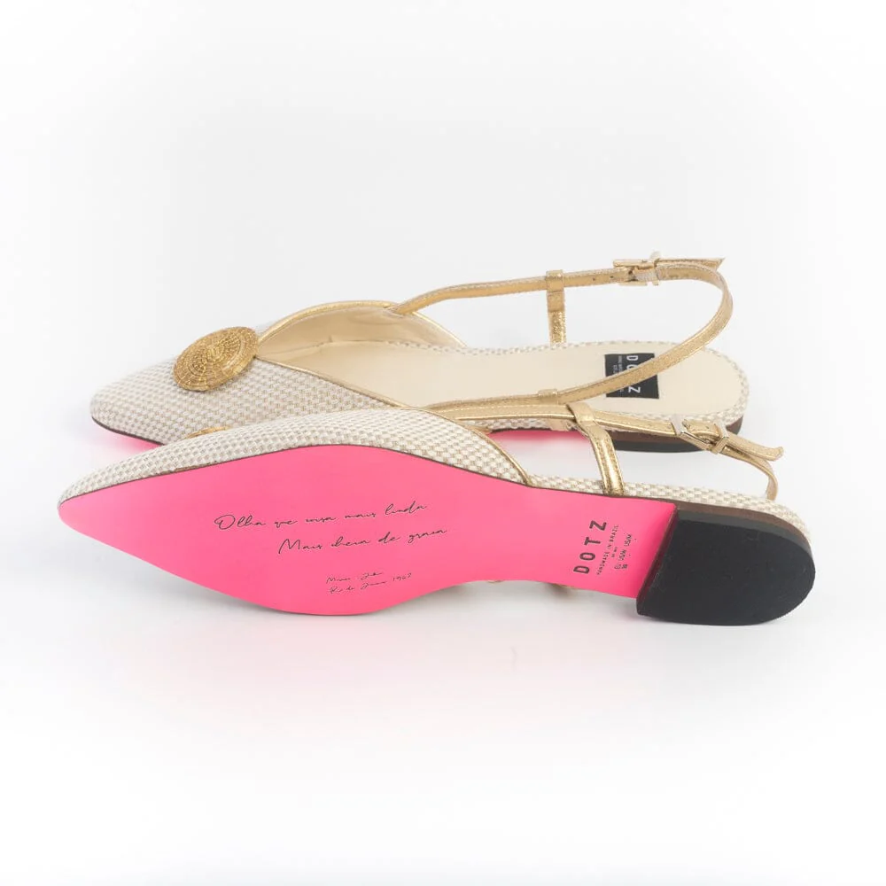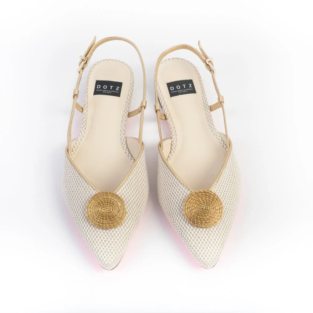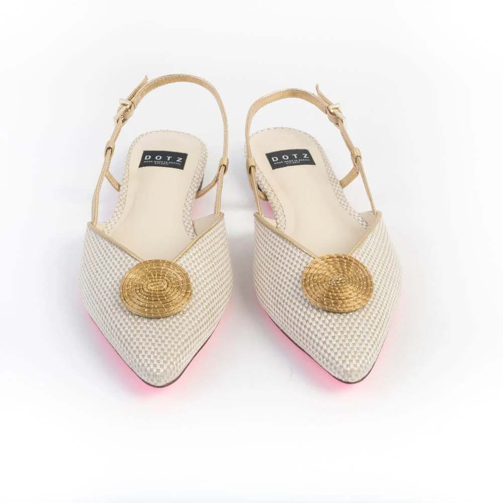 Sling Back a punta affusolata di DOTZ realizzate in pregiato tessuto di colore avorio e profili oro. Decorazione in rafia ad anello sulla punta di colore oro . Cinturino regolabile alla caviglia in pelle di colore bronzo. Sottopiede in pelle, suola in cuoio ecologico di colore fucsia con particolarità di dedica distintiva del brand , tacco di altezza 1 cm circa.