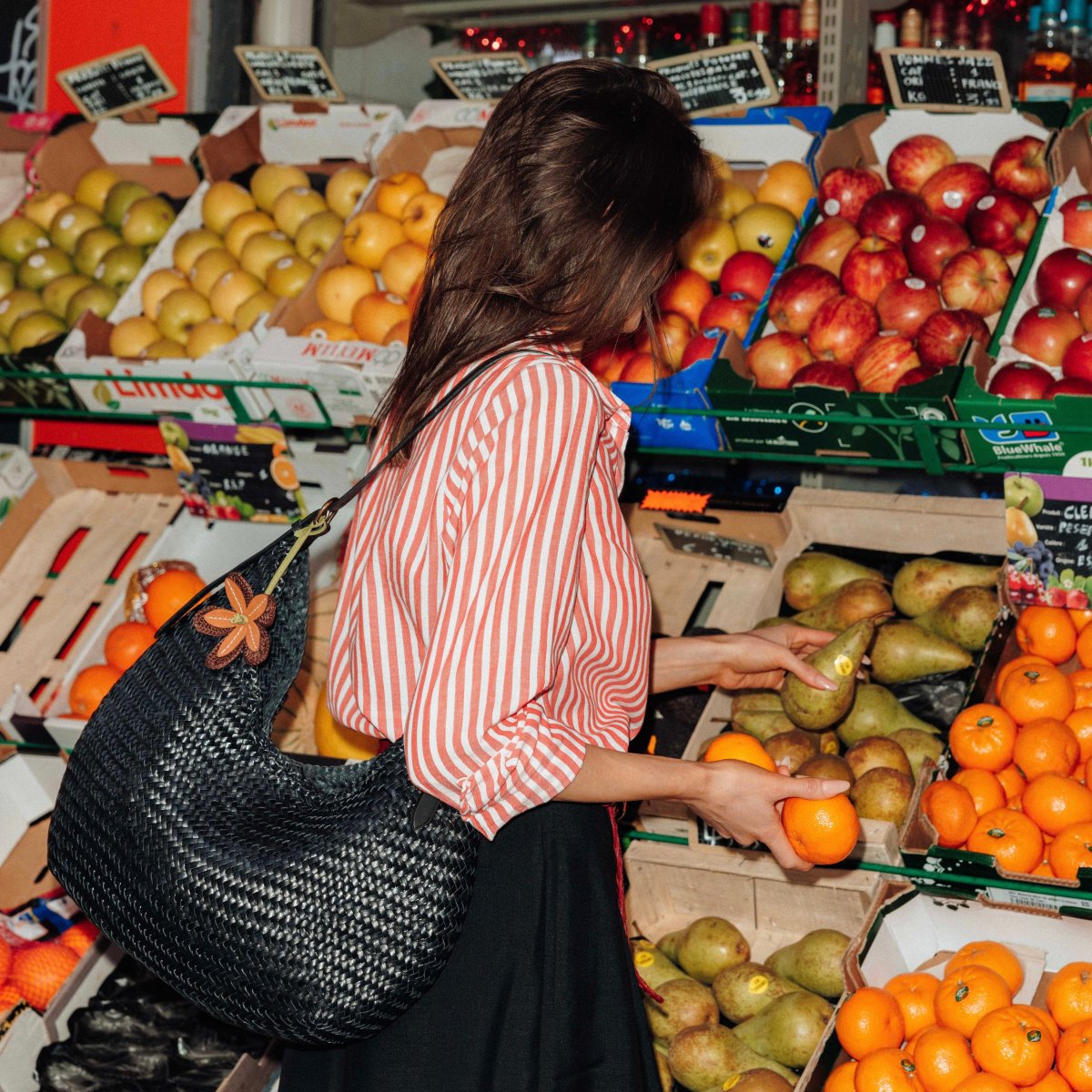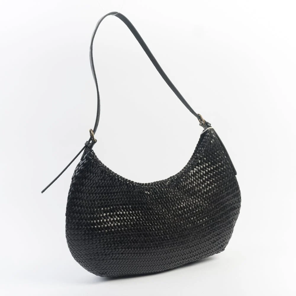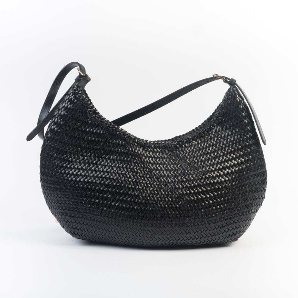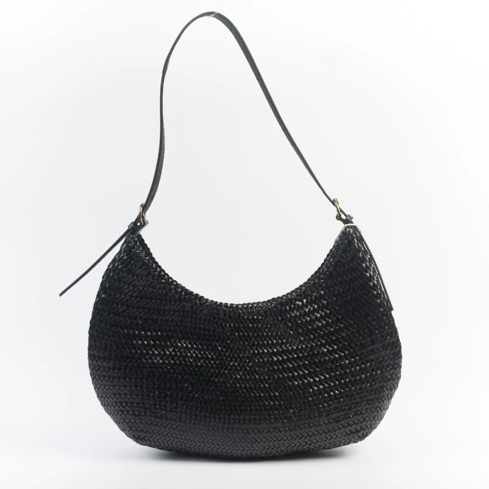 Borsa a spalla di Dragon intrecciata, tinta con metodi naturali nel colore nero. Interno sfoderato. Chiusura con bottone a pressione. Tracolla regolabile.